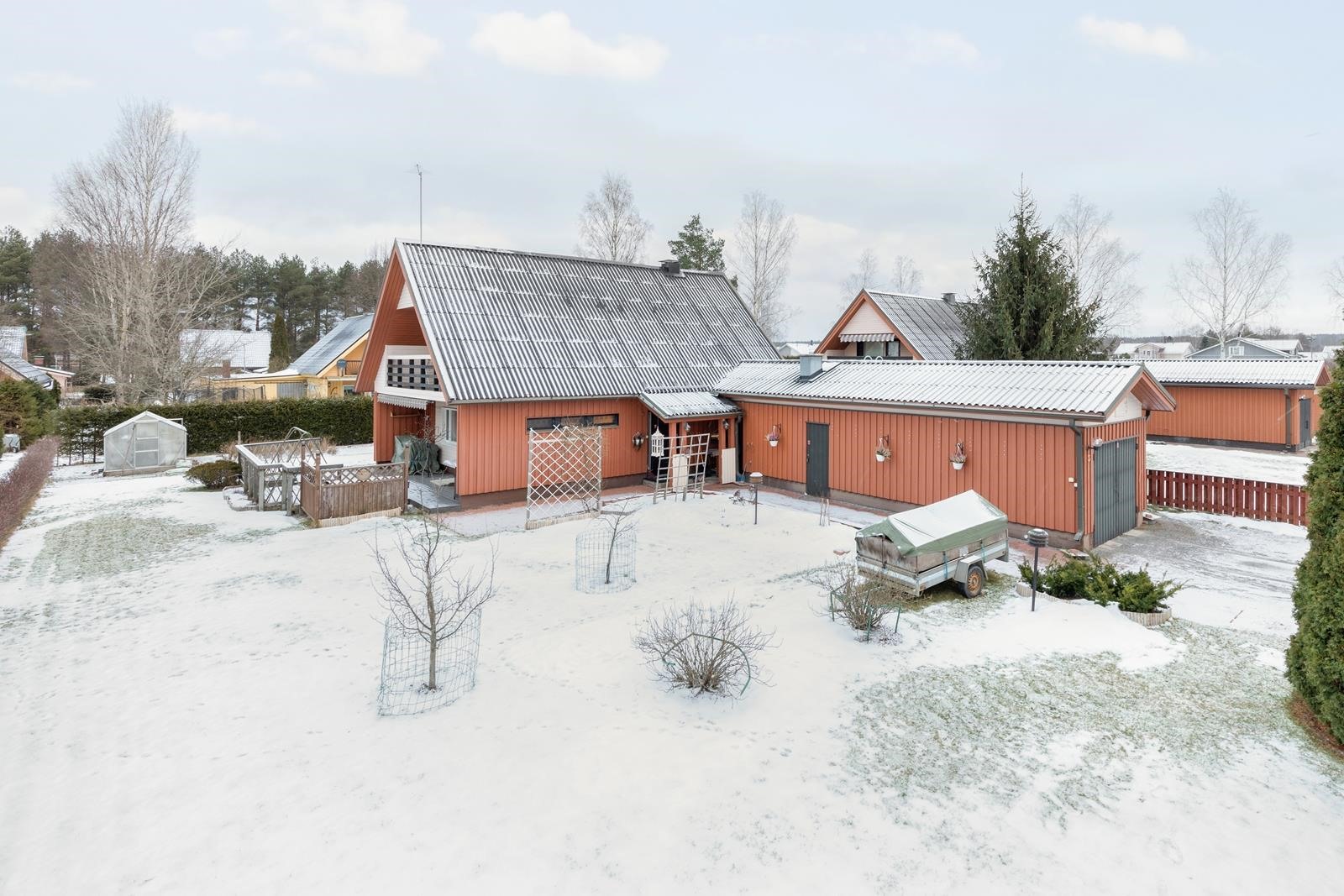Oma autotalli ja pihavaja/varasto sekä viehättävä pieni kasvihuone, joka innostaa puutarhanhoitoon. Tämä koti tarjoaa täydellisen mahdollisuuden luoda omannäköinen unelma-asunto.