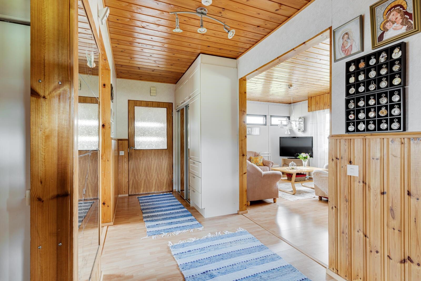 Sauna: laatta, paneeli. Kylpyhuone: laatta. Lattiat: laminaatti, korkki. Seinät: tapetti, maalattu.