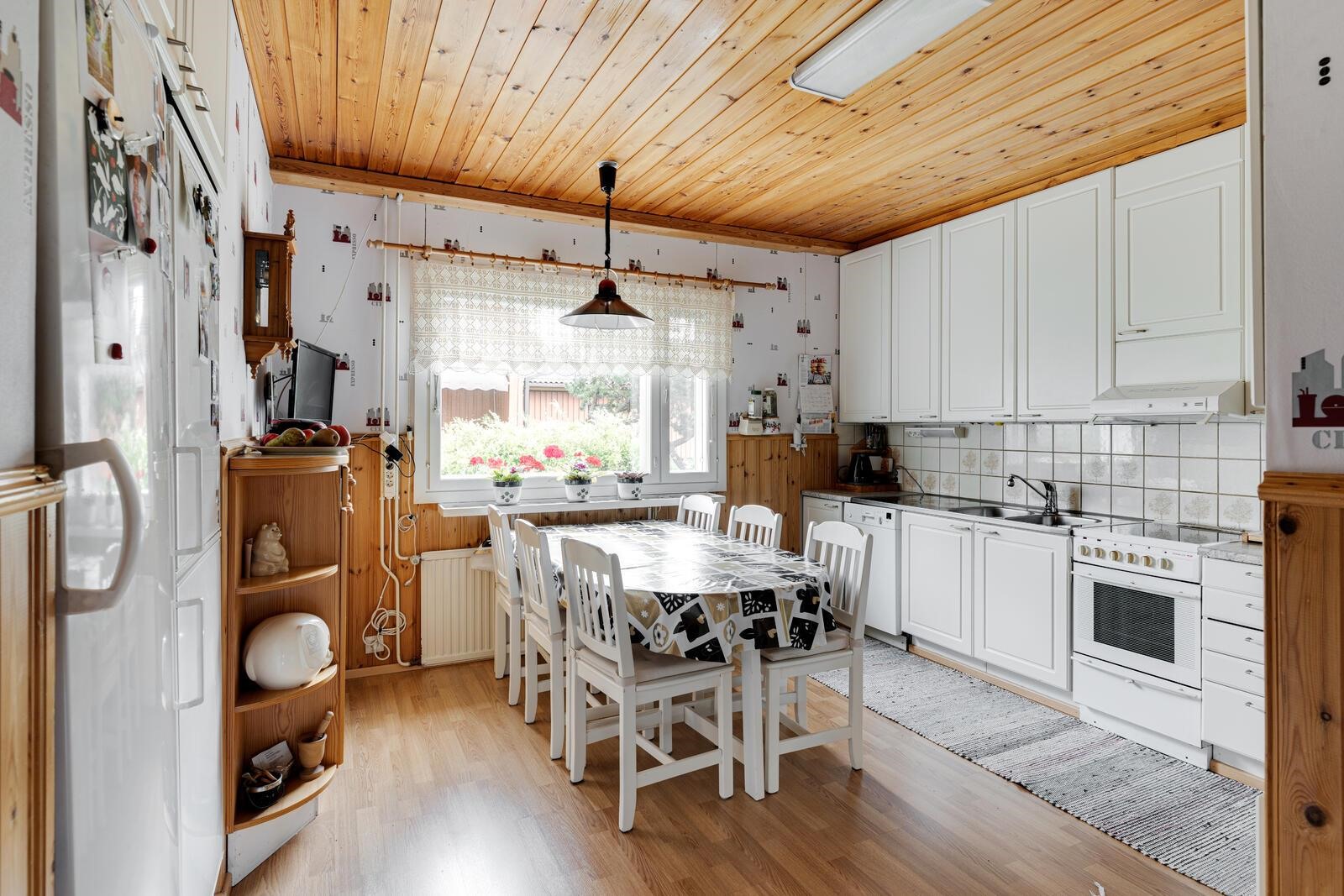 - Jääkaappi, pakastekaappi, keraaminen liesi, astianpesukone, kaapistot ovet uusittu 2004, Elega.