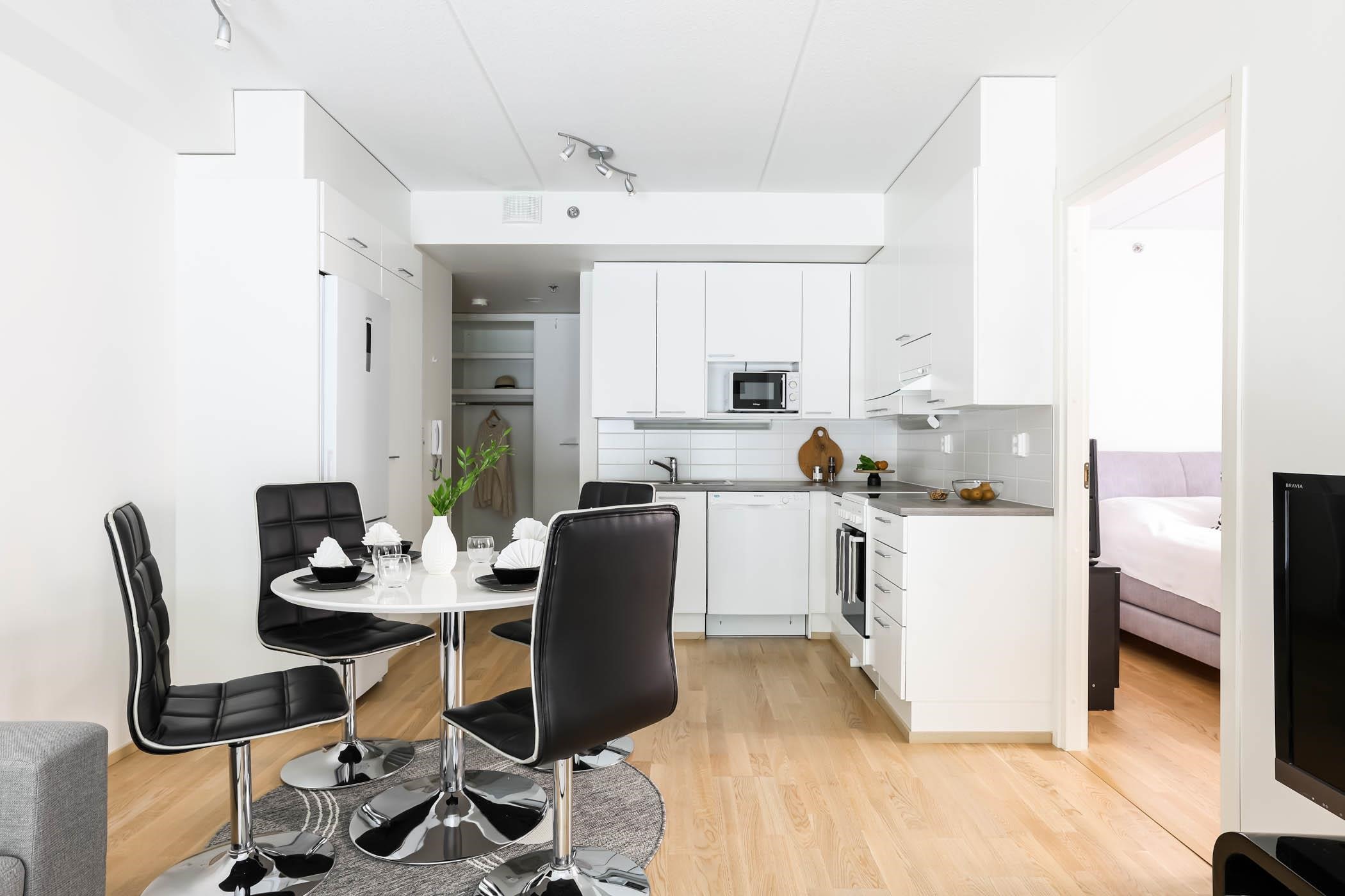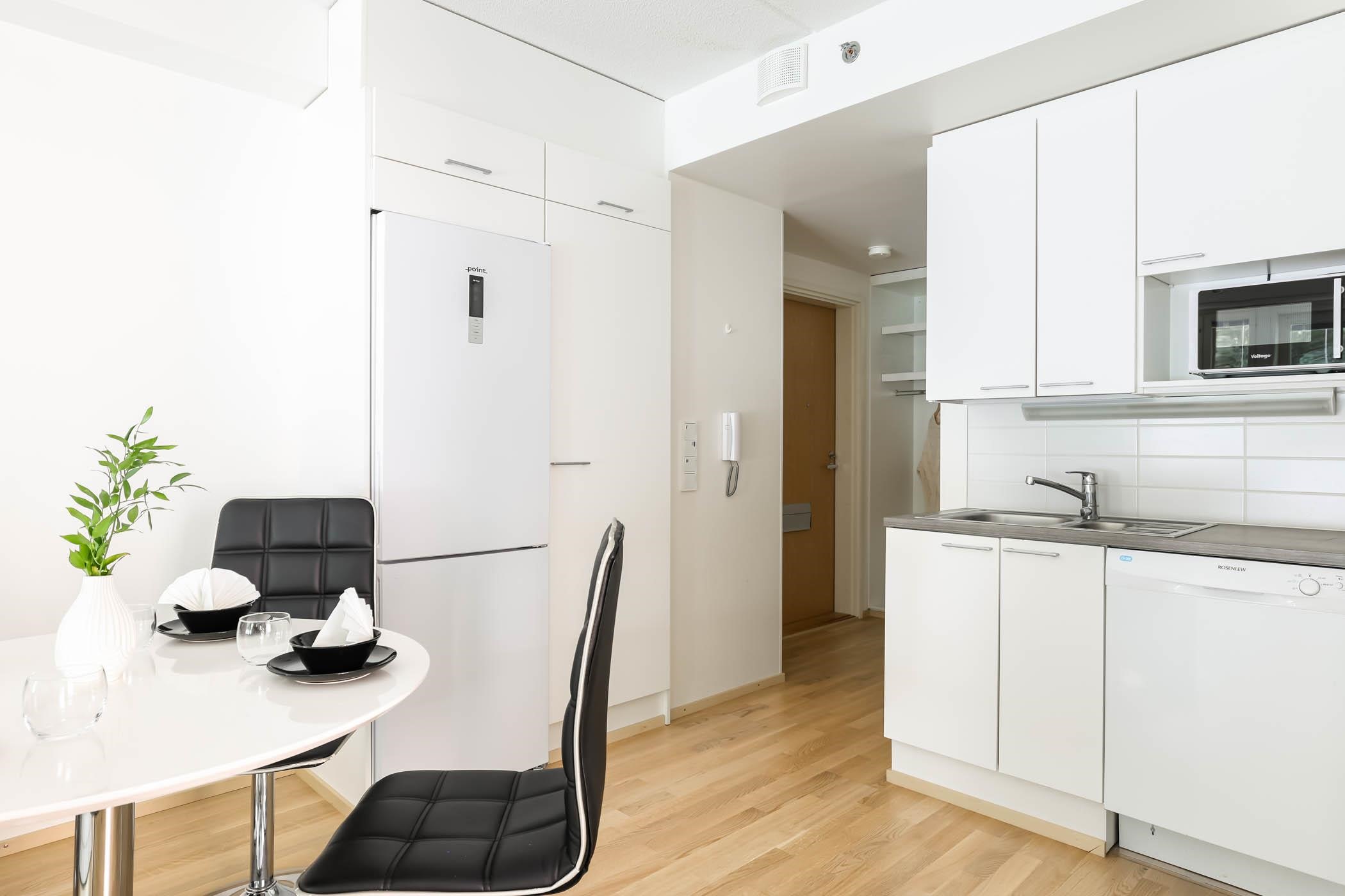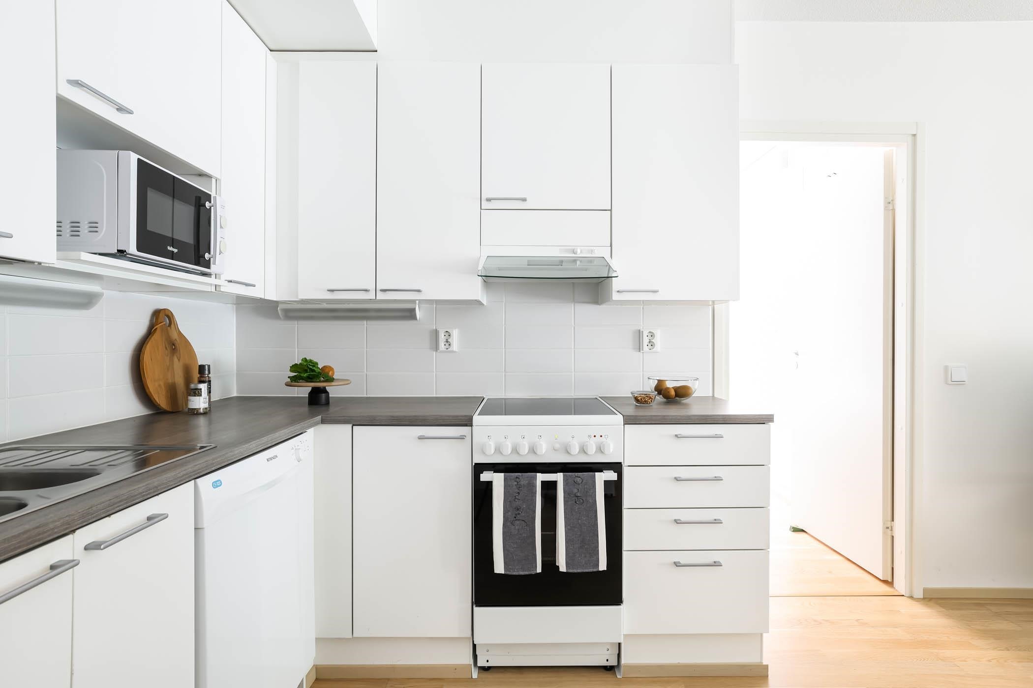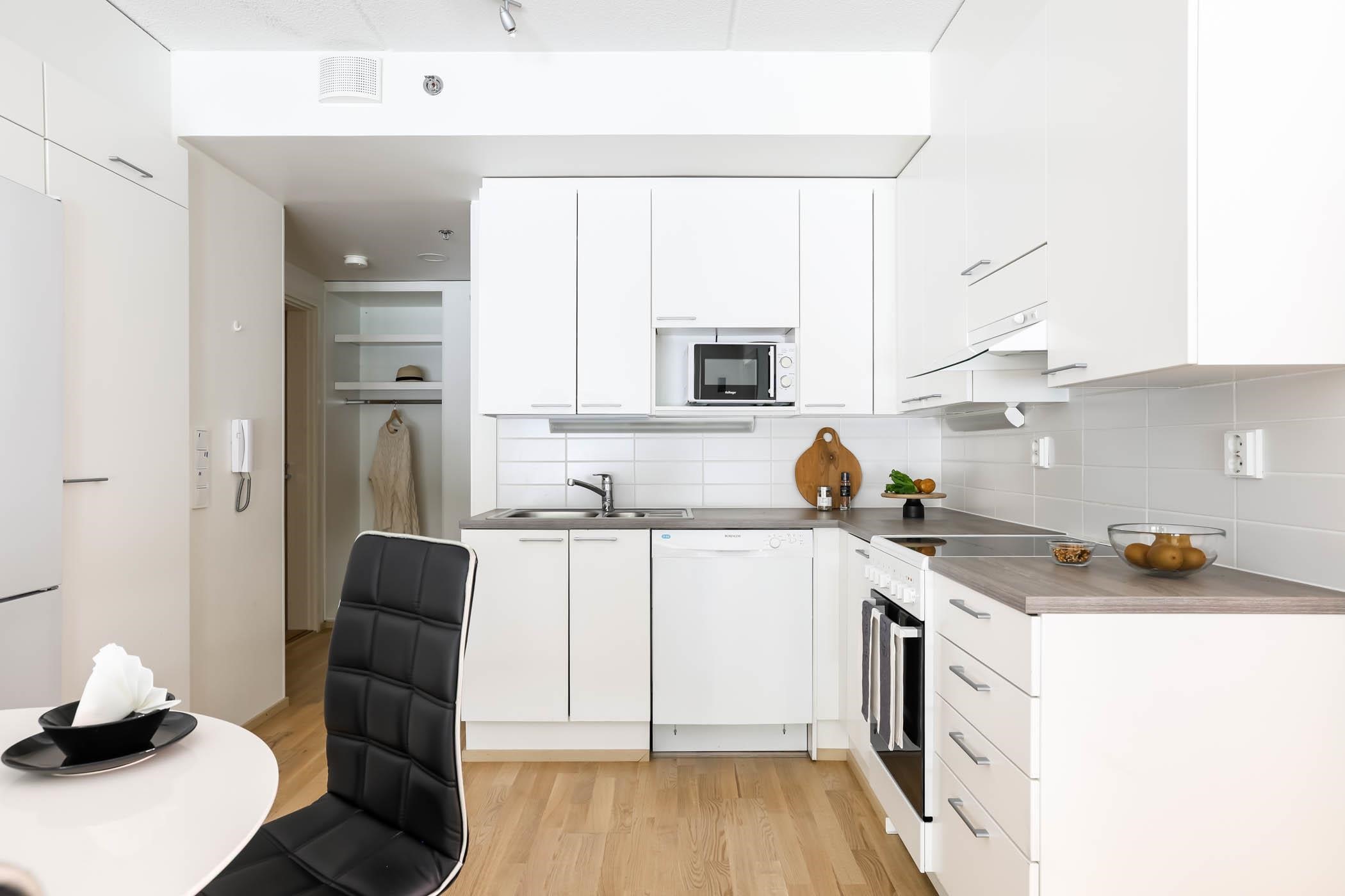 - Jääkaappipakastin Point-merkkinen 7 vuoden takuu (vuoden vanha), keraaminen liesi, liesituuletin, astianpesukone, kaapistot, kiinteät valaisimet.