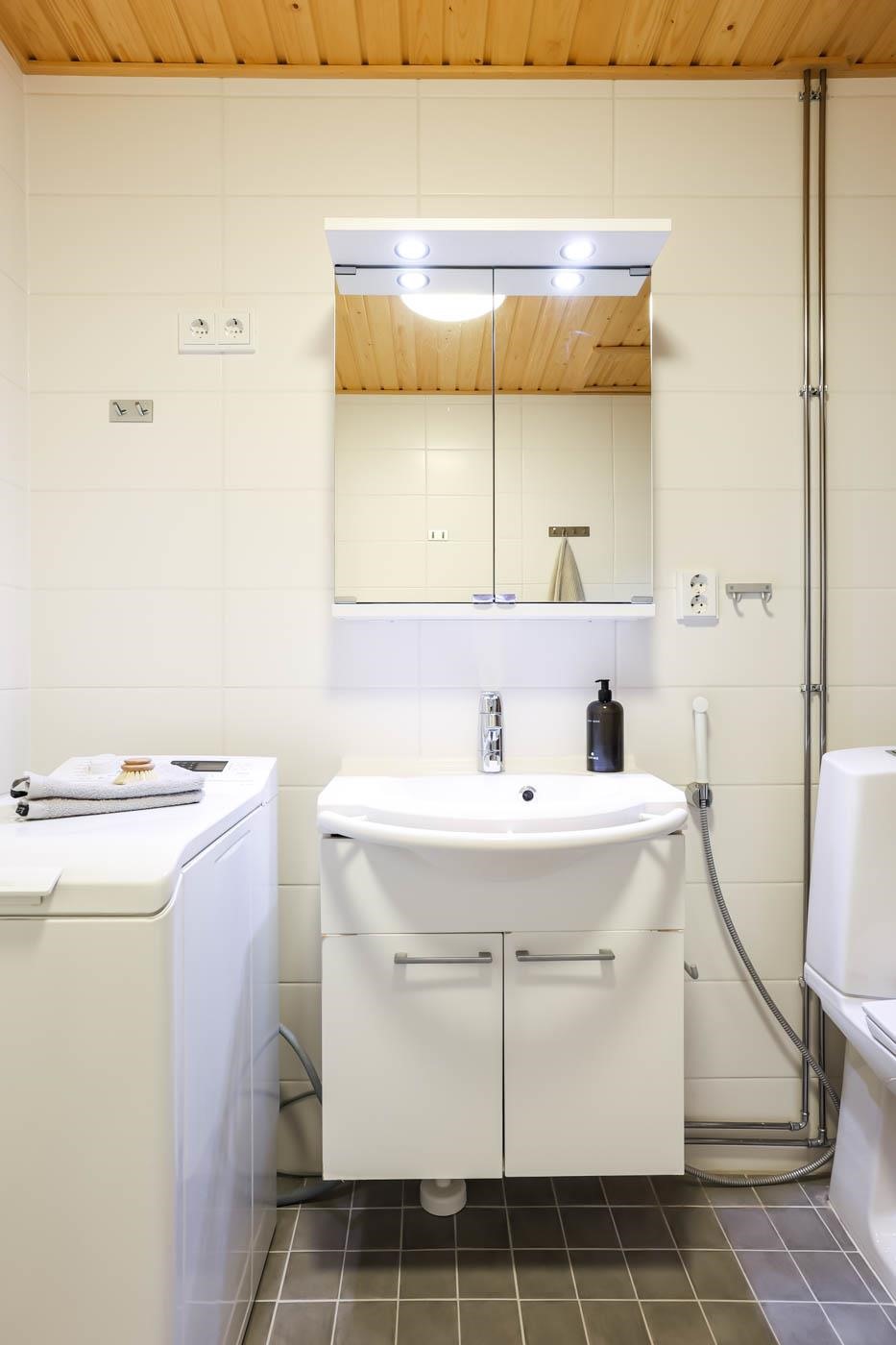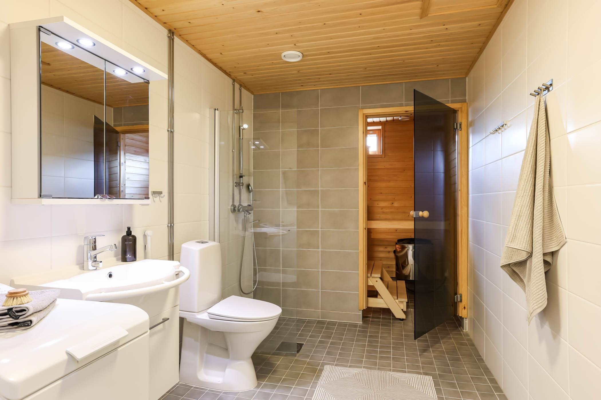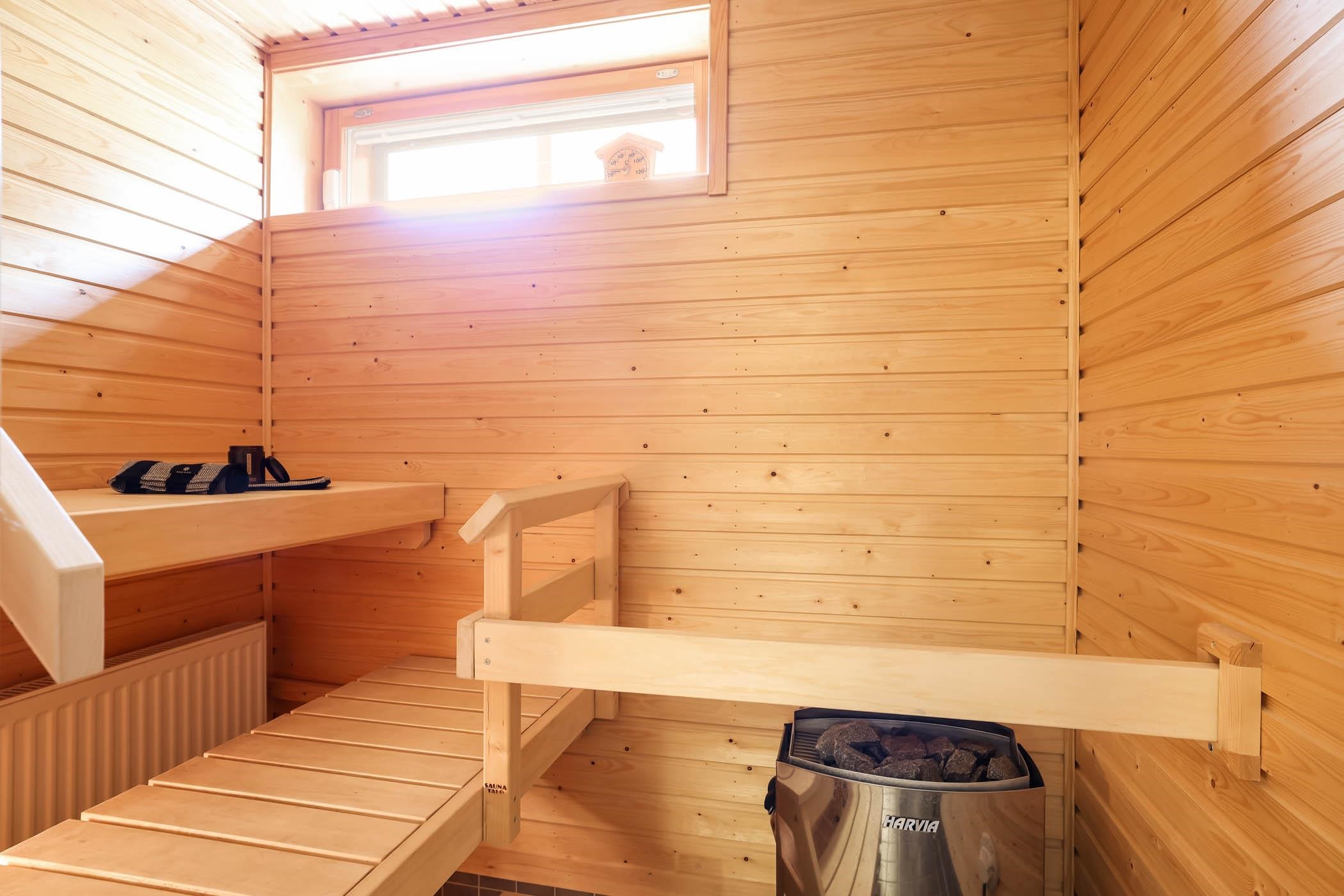 - Sauna: ikkuna, sähkökiuas, Pesuhuone: suihku, suihkuseinä, peilikaappi, allaskaappi, lattialämmitys sekä kiinteät valaisimet.