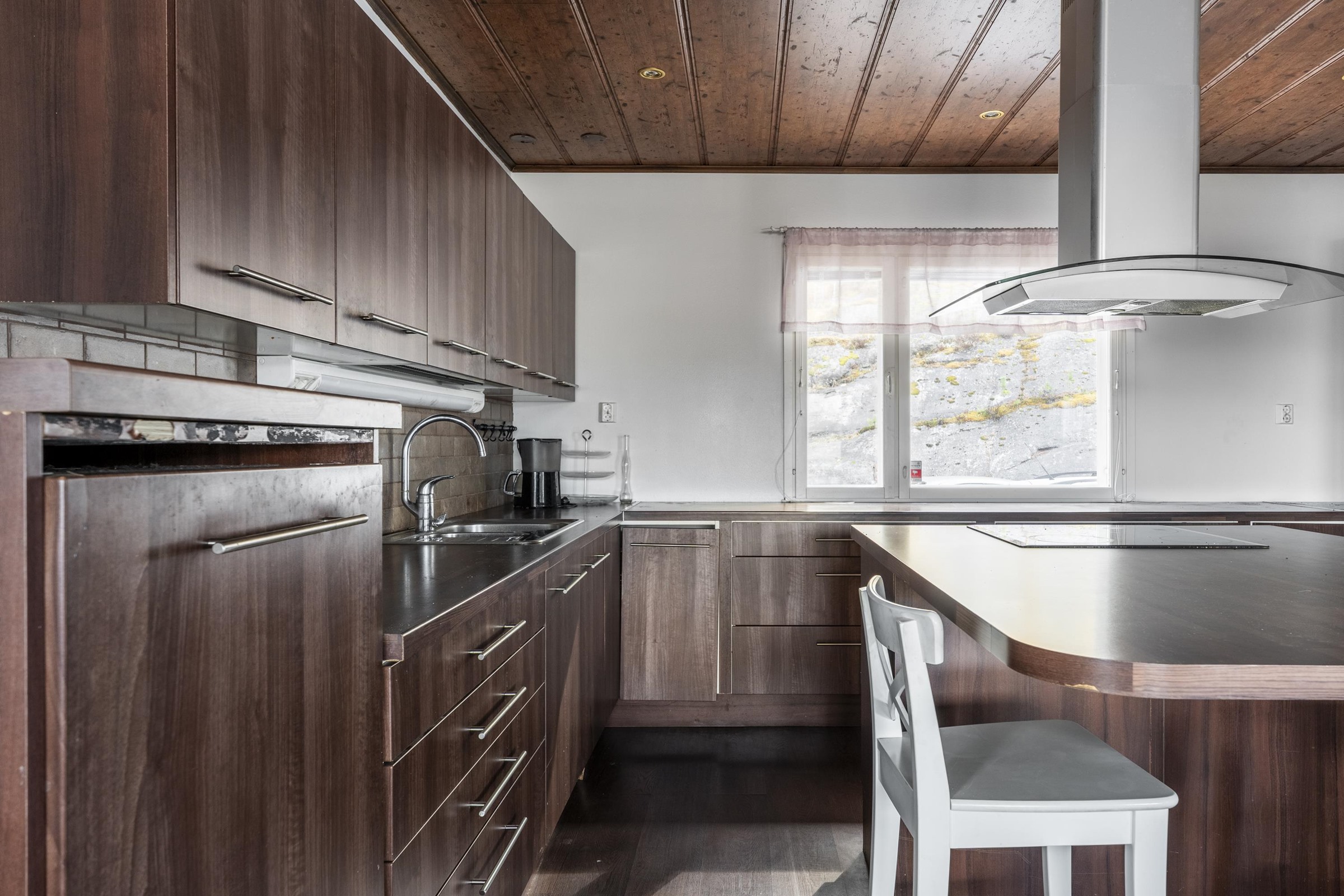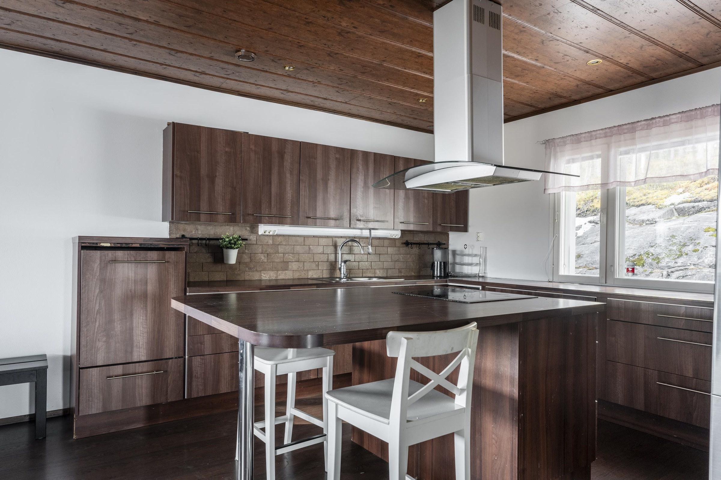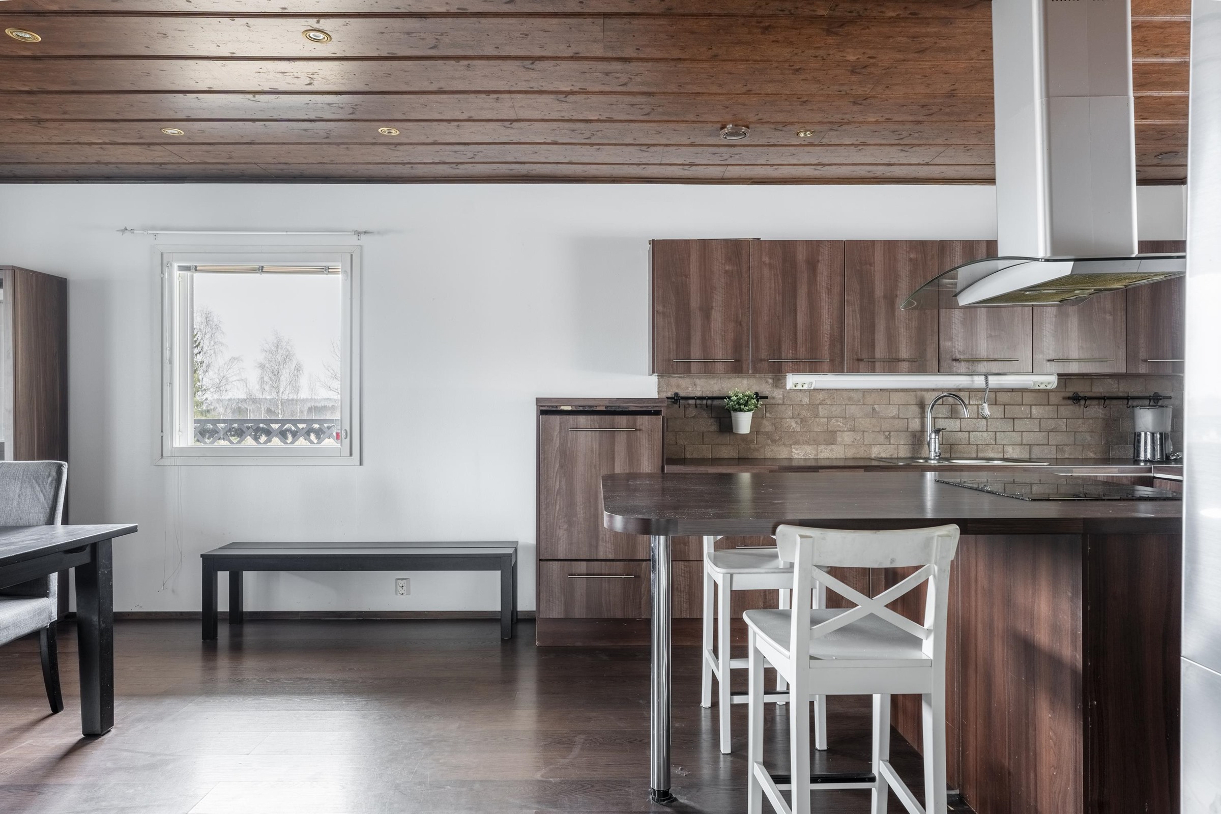 - Jääkaappi, pakastekaappi, erillisuuni, keraaminen liesi, liesituuletin, leivinuuni, mikroaaltouuni, astianpesukone, kaapistot, kiinteät valaisimet, pöytätasojen materiaali laminaatti.