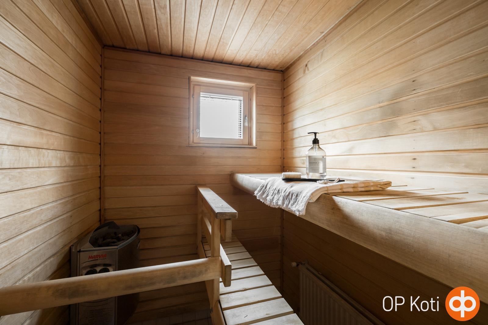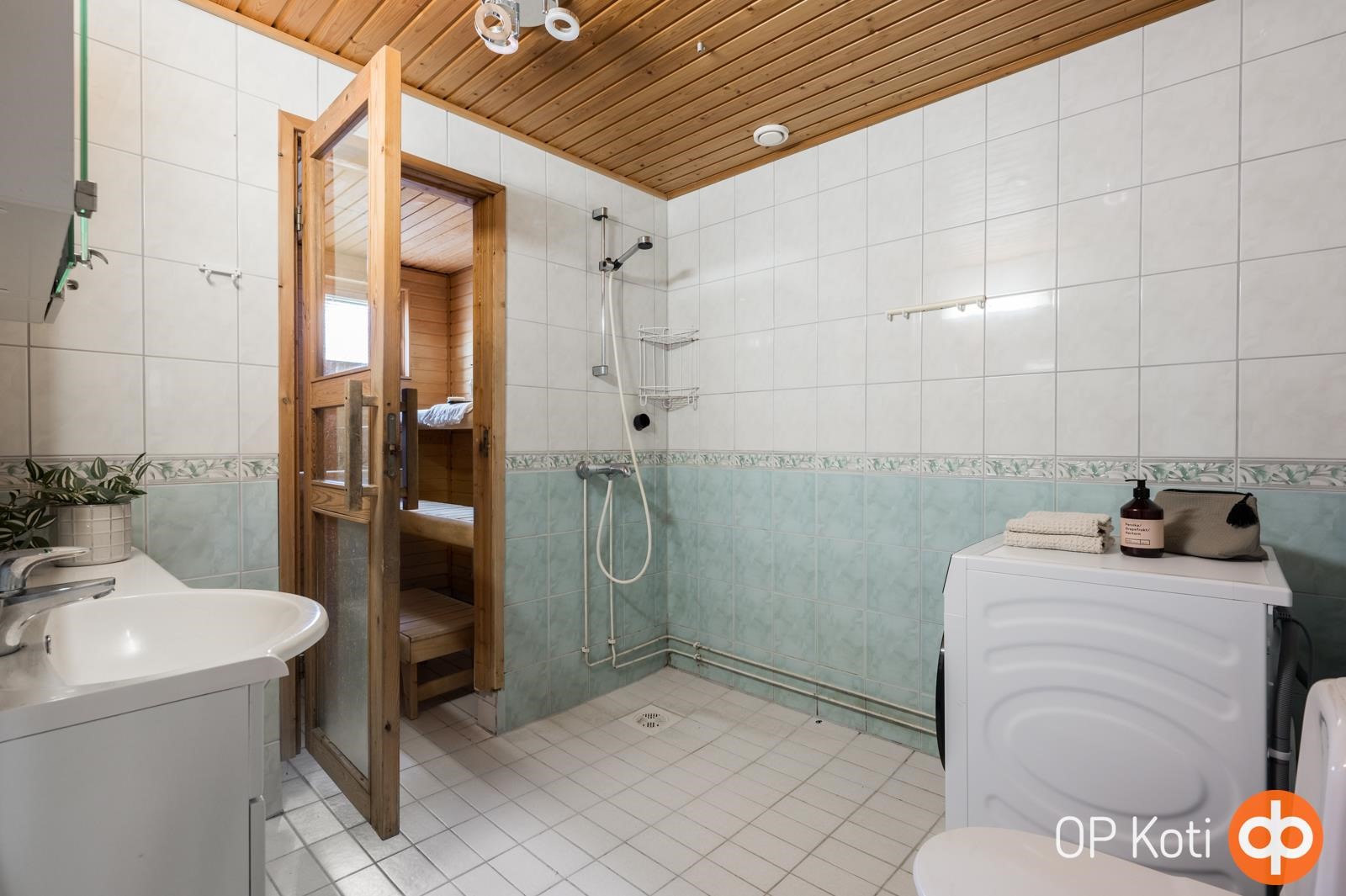 - Sauna, sähkökiuas, kylpyhuone, suihku, peilit, peilikaappi, allaskaappi, pesukoneliitäntä, kiinteät valaisimet.