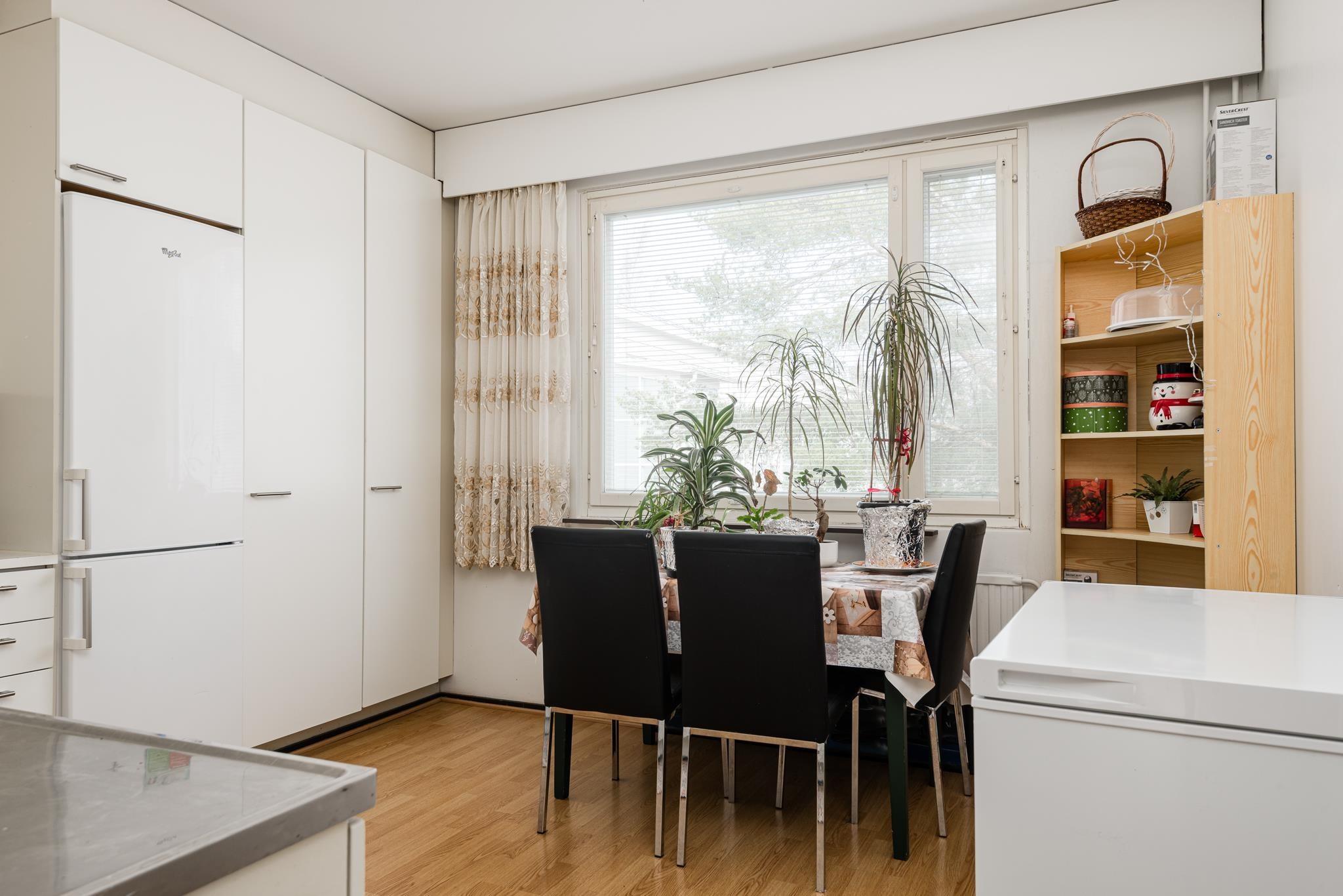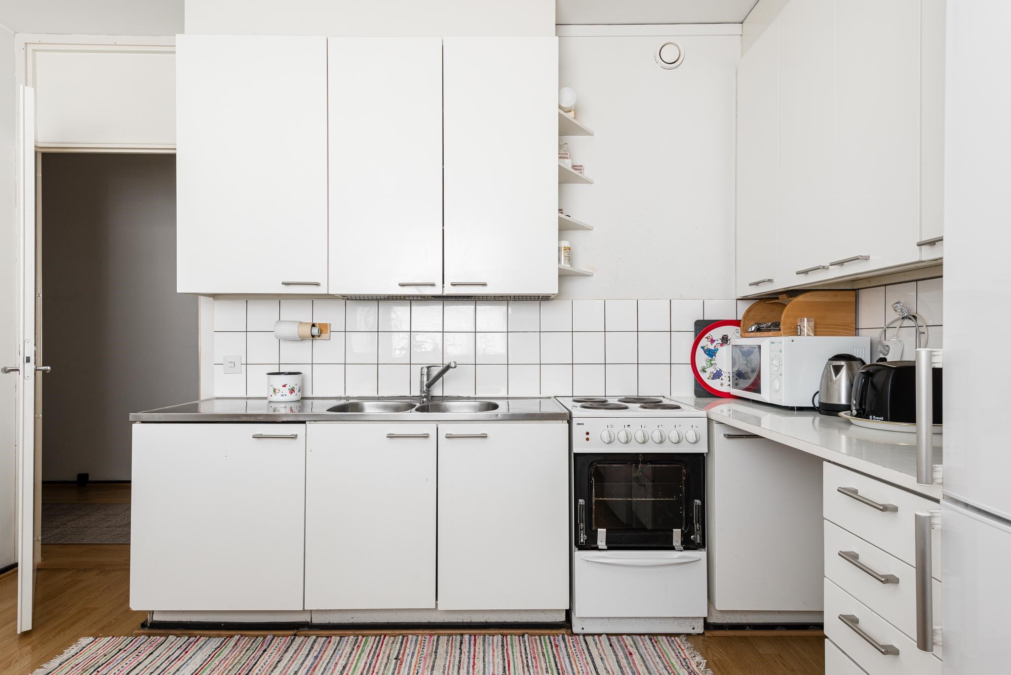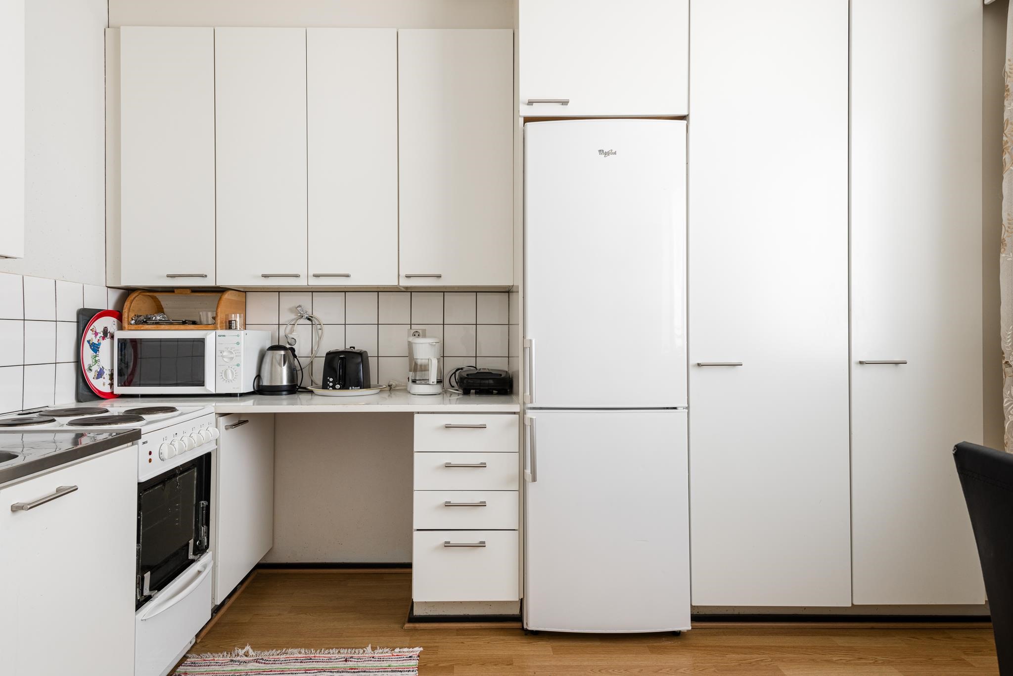 - Jääkaappipakastin, sähköliesi, kaapistot, kiinteät valaisimet.
