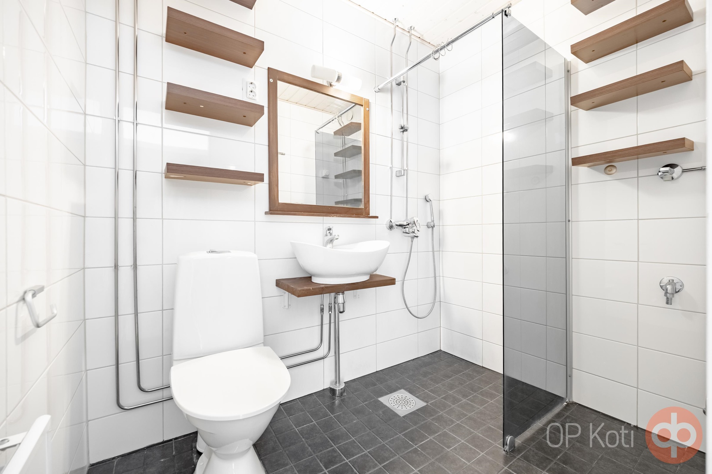 - Kylpyhuone, suihku, peilit, pesukoneliitäntä, kiinteät valaisimet. hyllytasot, puiset