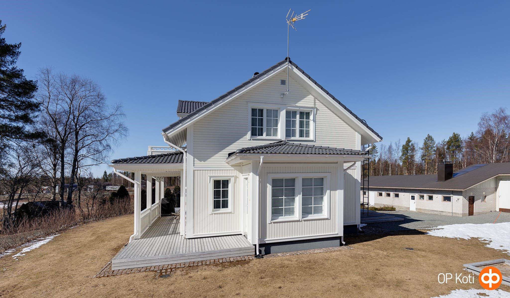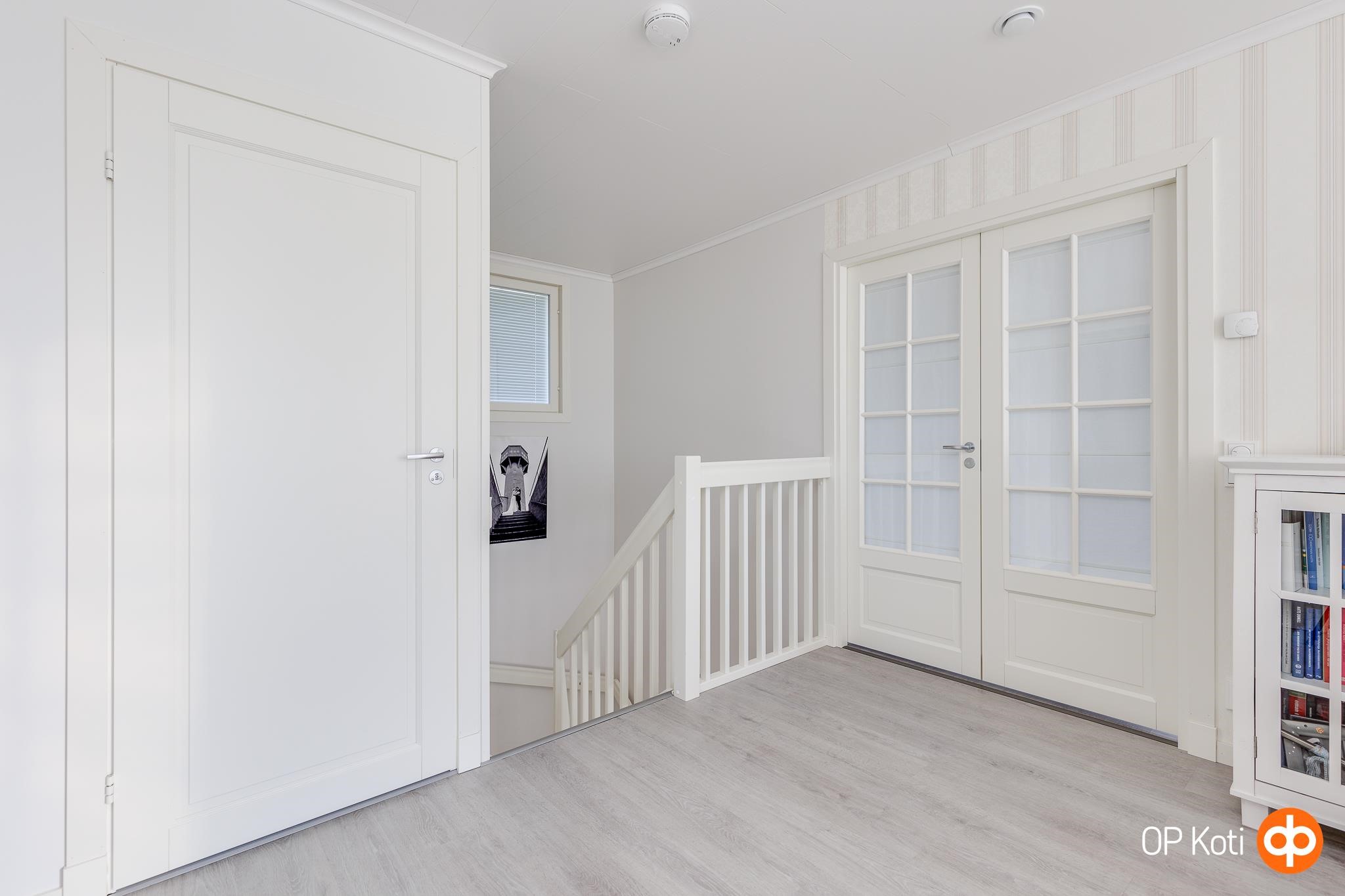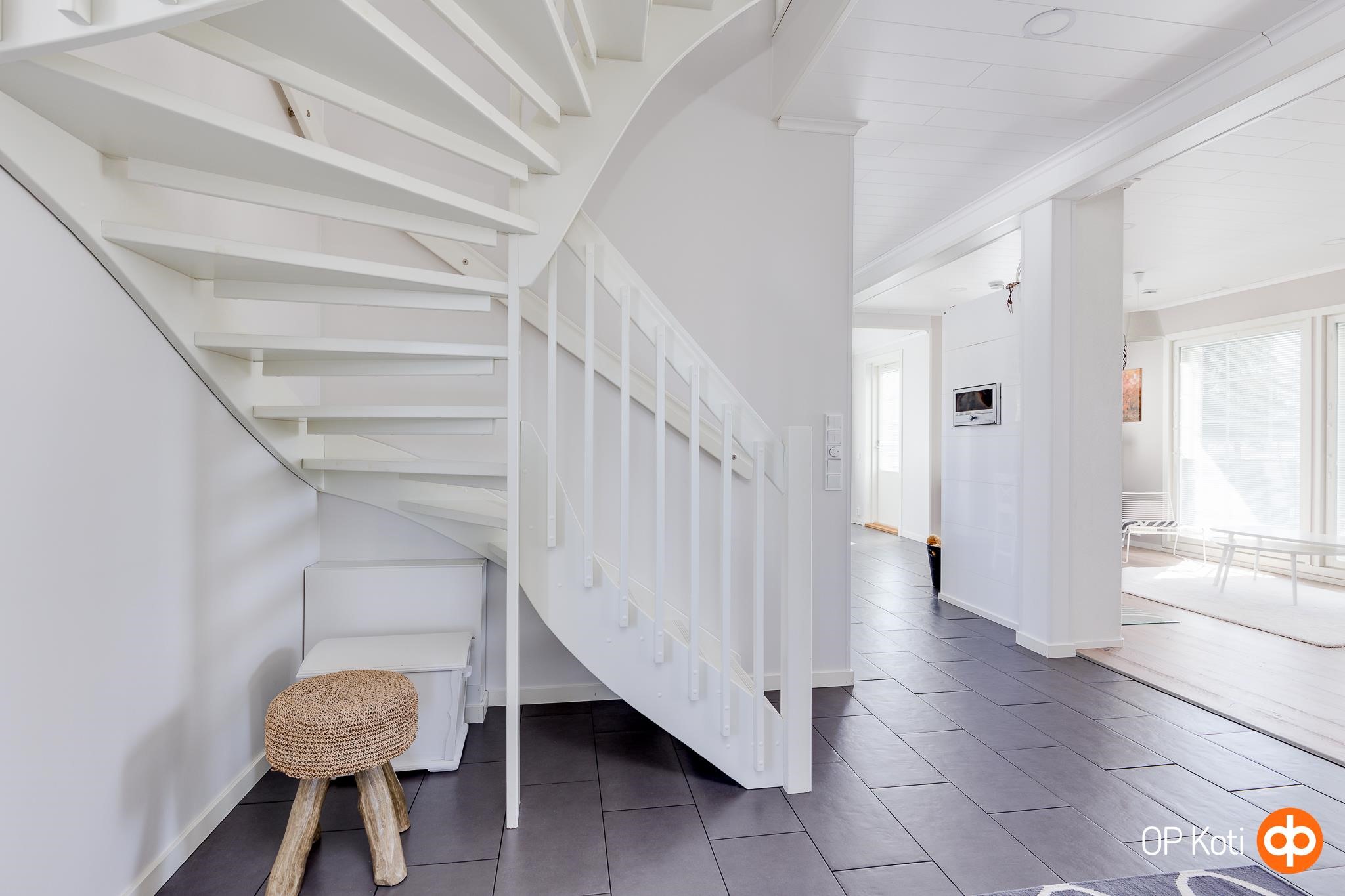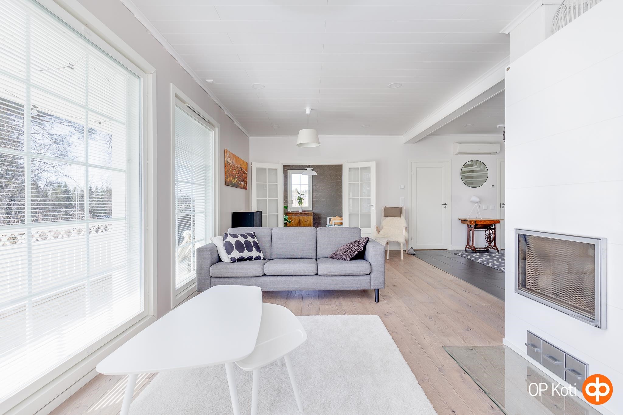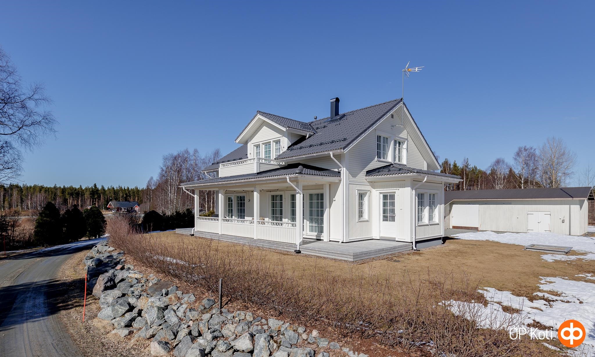 Astuessasi sisään et voi muuta kuin ihastua talon lumoavaan valoisuuteen: olohuoneen upeista ikkunoista avautuu miellyttävä järvimaisema, ja moneen ilmansuuntaan olevat ikkunat, avarat tilaratkaisut sekä huonekorkeus tuovat valoa ja avaruutta tiloihin. Alakerrasta löytyvät olohuoneen lisäksi keittiö, kodinhoitohuone, sauna, erillinen wc sekä yksi makuuhuone, jota voi käyttää esimerkiksi työhuoneena. Yläkerrassa ovat kolme muuta makuuhuonetta ja aulatila, joka toimii toisena olohuoneena. Lisäksi yläkerrassa on talon toinen wc ja parveke, josta voi nauttia rauhallisia aamukahvihetkiä.
