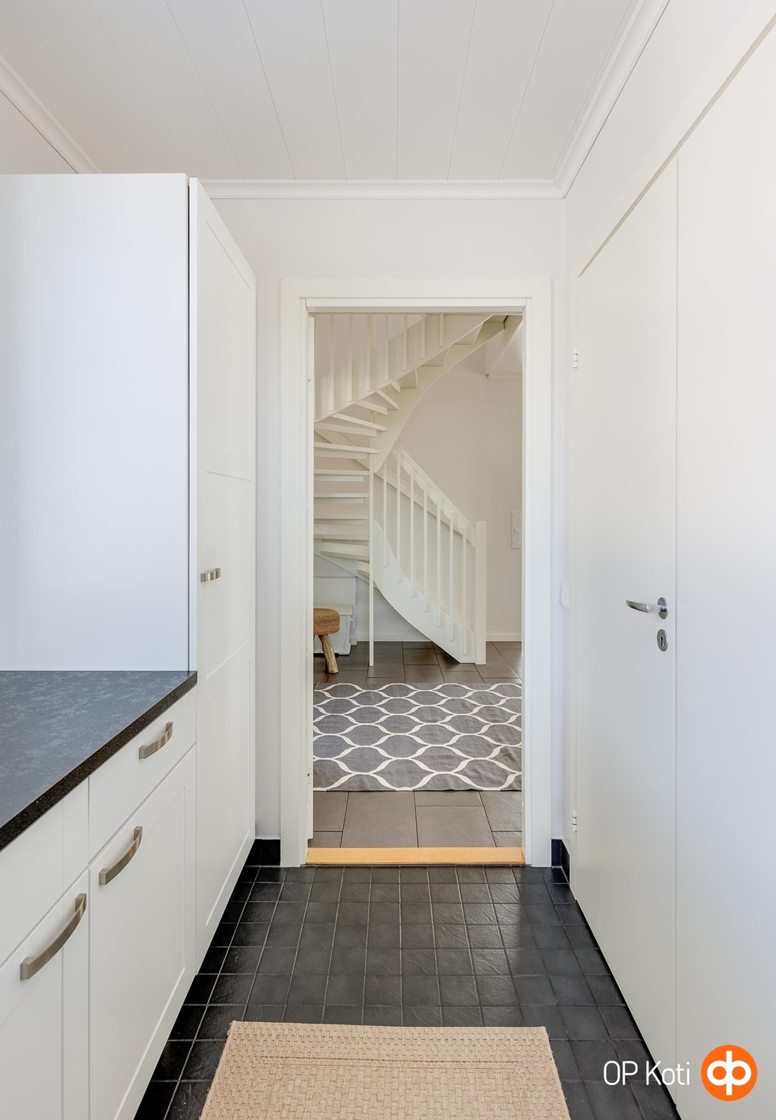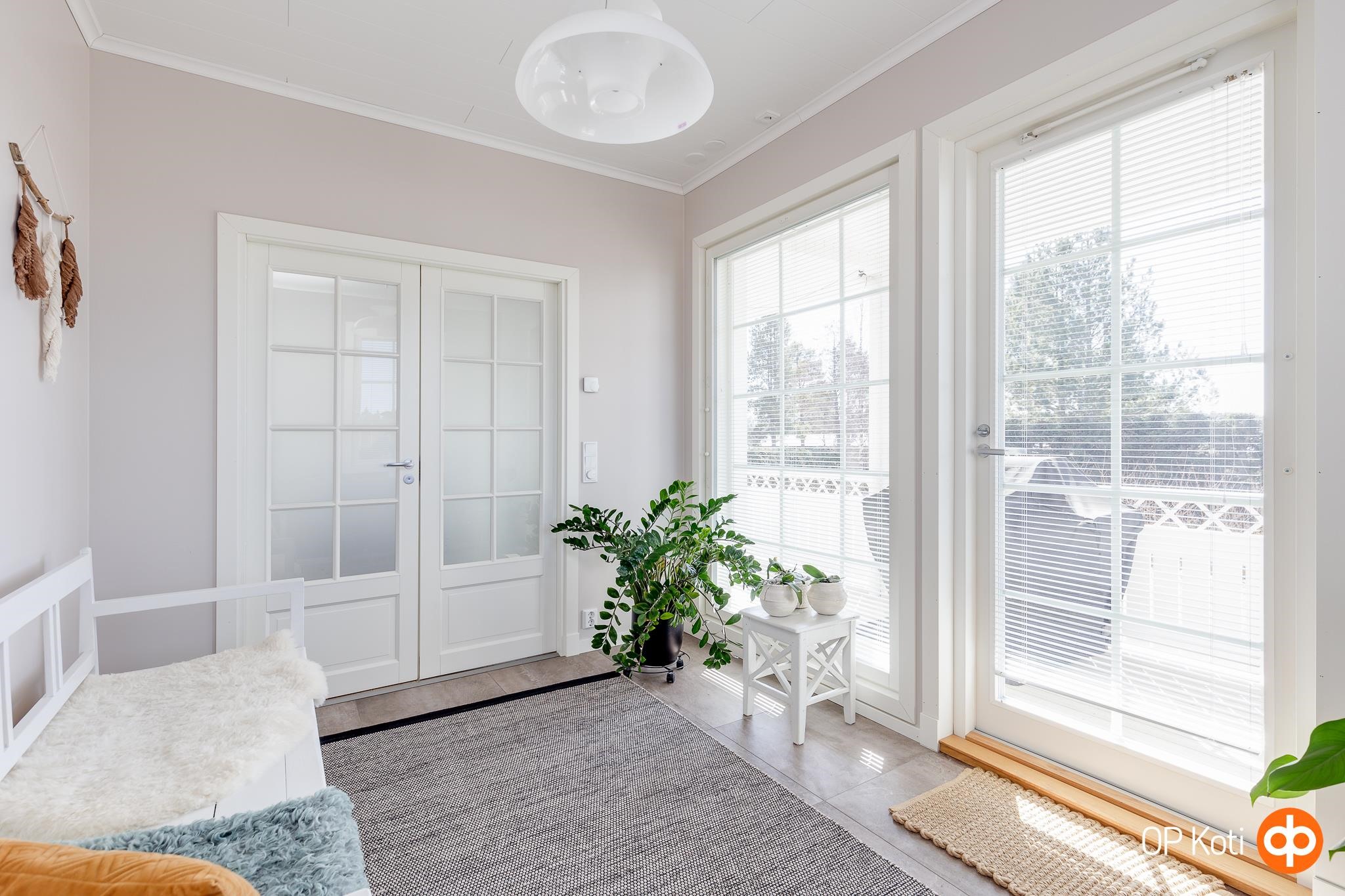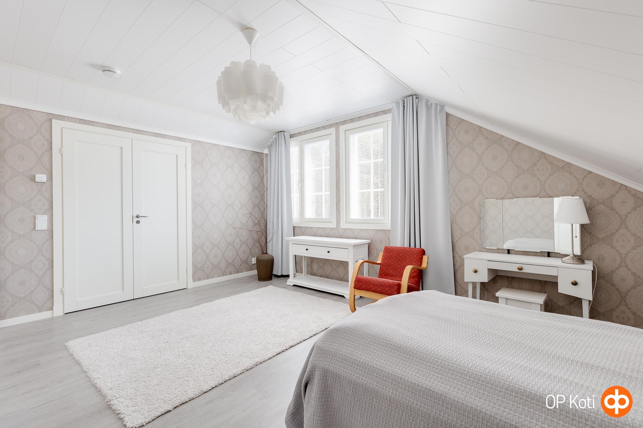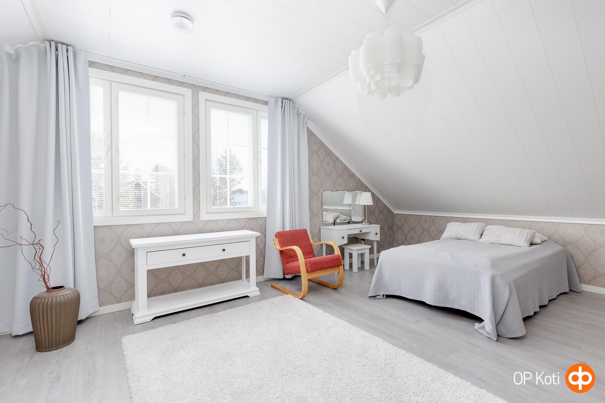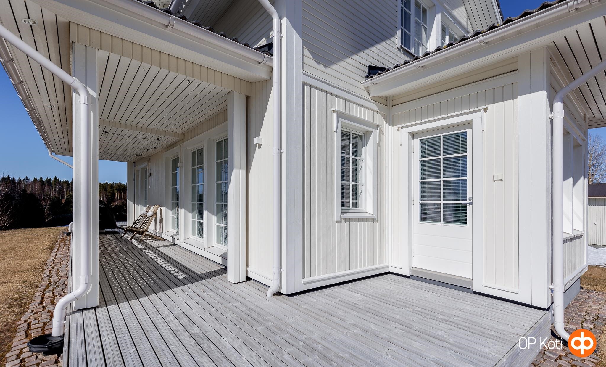 Astuessasi sisään et voi muuta kuin ihastua talon lumoavaan valoisuuteen: olohuoneen upeista ikkunoista avautuu miellyttävä järvimaisema, ja moneen ilmansuuntaan olevat ikkunat, avarat tilaratkaisut sekä huonekorkeus tuovat valoa ja avaruutta tiloihin. Alakerrasta löytyvät olohuoneen lisäksi keittiö, kodinhoitohuone, sauna, erillinen wc sekä yksi makuuhuone, jota voi käyttää esimerkiksi työhuoneena. Yläkerrassa ovat kolme muuta makuuhuonetta ja aulatila, joka toimii toisena olohuoneena. Lisäksi yläkerrassa on talon toinen wc ja parveke, josta voi nauttia rauhallisia aamukahvihetkiä.