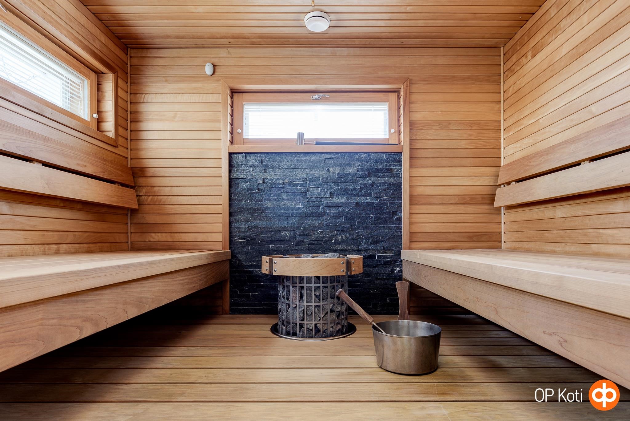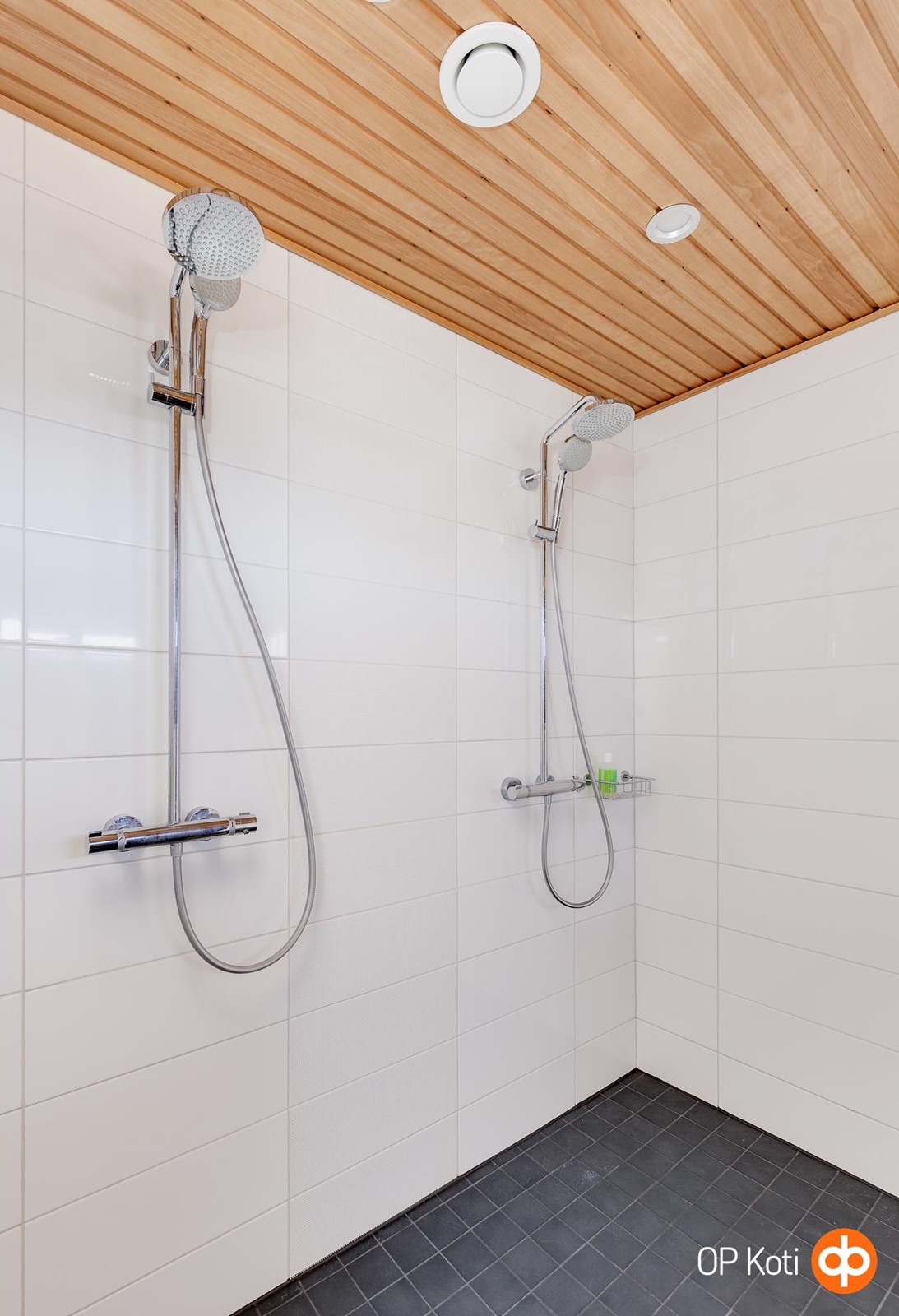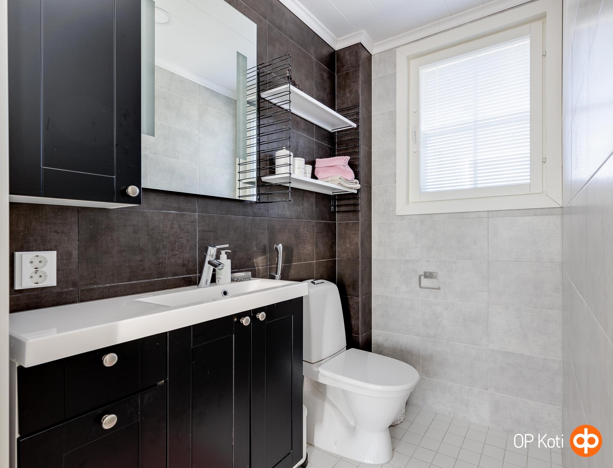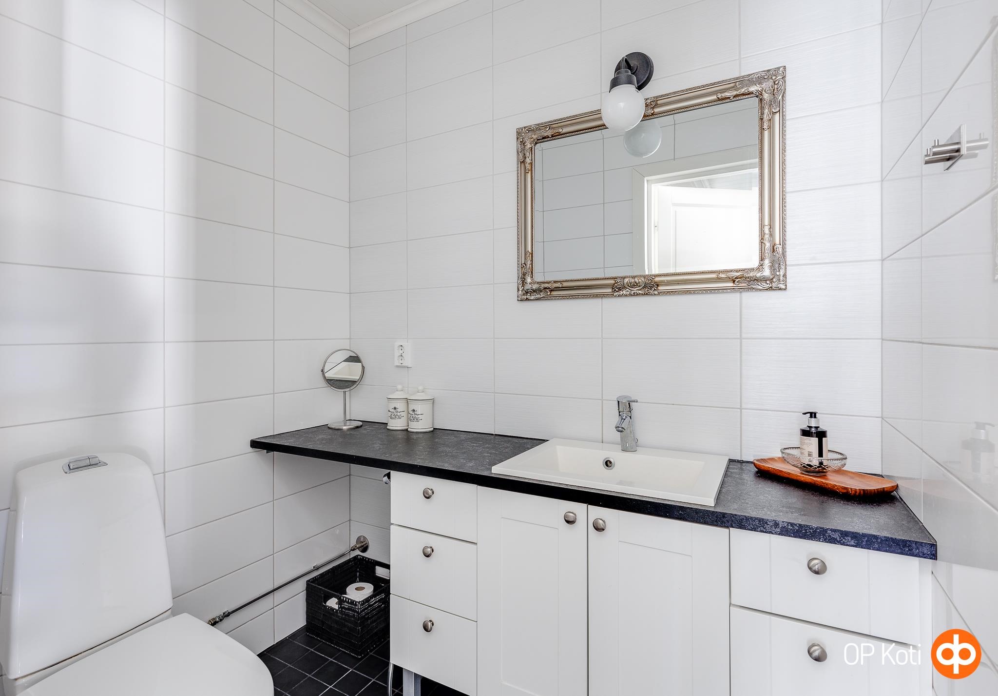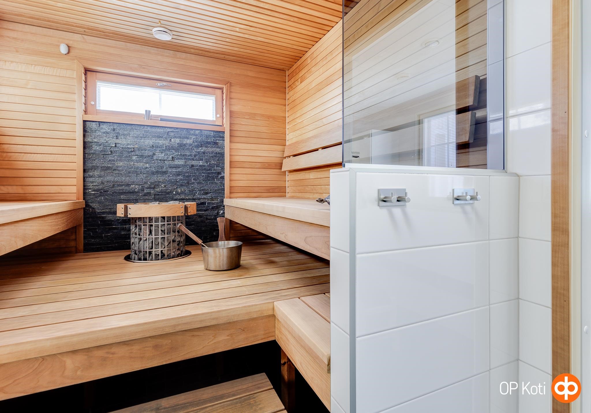 - Sauna, sähkökiuas, kylpyhuone, erillinen wc x2, suihku x2, peilit, allaskaappi, pesukoneliitäntä, lattialämmitys, kiinteät valaisimet.