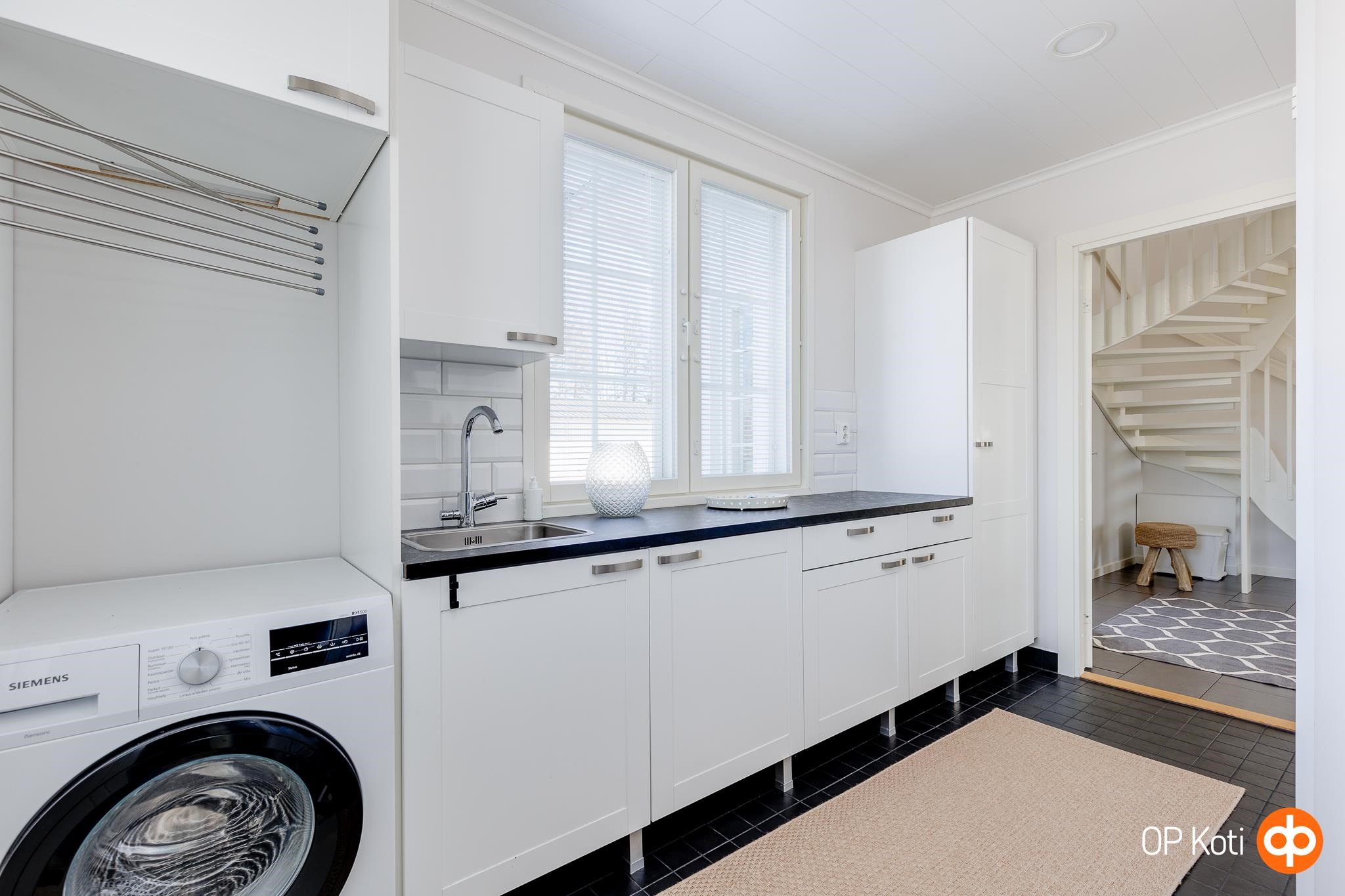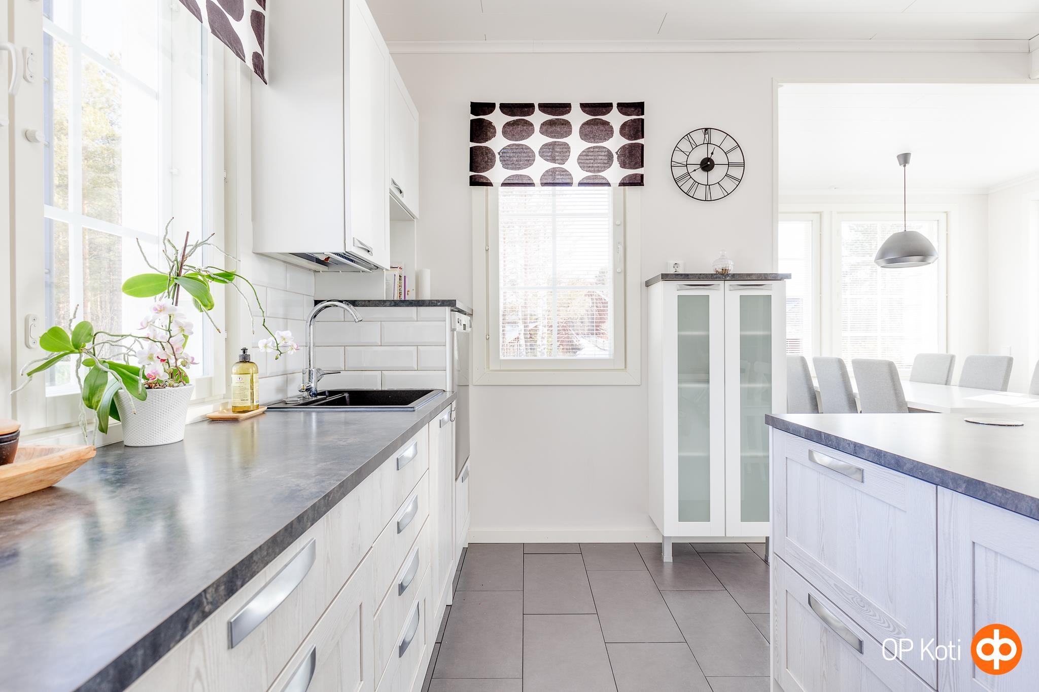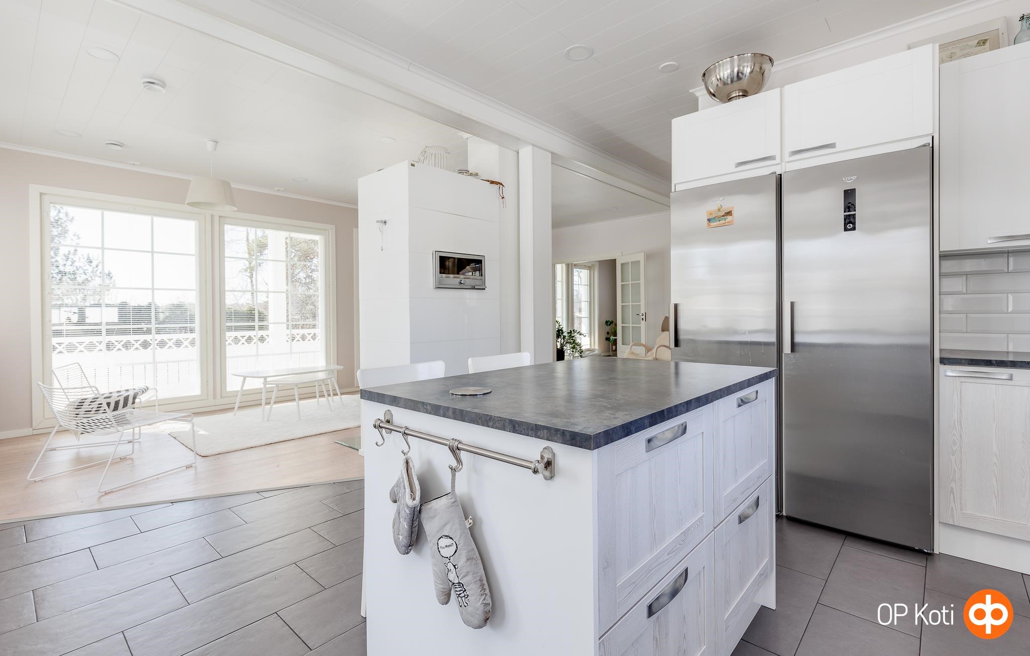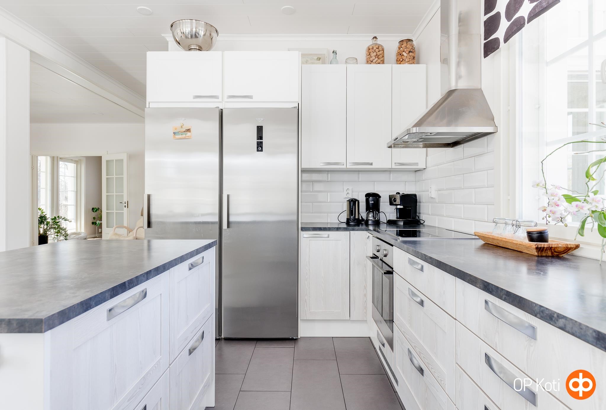 - Jääkaappi (uusittu muutama vuosi sitten), pakastekaappi, erillisuuni, induktioliesi, liesituuletin, leivinuuni, astianpesukone, kaapistot, kiinteät valaisimet.