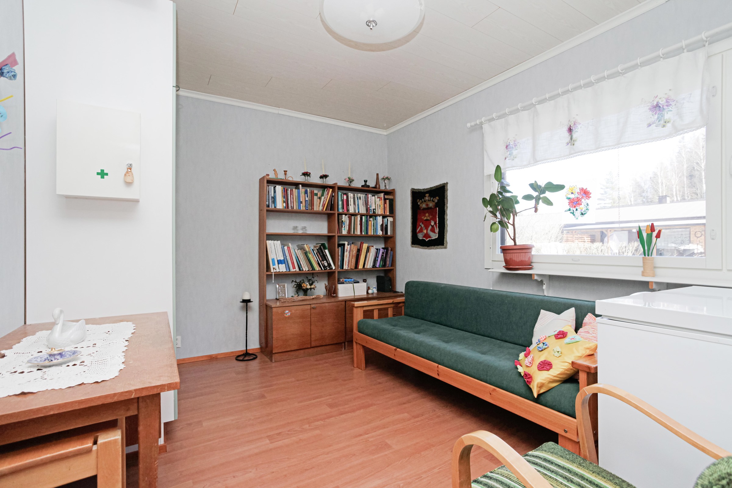 Keittiö: Laattalattia + laminaattitasot. Olohuone: Laminaattilattia + tapetti. Makuuhuone 1: Laminaattilattia + tapetti. Makuuhuone 2: Laminaattilattia + tapetti. Kodinhoitohuone: Laattalattia. Sauna: Laattalattia + puupaneli. Kylpyhuone: Laattalattia + laattaseinät. Eteinen: Laminaattilattia + tapetti. Wc: Laattalattia + laattaseinät.
