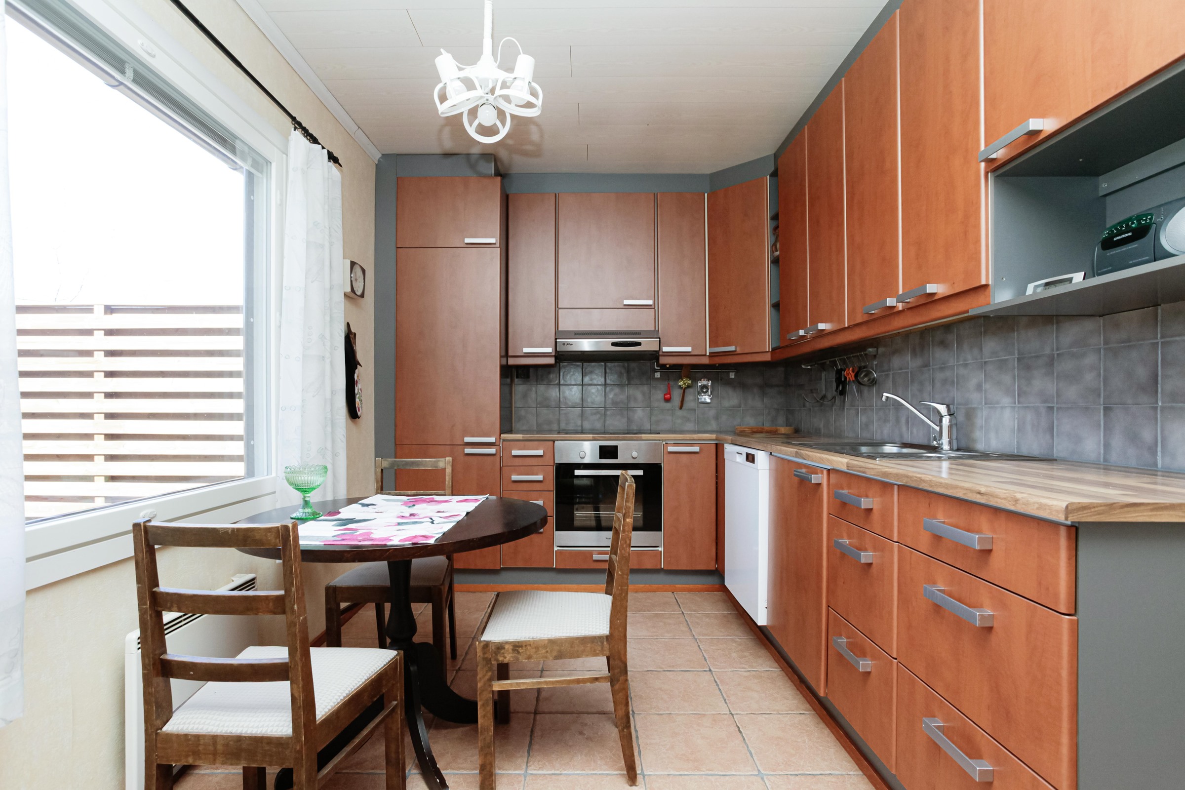 - Jääkaappipakastin, erillisuuni, keraaminen liesi, liesituuletin, astianpesukone, kaapistot, kiinteät valaisimet.