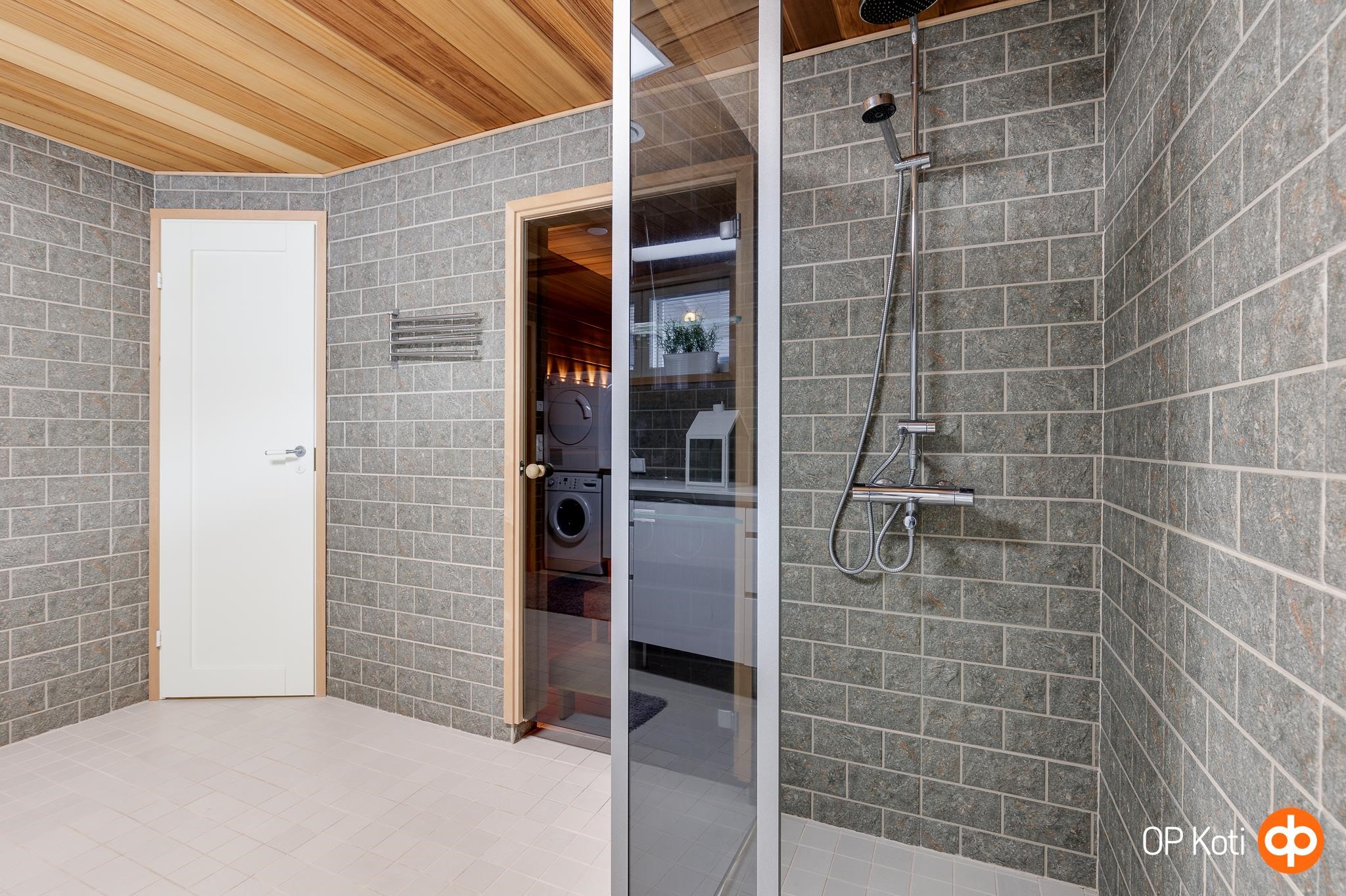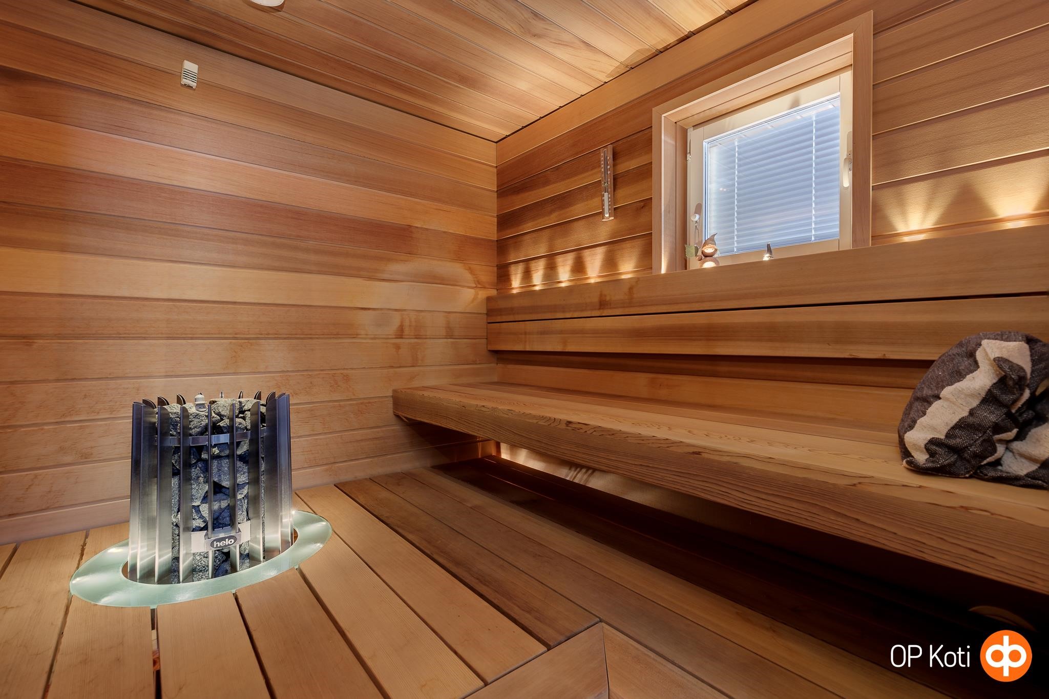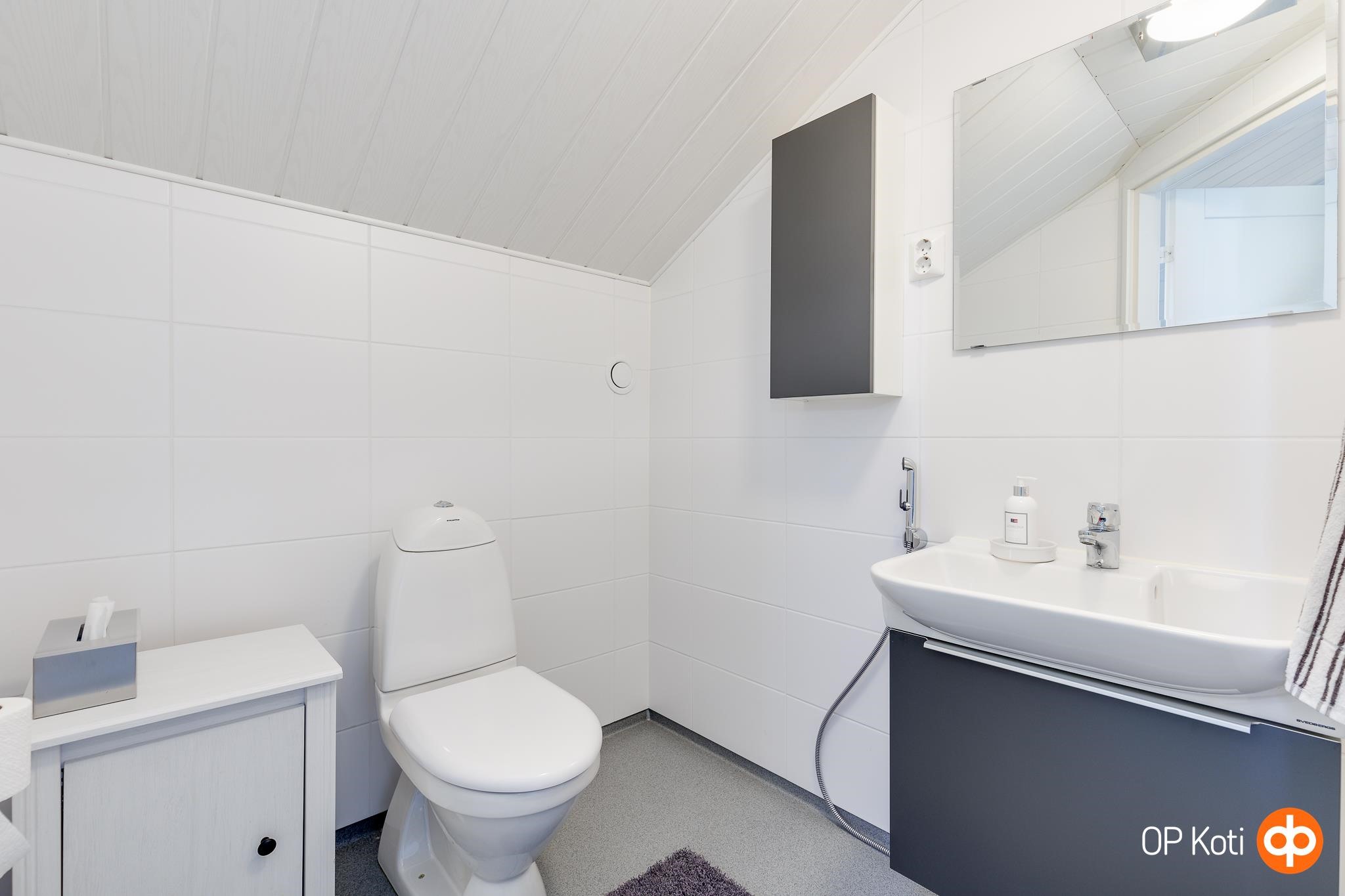 - Sauna, sähkökiuas, kylpyhuone, erillinen wc, suihkuseinä, peilit, peilikaappi, kaapit, allaskaappi, pesukoneliitäntä, lattialämmitys (alakerrassa, yläkerrassa patterit), kiinteät valaisimet.