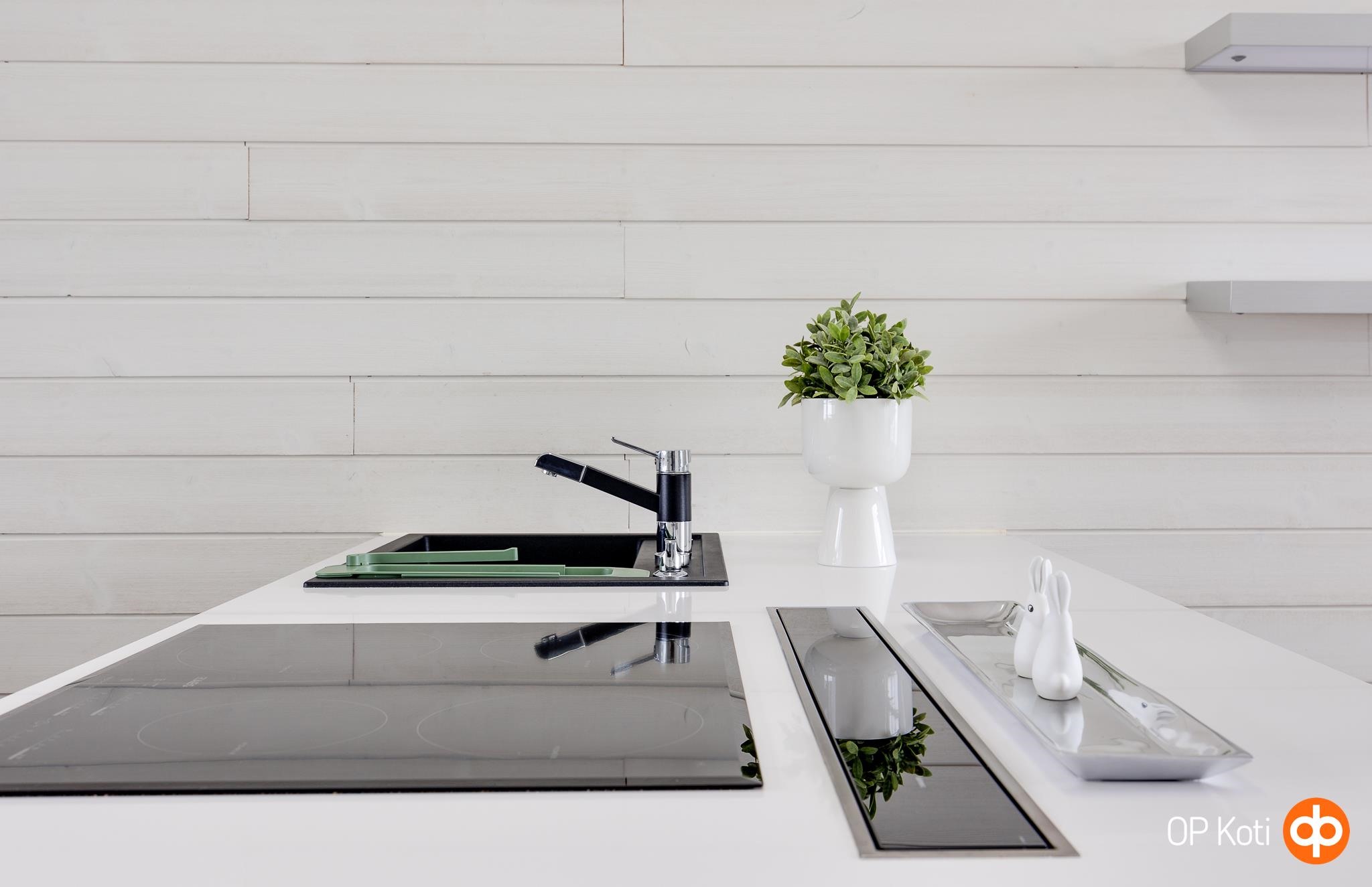 - Jääkaappipakastin, induktioliesi, liesituuletin (integroitu), astianpesukone, kaapistot, kiinteät valaisimet, pöytätasojen materiaali kivi.