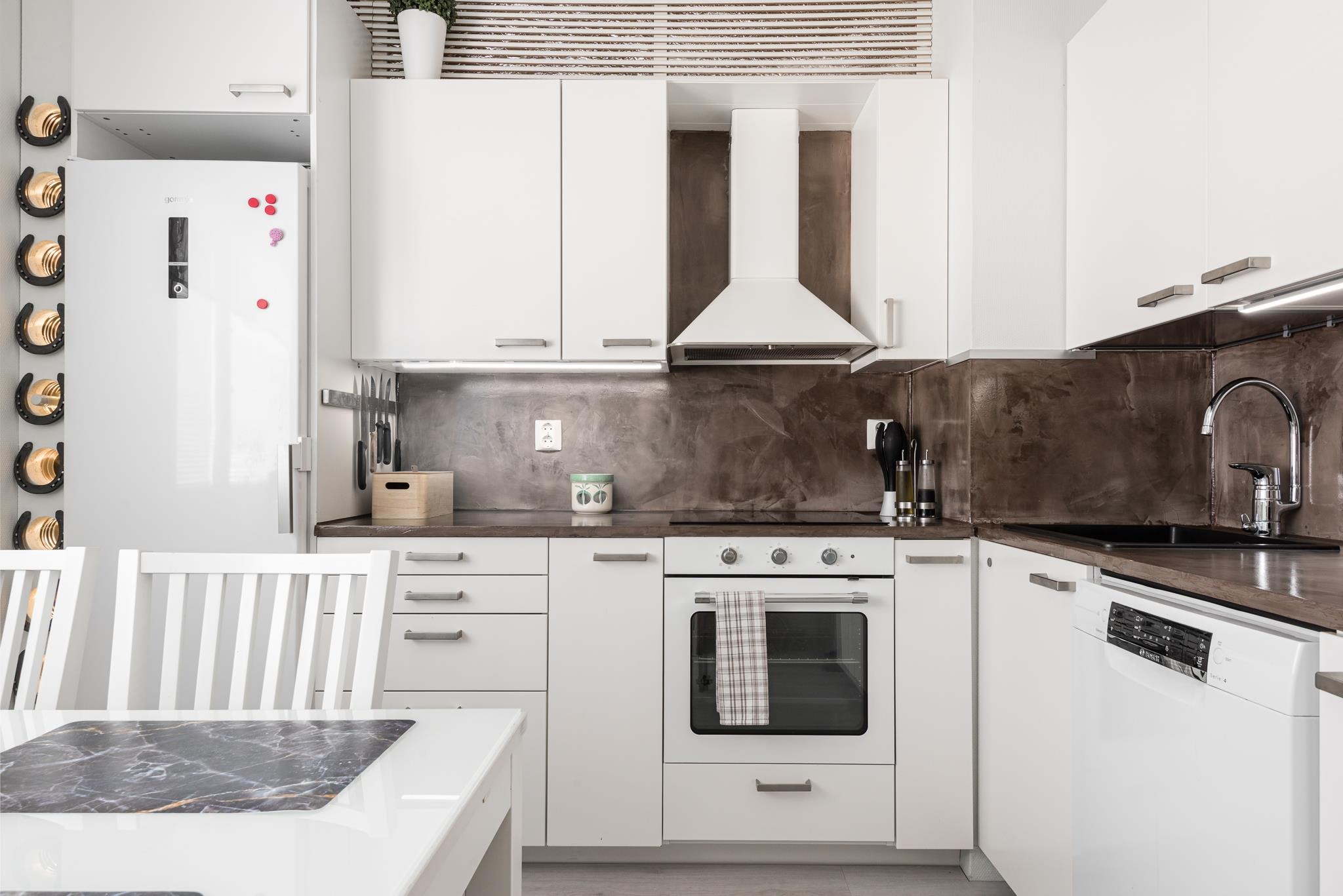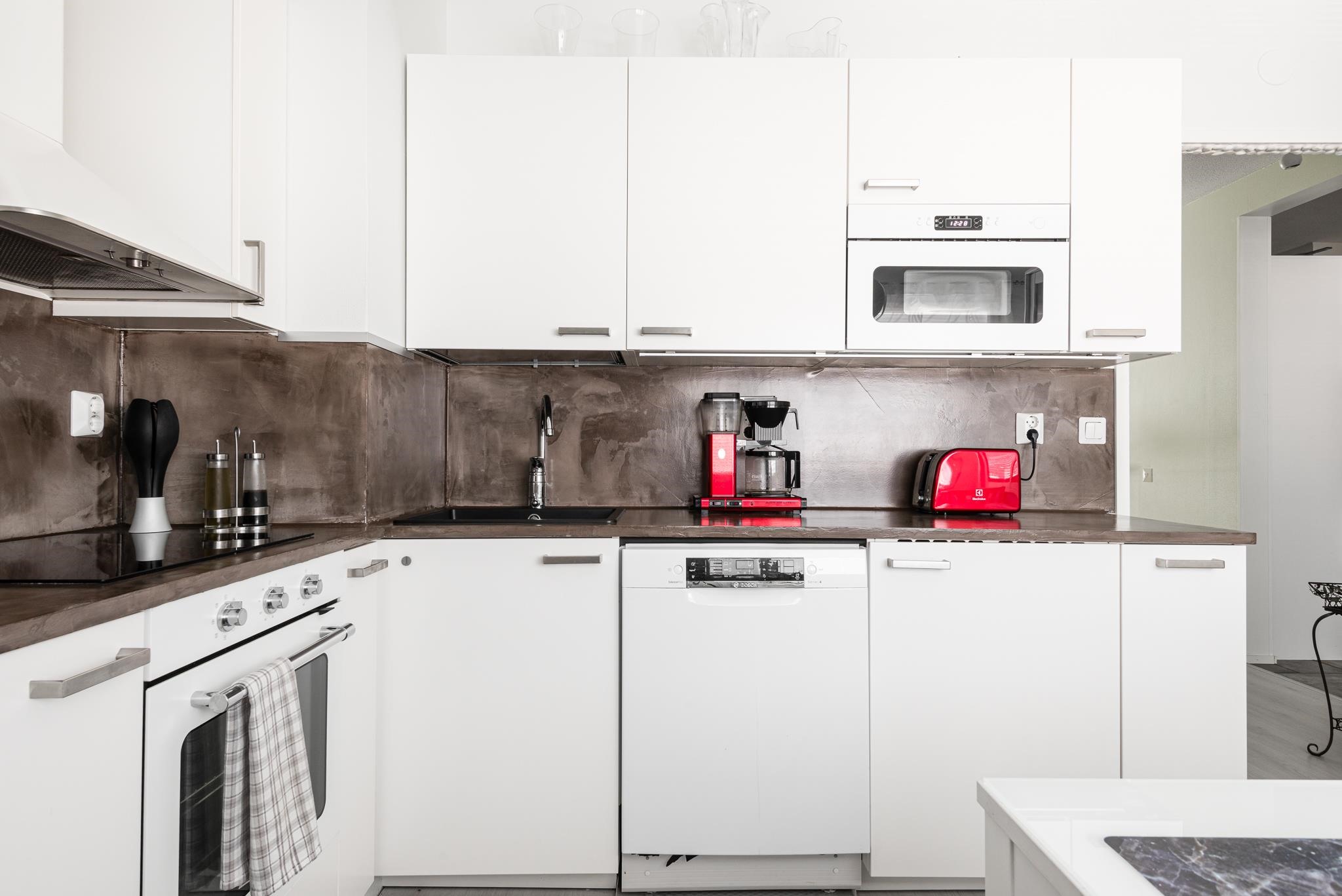 - Jääkaappi, erillisuuni, induktioliesi, liesituuletin, mikroaaltouuni, astianpesukone, kaapistot kaapin ovet maalattu 202, kiinteät valaisimet.