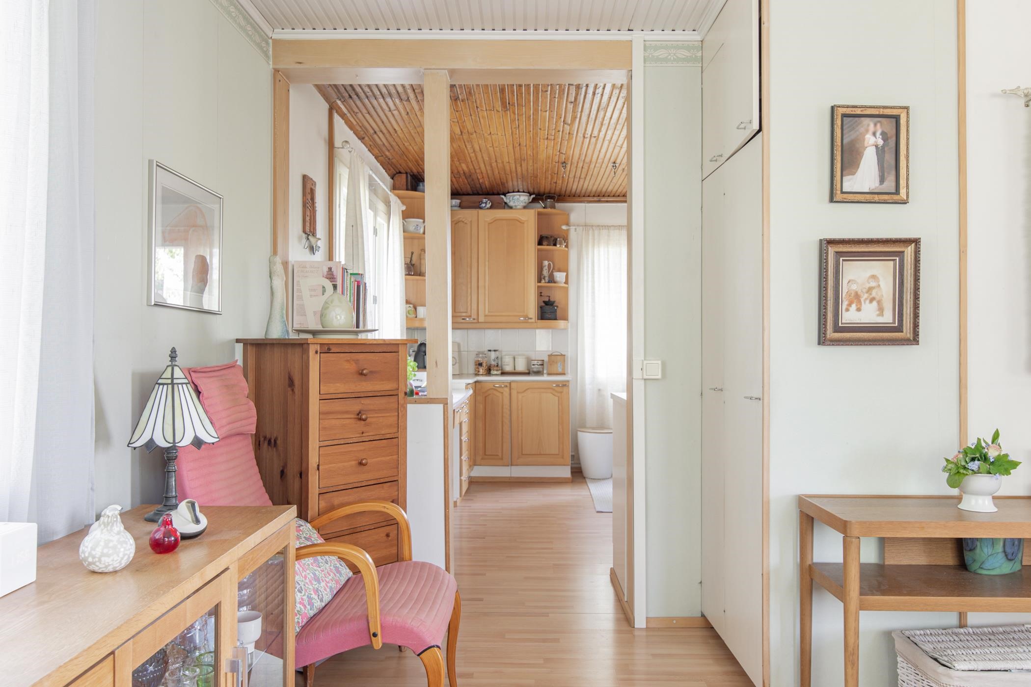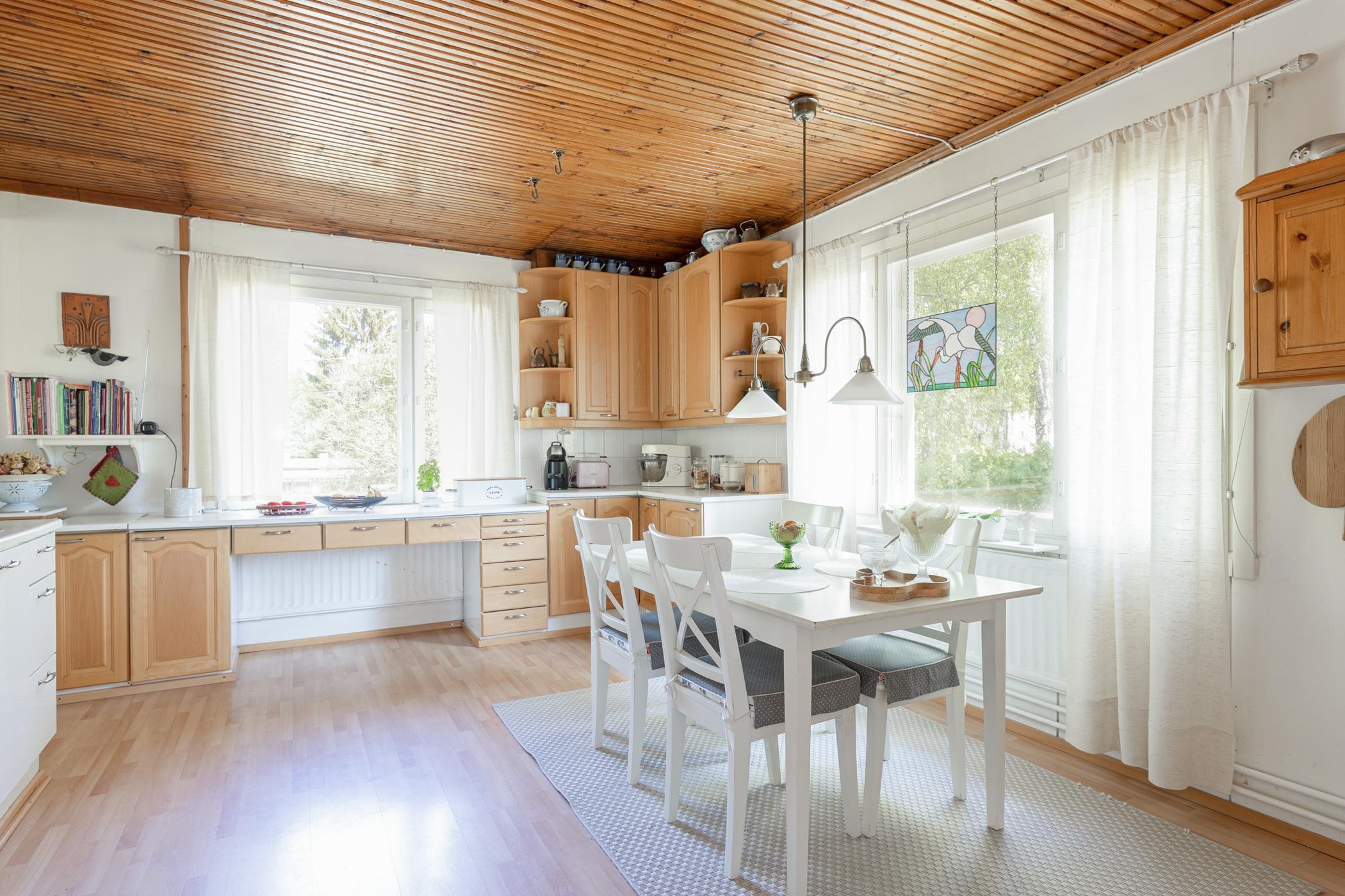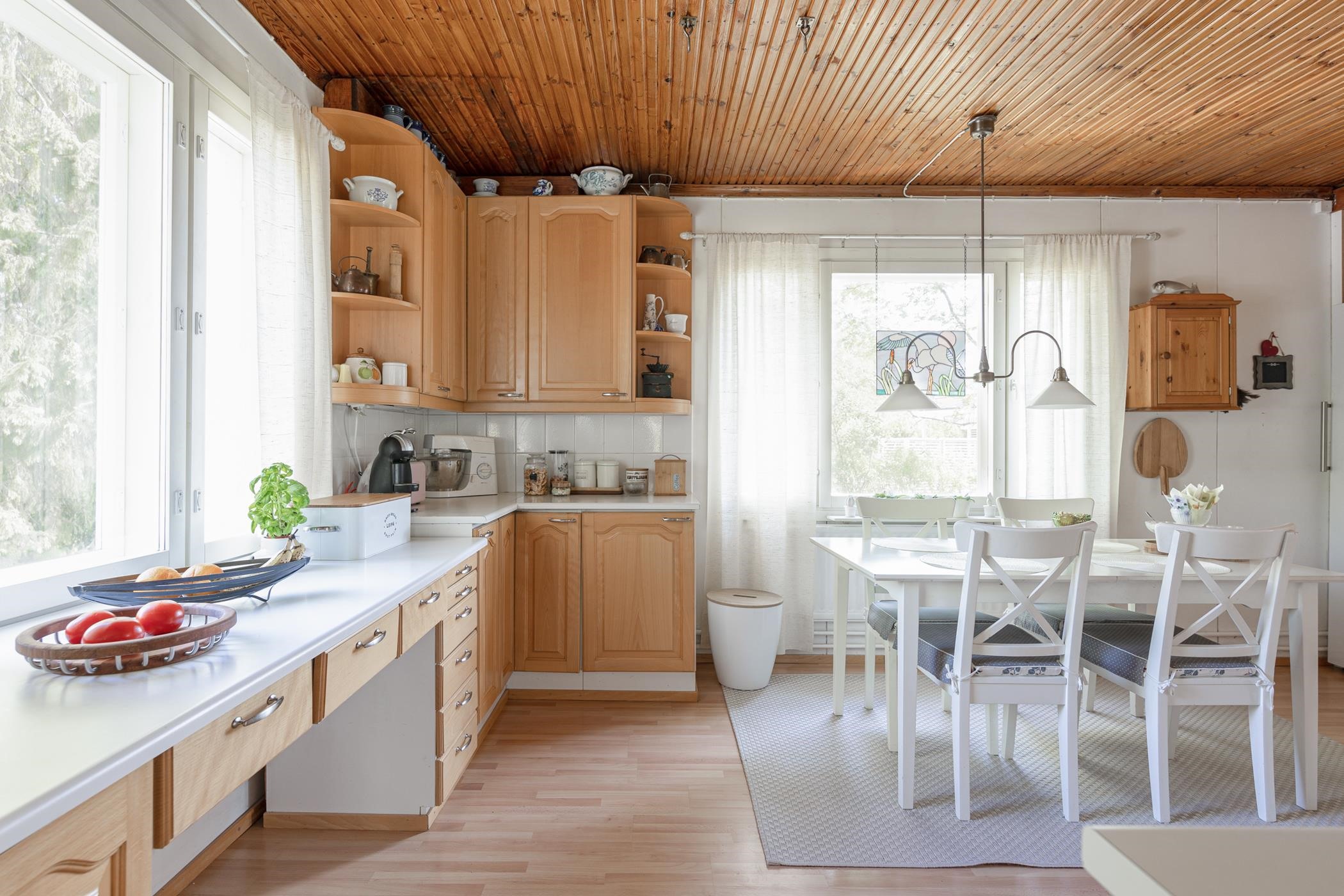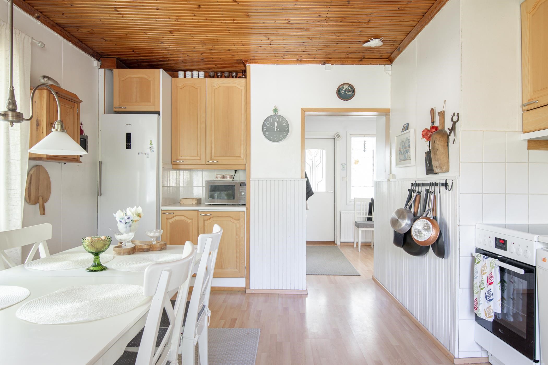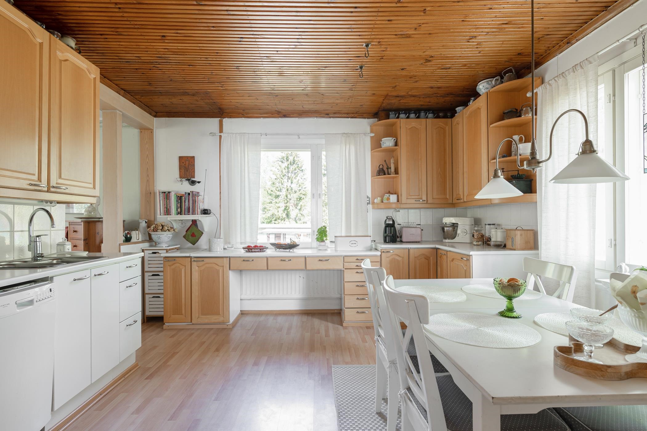 - Jääkaappi, pakastekaappi ja kylmiö (kellarikerroksessa), keraaminen liesi (uusittu 2022), liesituuletin, leivinuuni (kellarikerroksessa), astianpesukone, kaapistot, kiinteät valaisimet (työtasovalaisin).