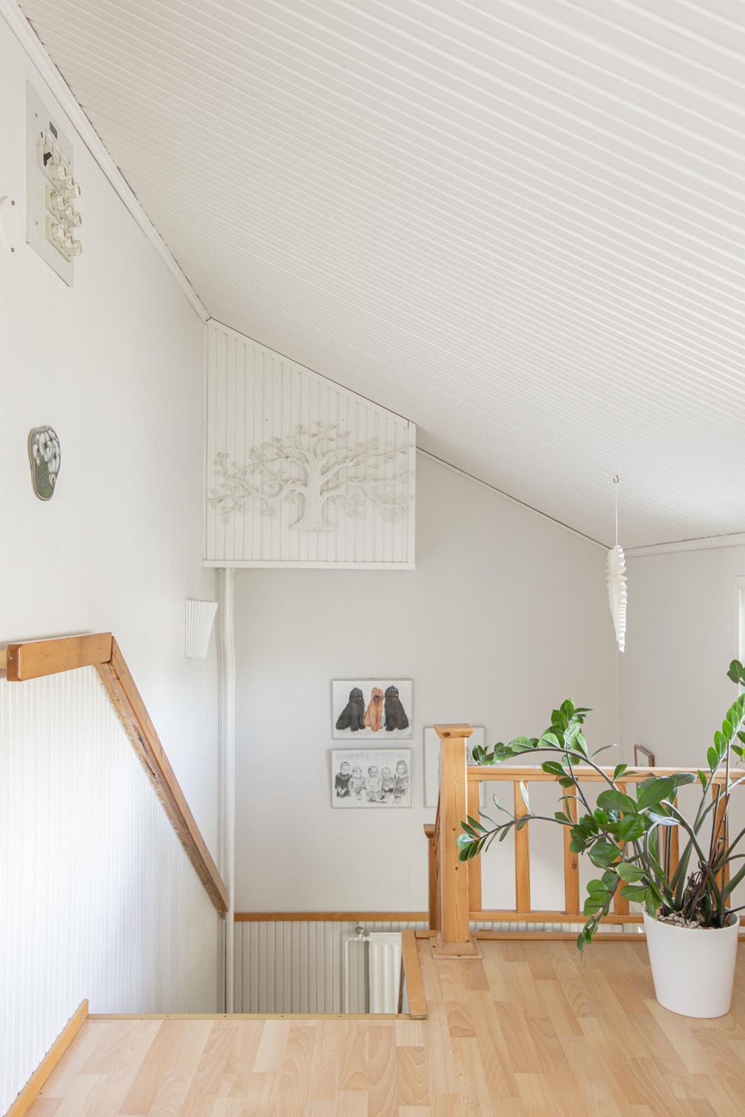 Keittiö: Lattiassa laminaatti, seinät maali/puolipaneli, katto paneloitu. Olohuone: Lattiassa laminaatti, seinät tapetoitu, katto paneloitu. Makuuhuone 1: Lattialassa laminaatti, seinät tapetti/puolipaneeli, katto paneloitu. Makuuhuone 2: Lattiassa laminaatti, seinät tapetoitu, katto paneloitu. Sauna: Lattia laatoitettu, seinät ja katto paneloitu. Kylpyhuone: Lattia ja seinät laatoitettu, katto paneloitu. Eteinen: Lattia laminaatti, seinät maali/puolipaneeli, katto paneloitu. Wc: Lattia ja seinät laatoitettu, katto paneloitu. Kuisti (kylmä): Lattiassa laminaatti, seinät ja katto paneloitu. Yläkerran aula: Lattiassa laminaatti, seinät maalattu, katto paneloitu. Raput: Seinissä puolipaneeli. Takkahuone: Lattiassa laminaatti, seinät maalattu, katto styroxia.