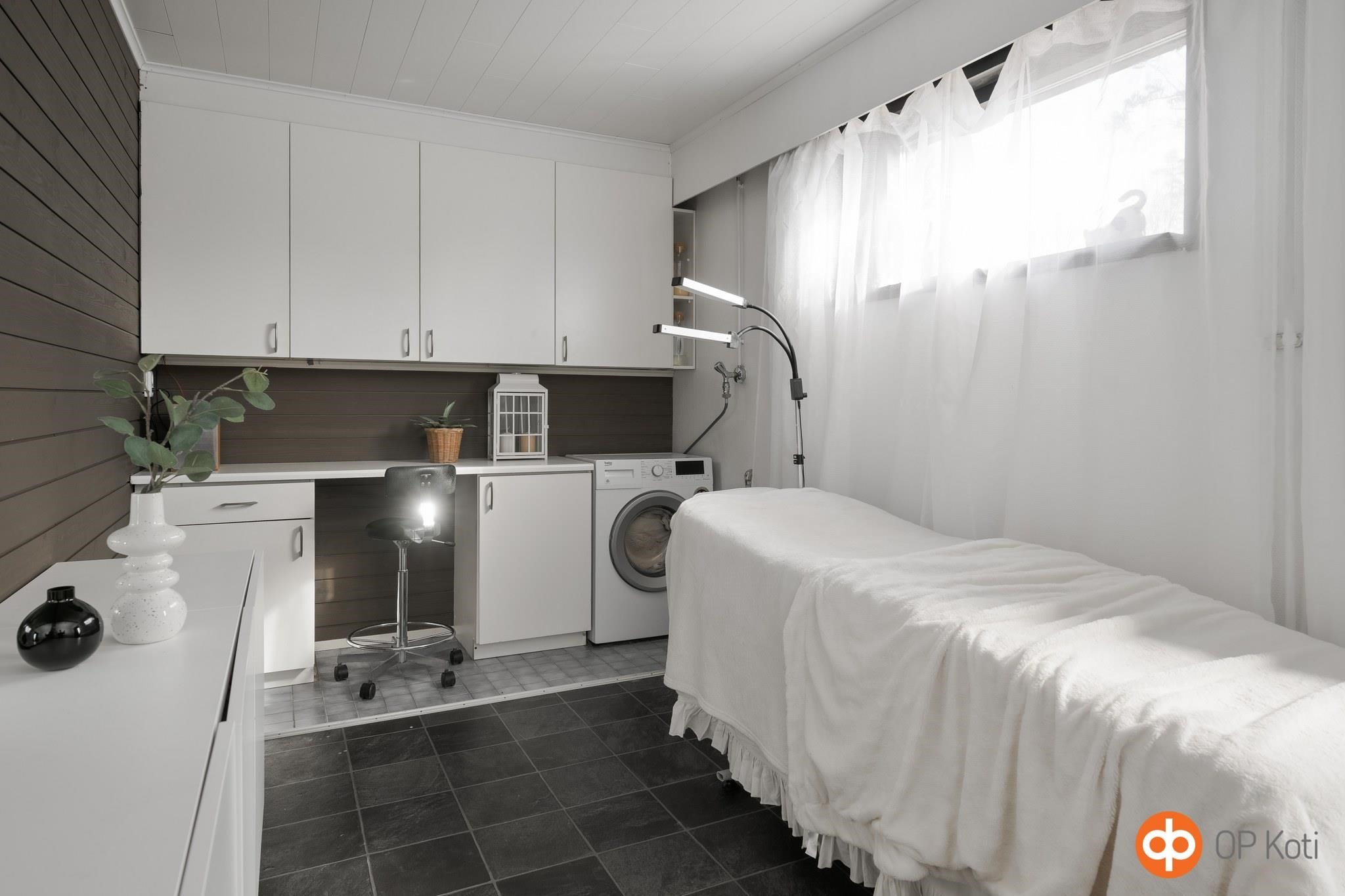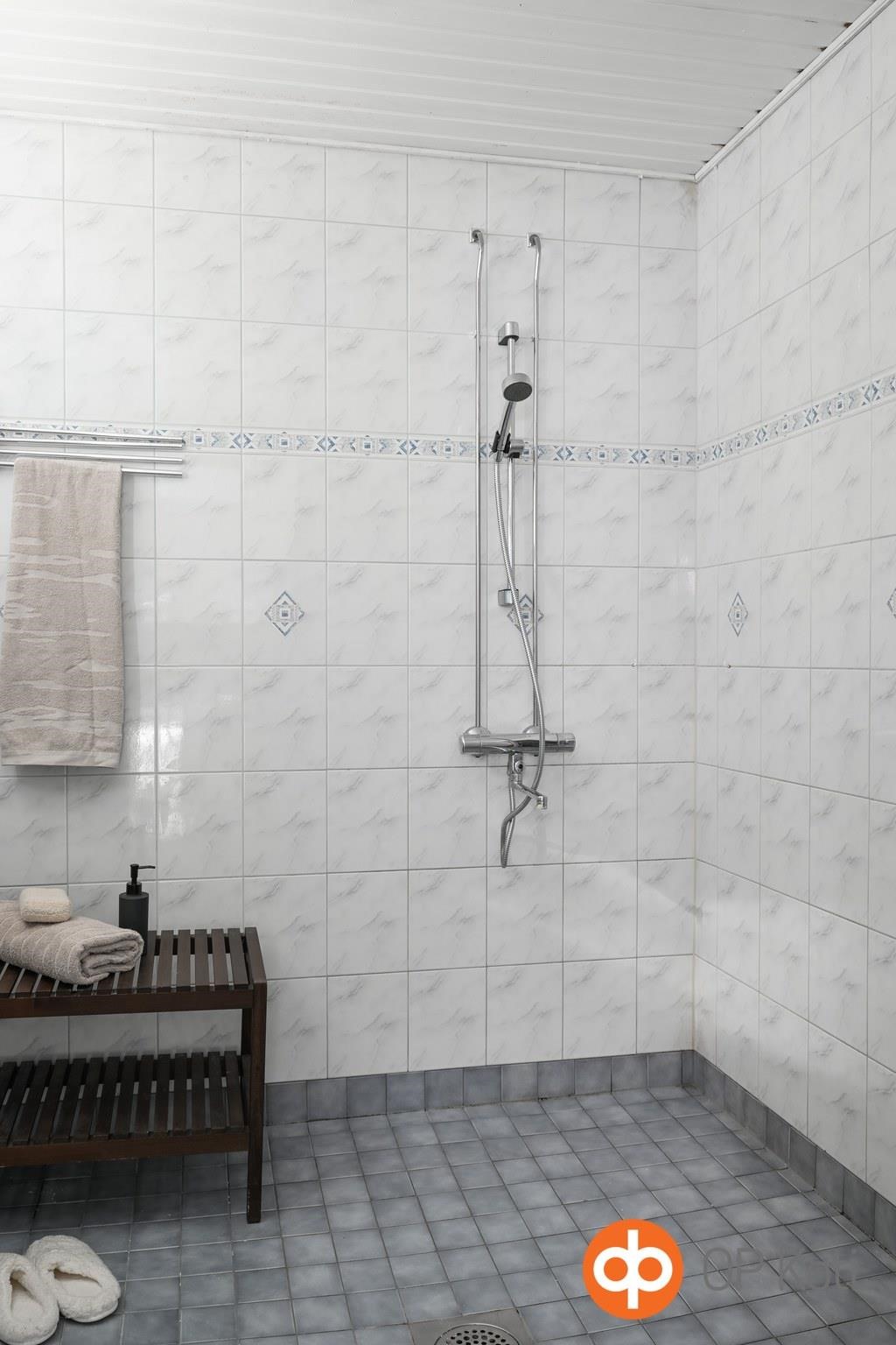 - Sauna, sähkökiuas valmius myös puukiukaalle, kylpyhuone, erillinen wc, suihku, peilit, kaapit, allaskaappi, pesukoneliitäntä, kiinteät valaisimet.