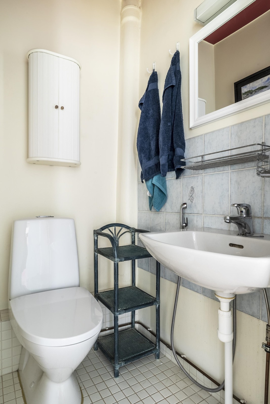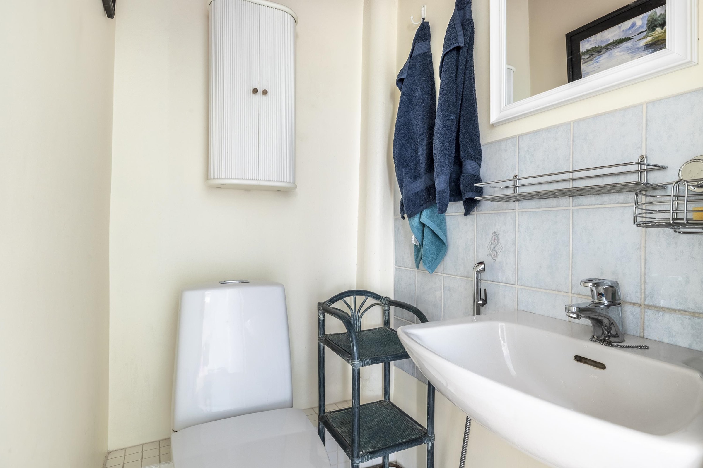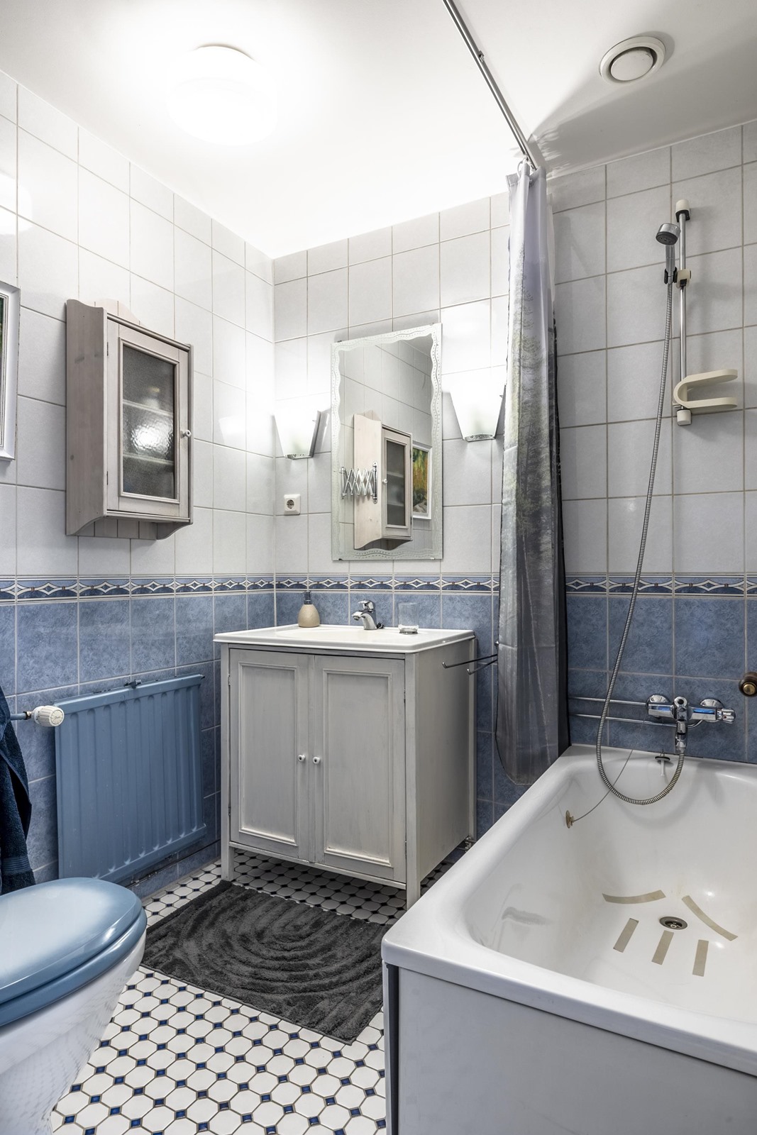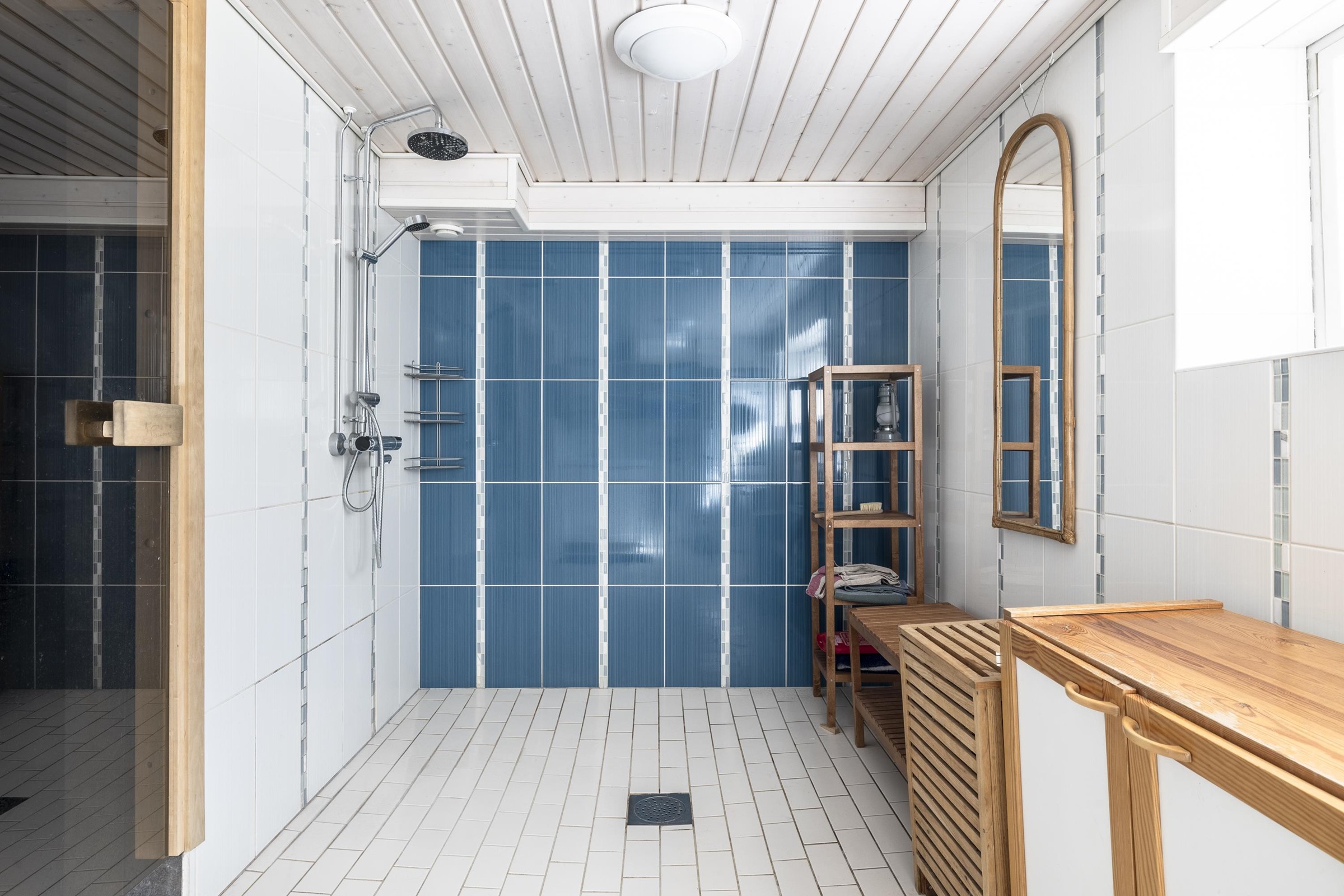 - Sauna, puukiuas, kylpyhuone, erillinen wc, suihku, peilit, kaapit, allaskaappi, pesukoneliitäntä Kellarikerroksen kylpyhuonetilassa, kiinteät valaisimet.