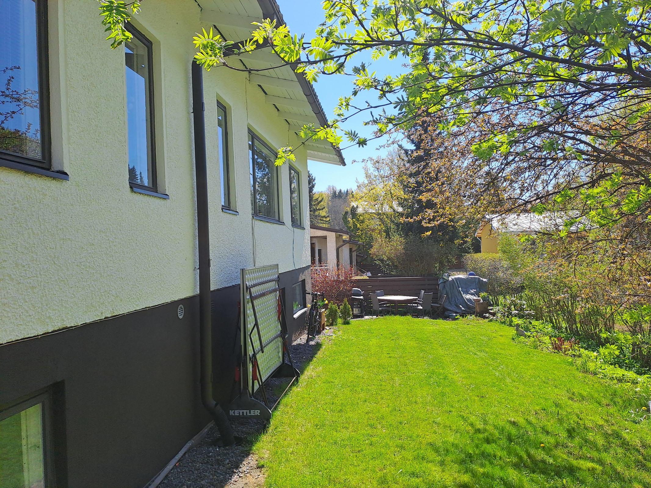 Yläkerrassa sijaitsevat kodin valoisat oleskelutilat: viisi huonetta, toimiva keittiö sekä kylpyhuone ja erillinen wc. Alakerta yllättää laajuudellaan - sieltä löytyvät saunaosasto kylpyhuoneineen, tunnelmallinen takkahuone sekä runsaasti varasto- ja harrastetilaa. Vaikkapa kotona työskentelyä tai perheen teinejä ajatellen alakerran tiloihin on ideaalisti oma sisäänkäyntinsä. Huoneistolla on lisäksi suojaisa länteen avautuva piha, jossa on helppo nauttia ilta-auringosta. Autolle on oma lämmin autotallipaikka.