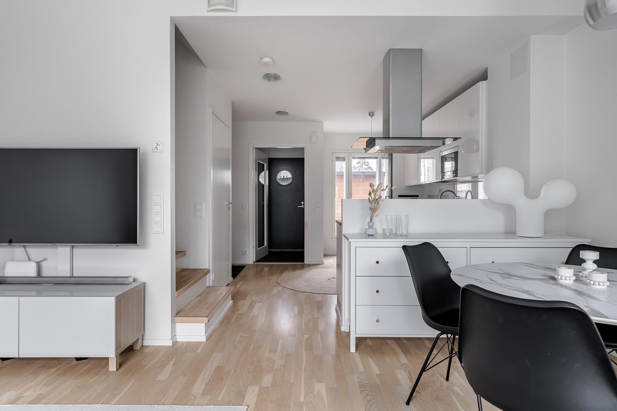 Kodissa on erinomaisesti suunniteltu pohjaratkaisu, jossa jokainen neliö on otettu fiksusti käyttöön. Avarassa olohuoneessa on tilaa rentoutumiseen ja yhdessäoloon, ja se yhdistyy luontevasti ruokailutilaan ja keittiöön. Olohuoneesta on käynti takapihan terassille. Lisämukavuutta tuo olohuoneessa oleva kaunis tulisija. Alakerrassa on lisäksi wc ja eteisen kaapistot.