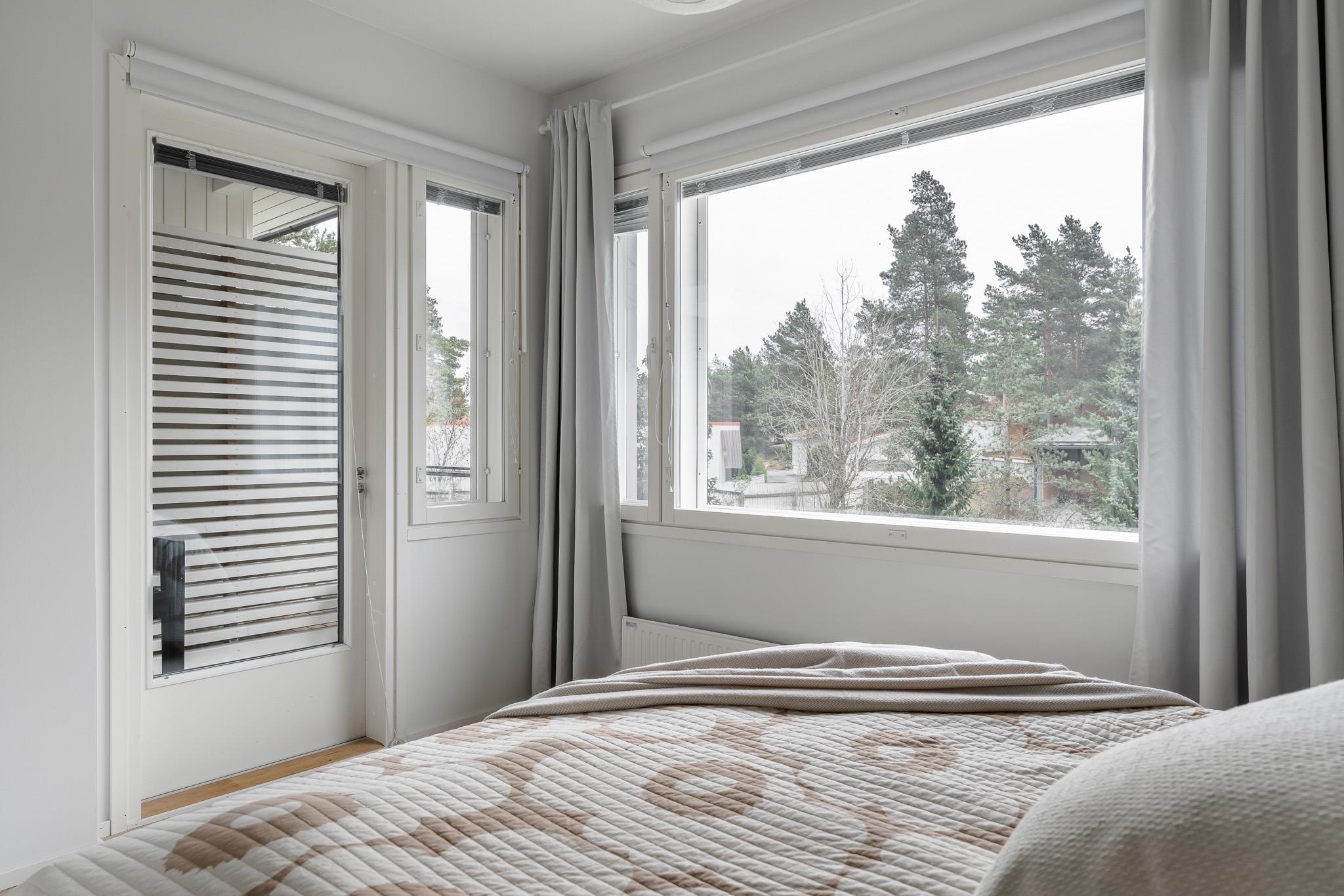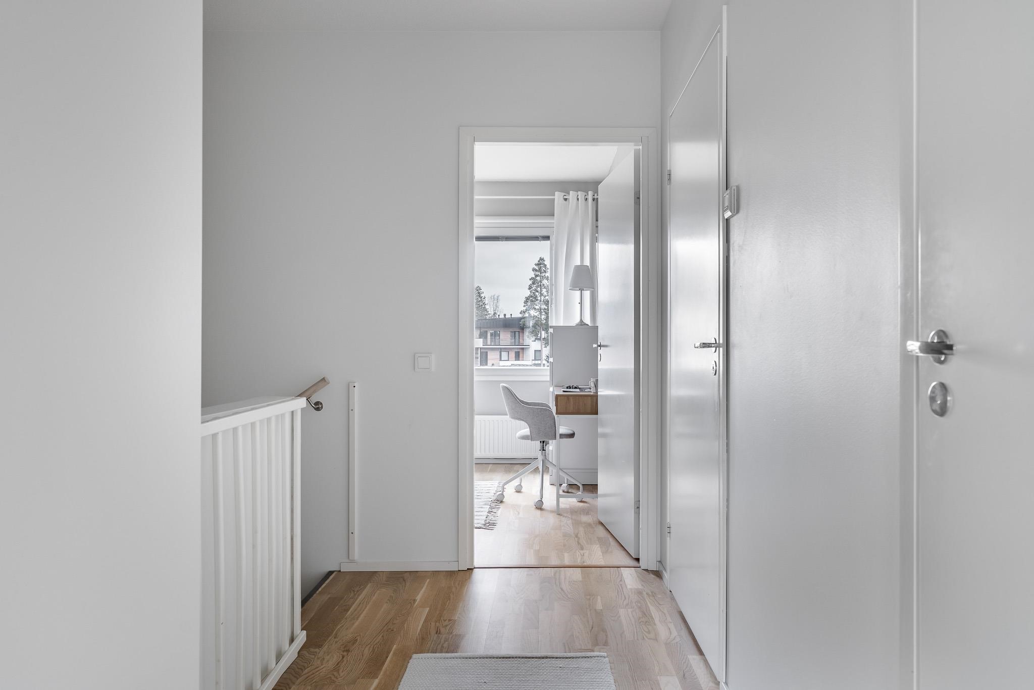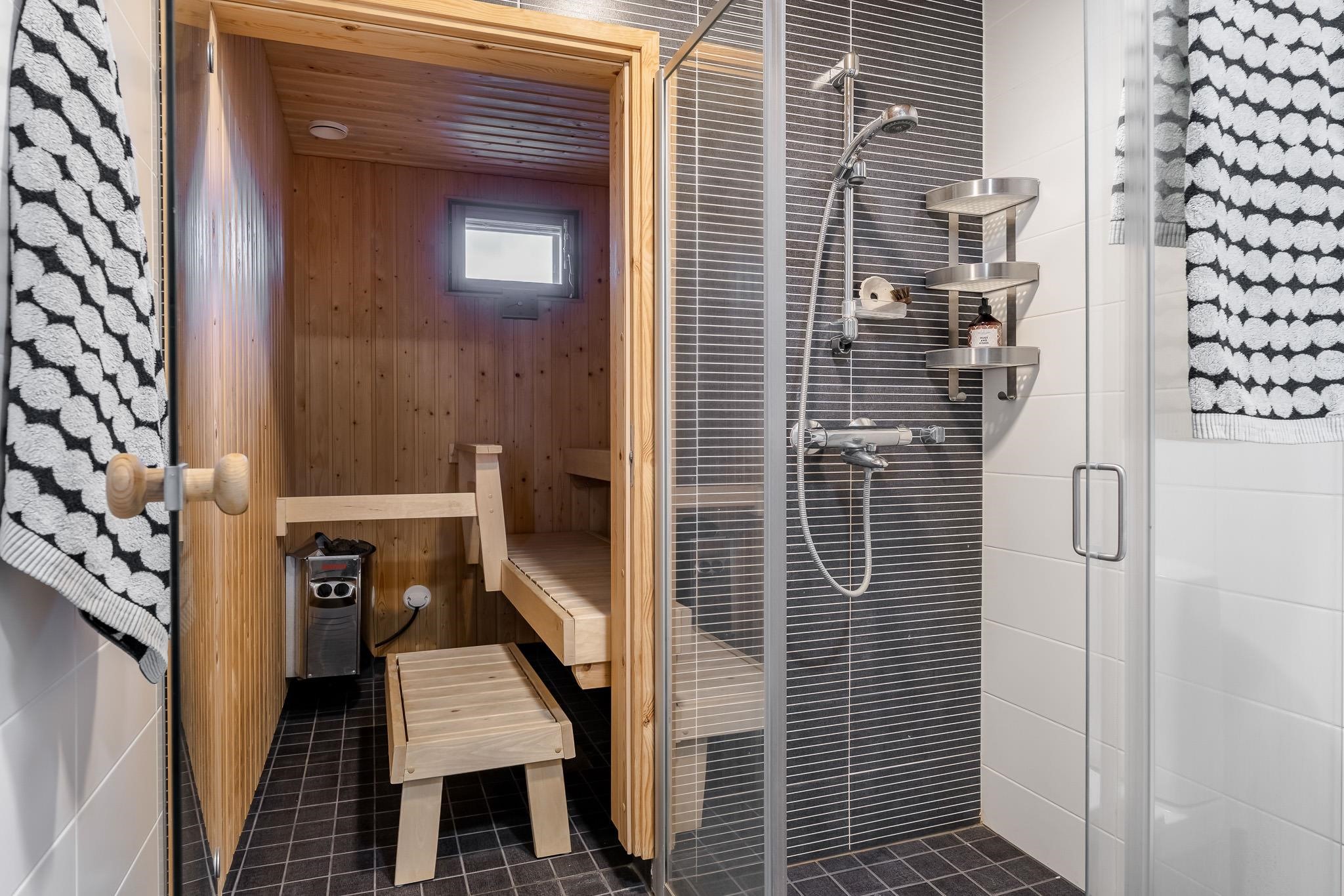 Yläkerrassa on kaksi makuuhuonetta ja päämakuuhuoneesta on kulku parvekkeelle. Yläkerran kylpyhuone- ja saunatila on tyylikäs. Luksusta tuo erillinen kodinhoitohuone, jossa pyykkihuolto hoituu vaivattomasti.