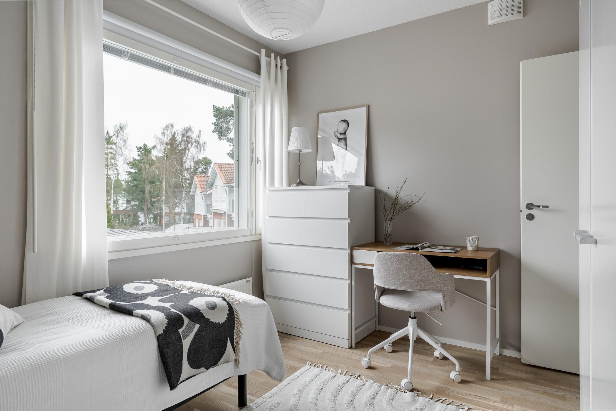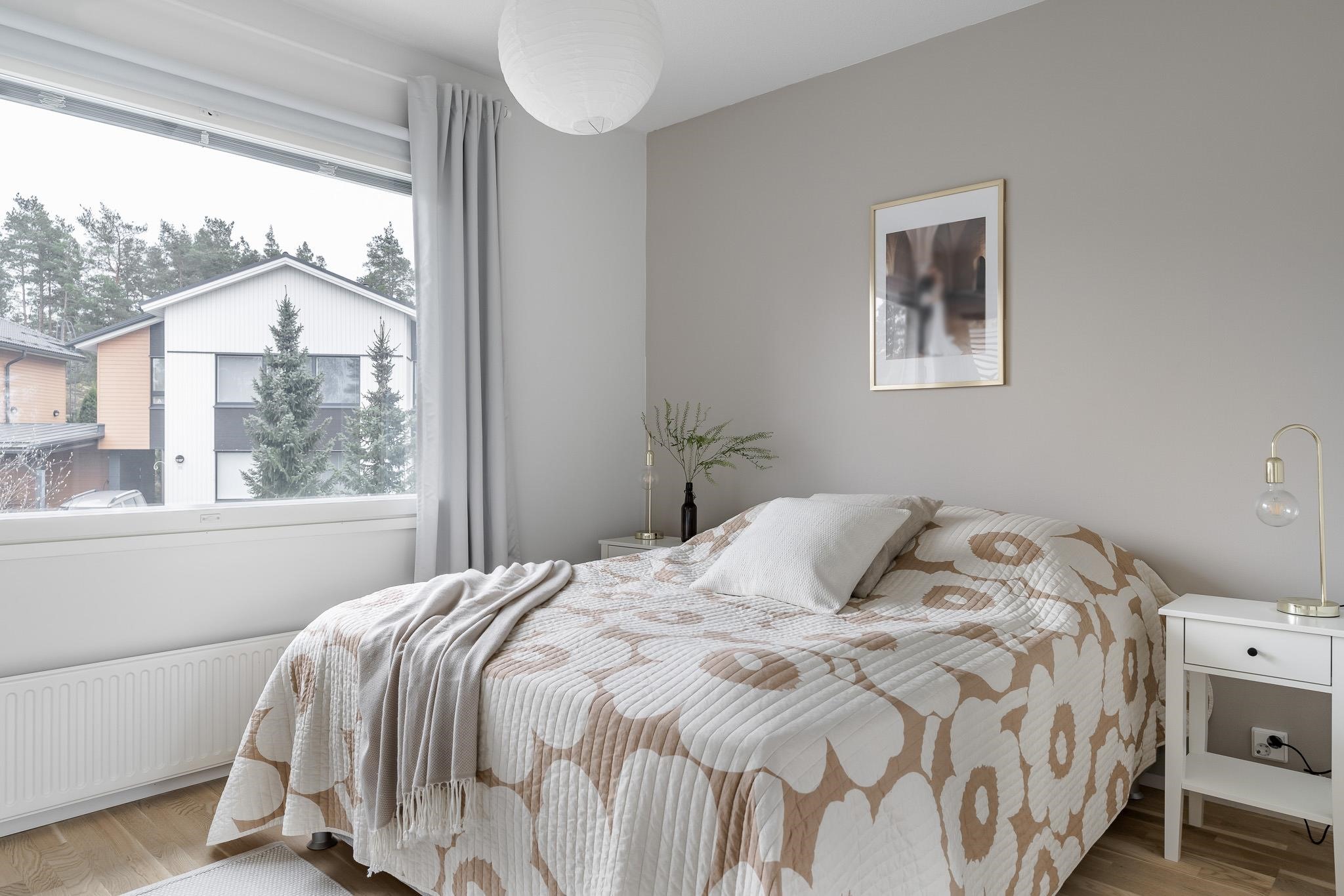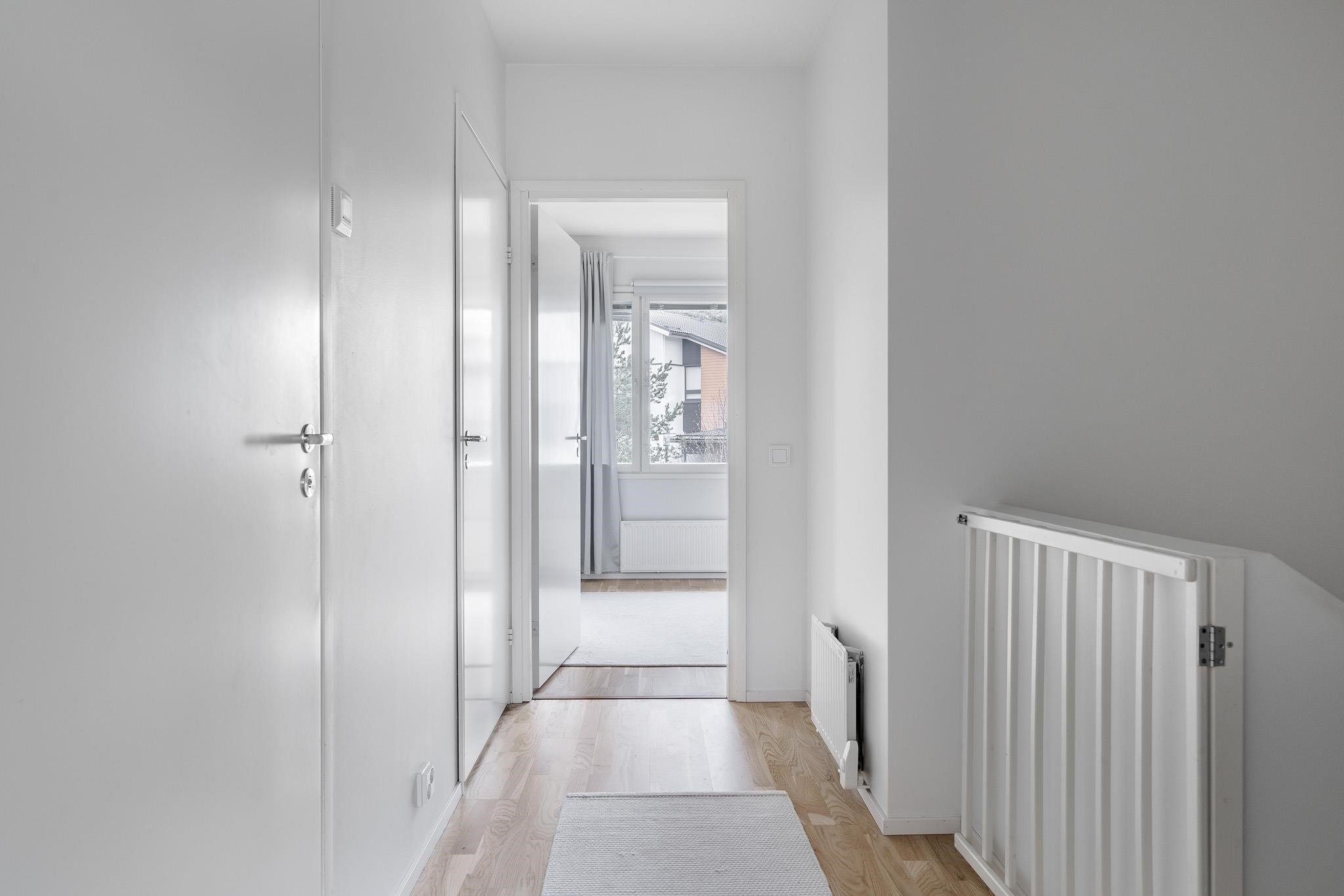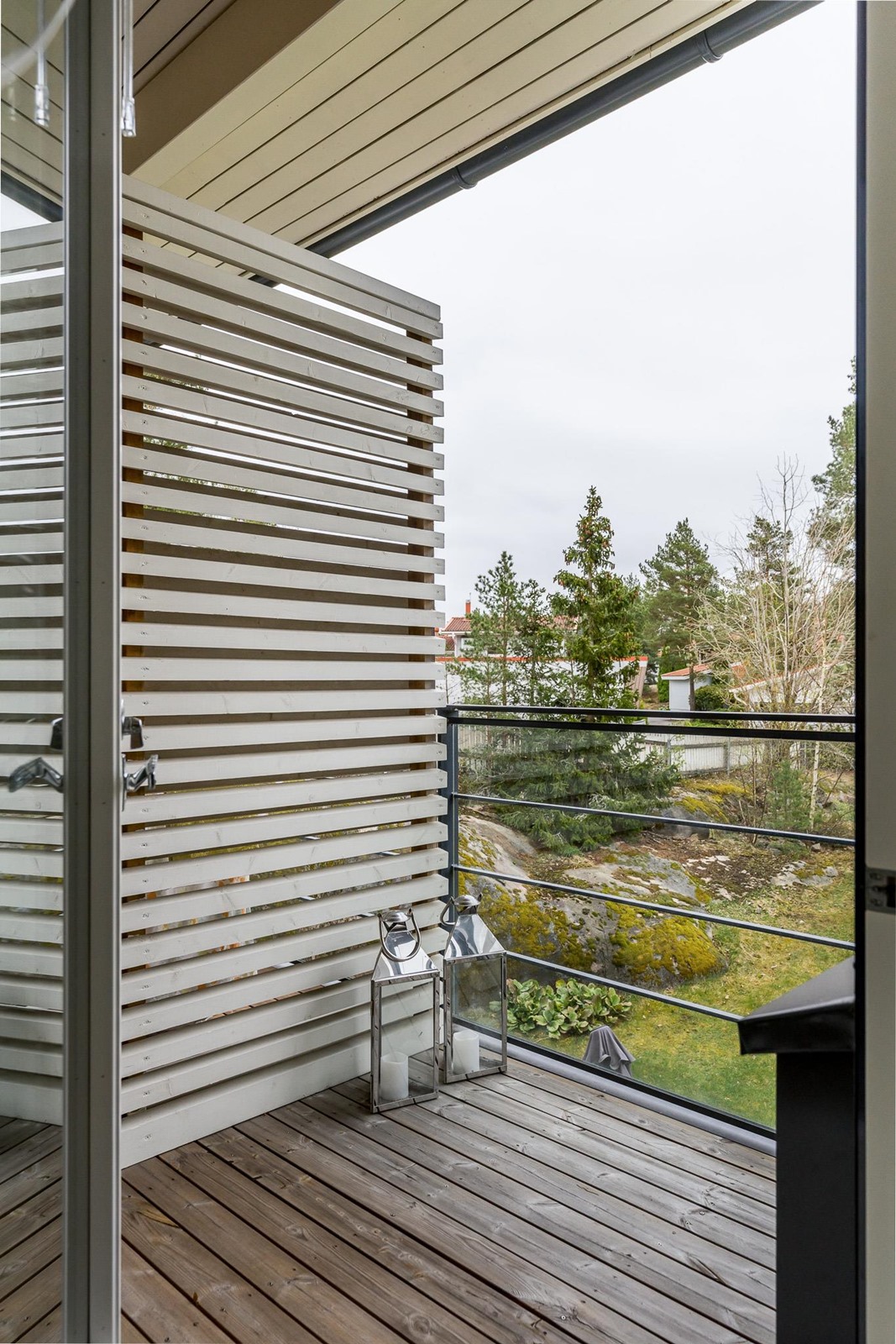 Yläkerrassa on kaksi makuuhuonetta ja päämakuuhuoneesta on kulku parvekkeelle. Yläkerran kylpyhuone- ja saunatila on tyylikäs. Luksusta tuo erillinen kodinhoitohuone, jossa pyykkihuolto hoituu vaivattomasti.