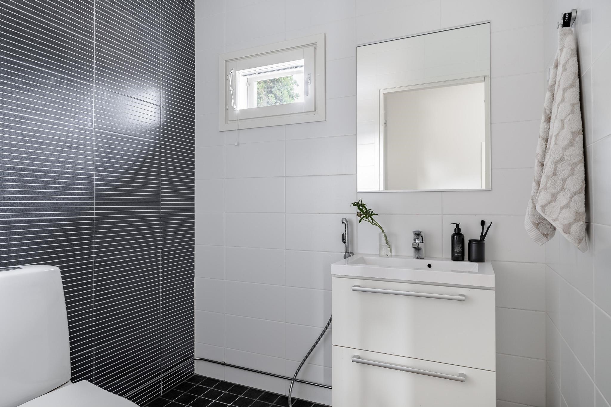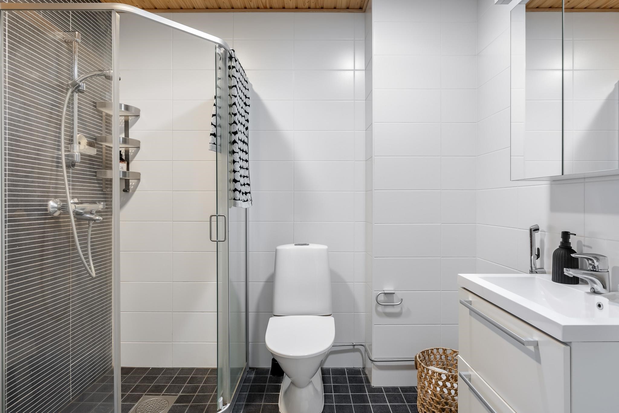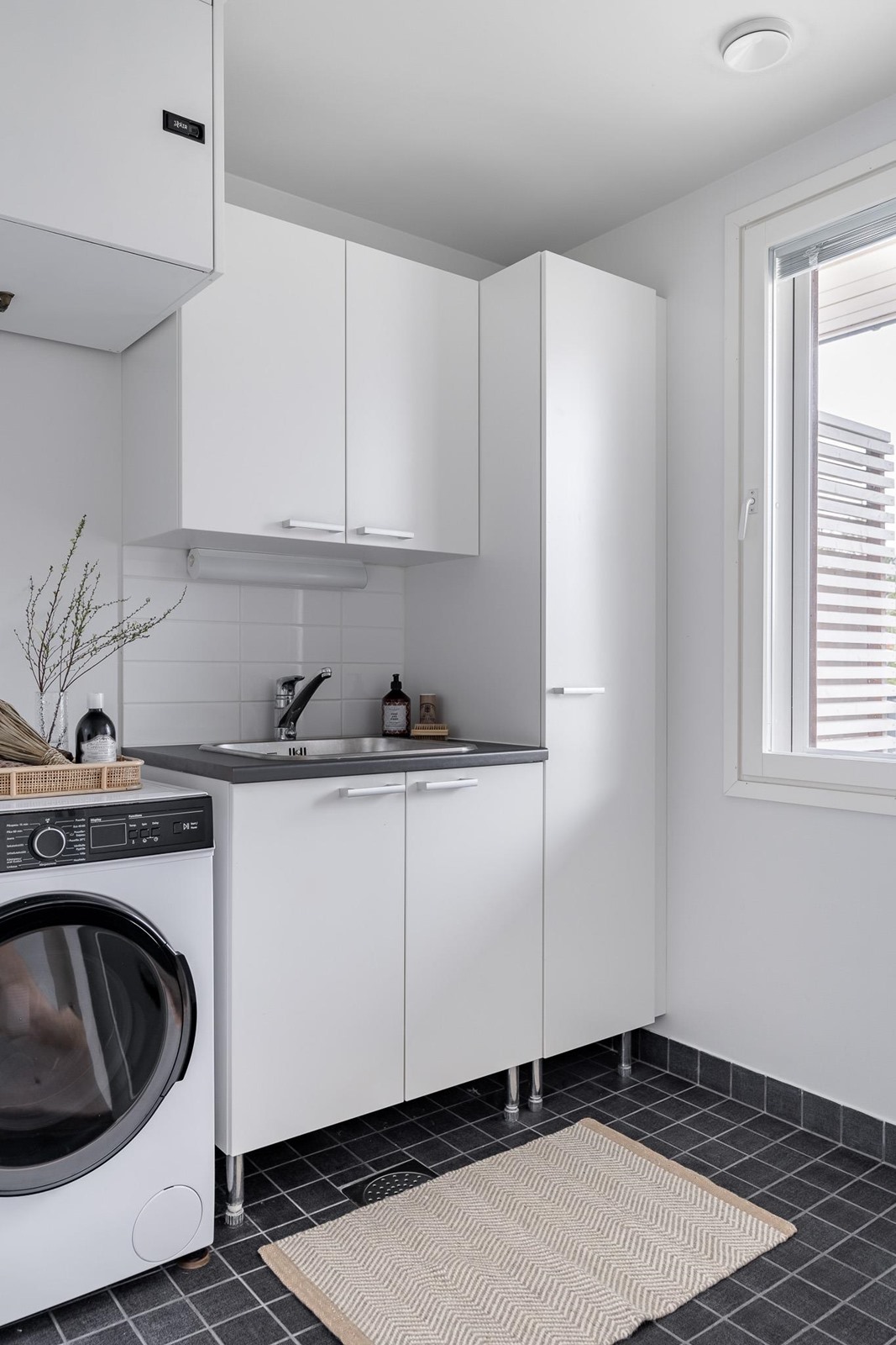 - - Kylpyhuone: suihku, suihkuseinät ovella, allas, allaskaappi, peilikaappi, wc-istuin ja bide. - Sauna: ikkuna ja sähkökiuas. - Erillinen wc: allas, allaskaappi, bide, peili, ikkuna ja wc-istuin. - Kodinhoitohuone: pesukoneliitäntä, allas, allaskaappi, kaapistot, ikkuna, LTO ja vesivaraaja. - Lattialämmitys: Kph/wc, khh, wc ja tk.