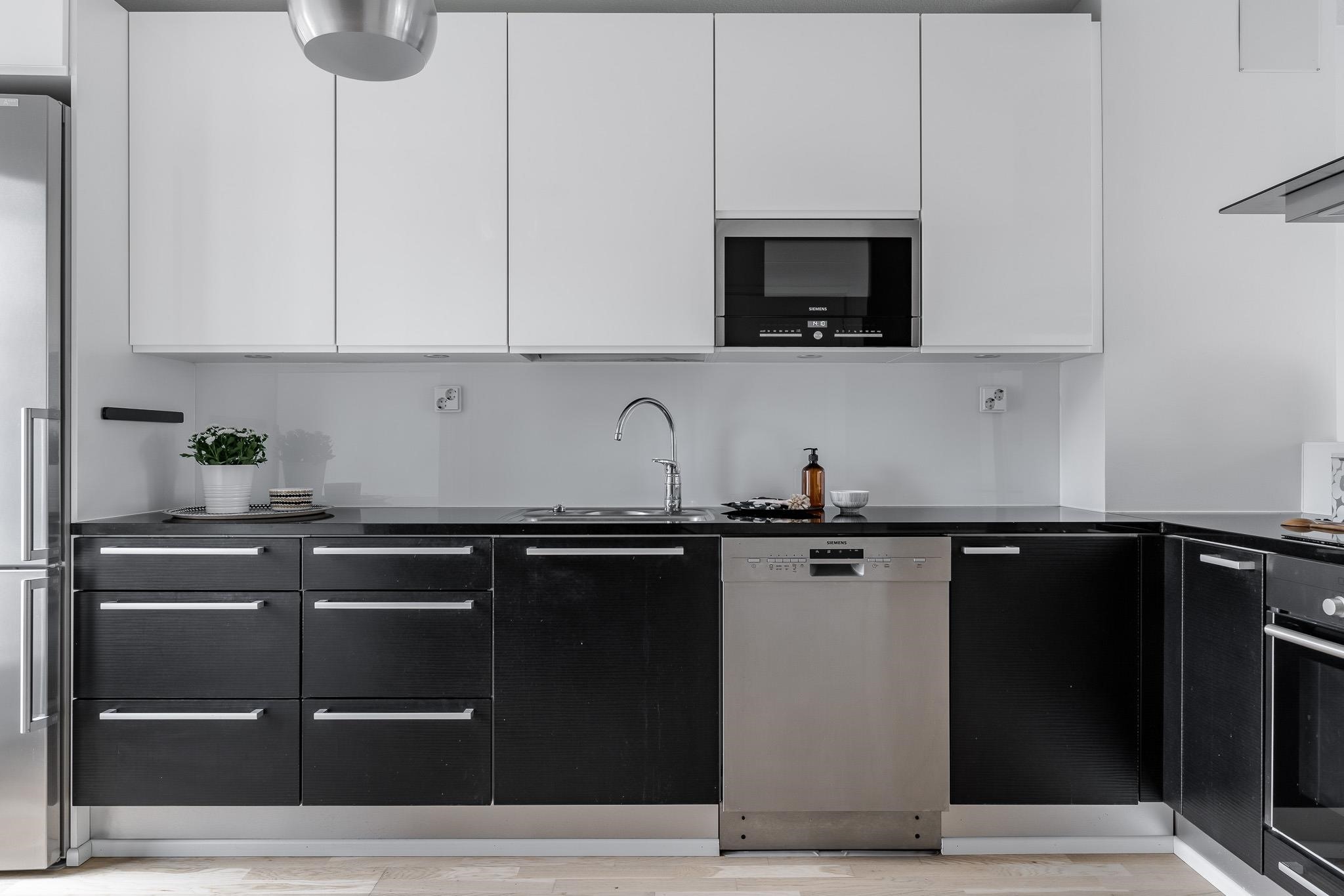 - - Jääkaappipakastin, induktioliesi, liesituuletin, mikroaaltouuni integroitu, astianpesukone, kaapistot ja kiinteät valaisimet.