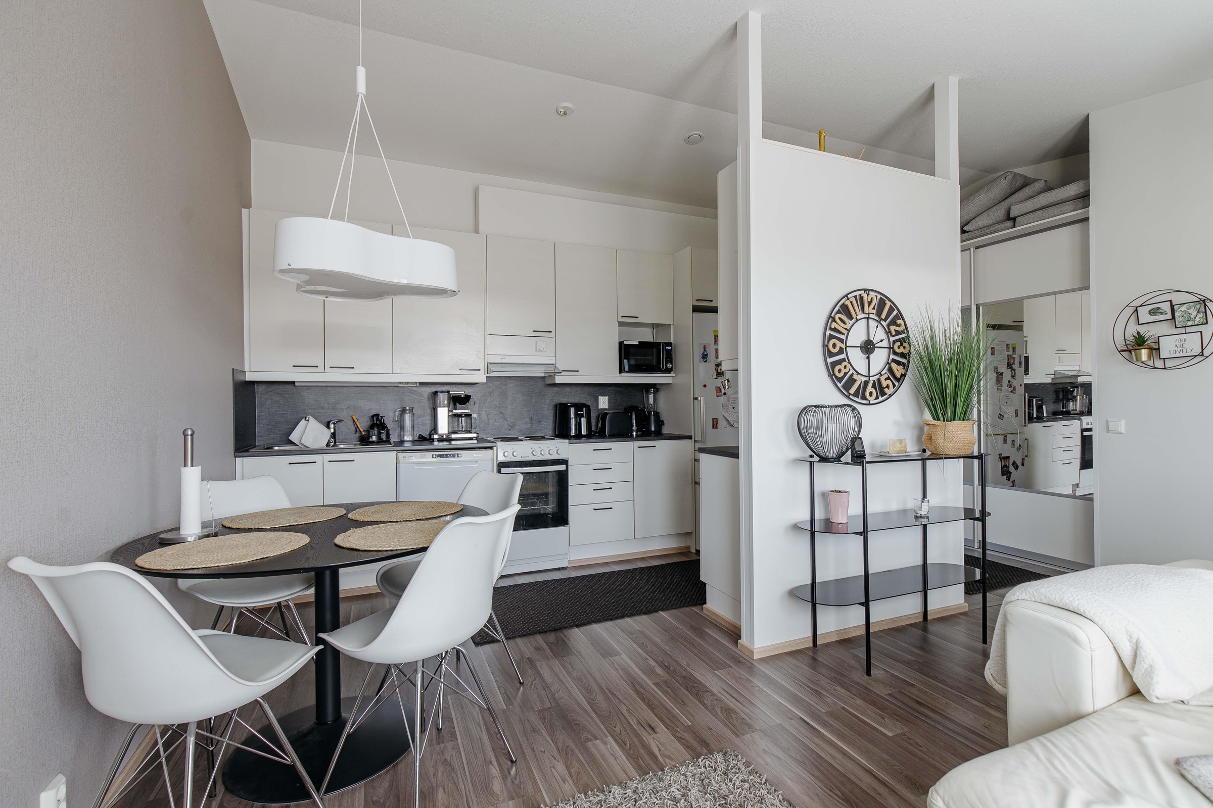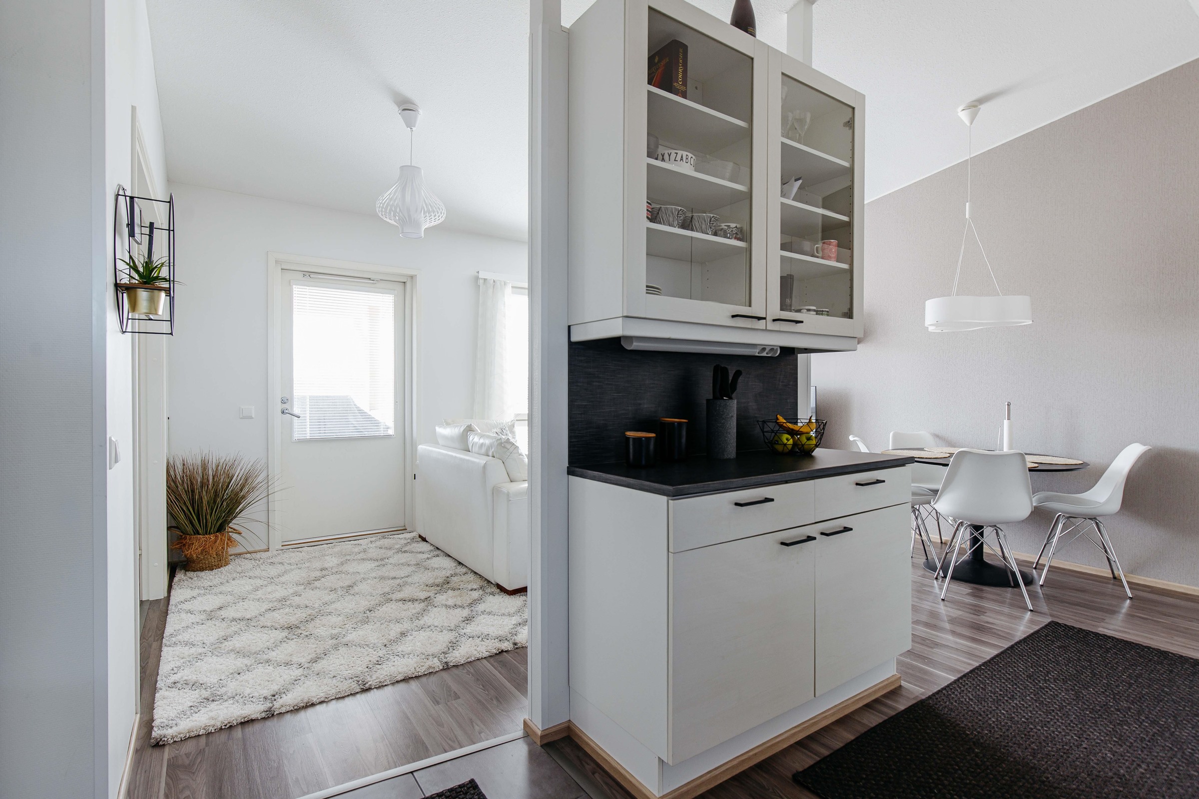 - Jääkaappipakastin, sähköliesi, liesituuletin, astianpesukone, kaapistot, kiinteät valaisimet.