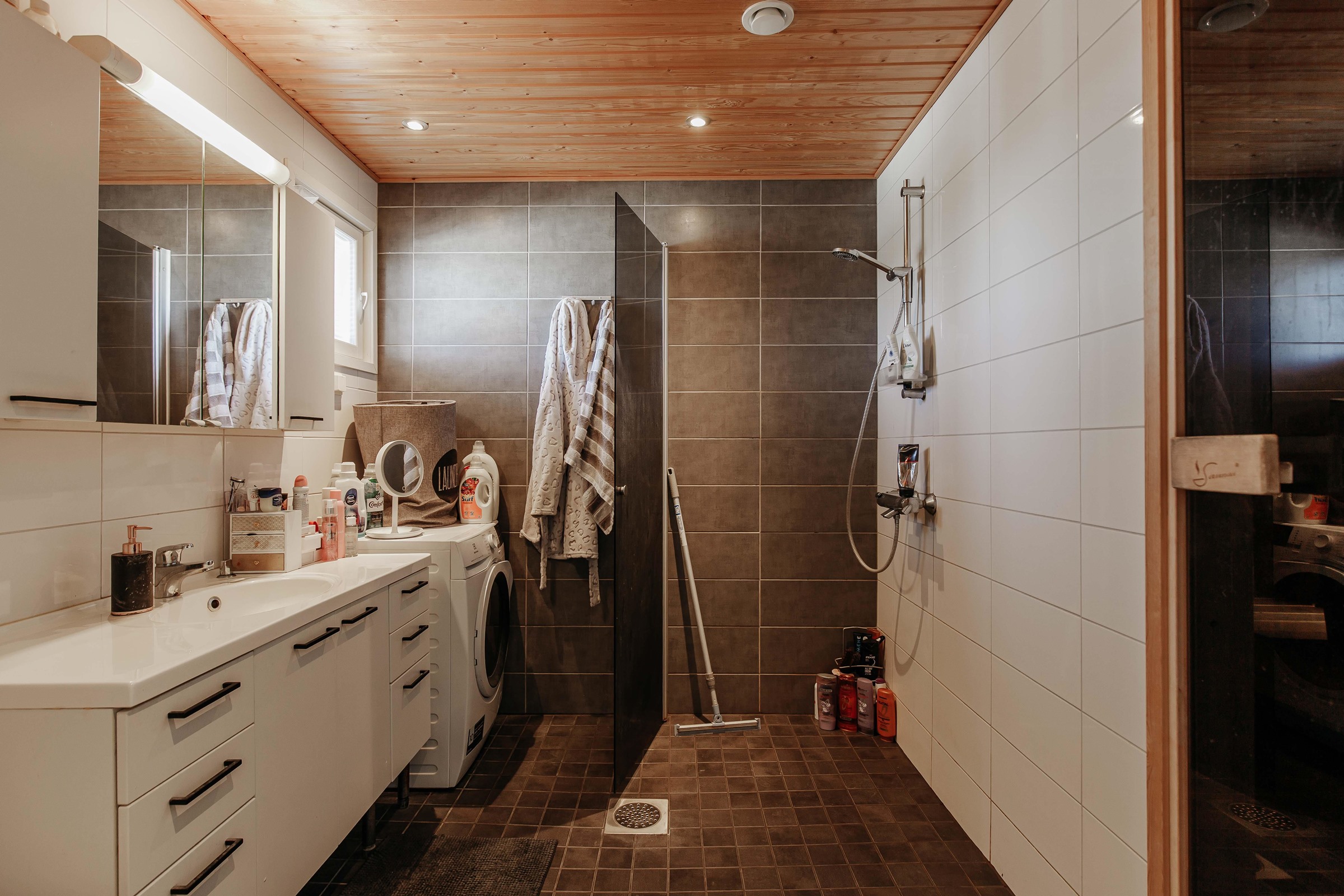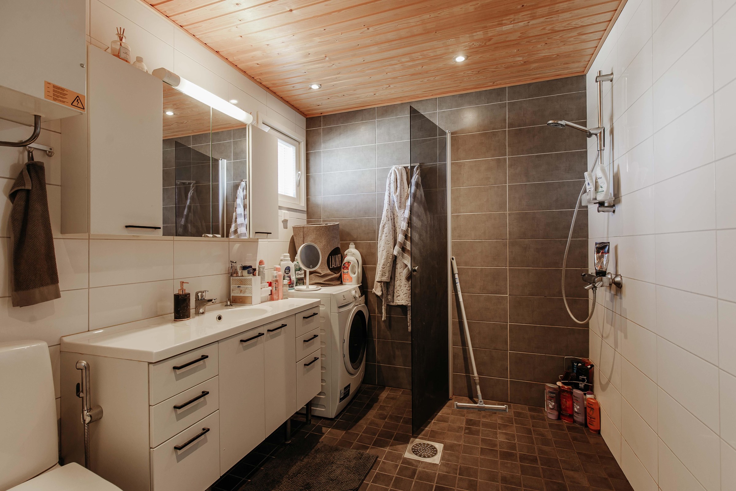 - Sauna, sähkökiuas, kylpyhuone, suihku, suihkuseinä, peilikaappi, kaapit, allaskaappi, pesukoneliitäntä, lattialämmitys, kiinteät valaisimet.