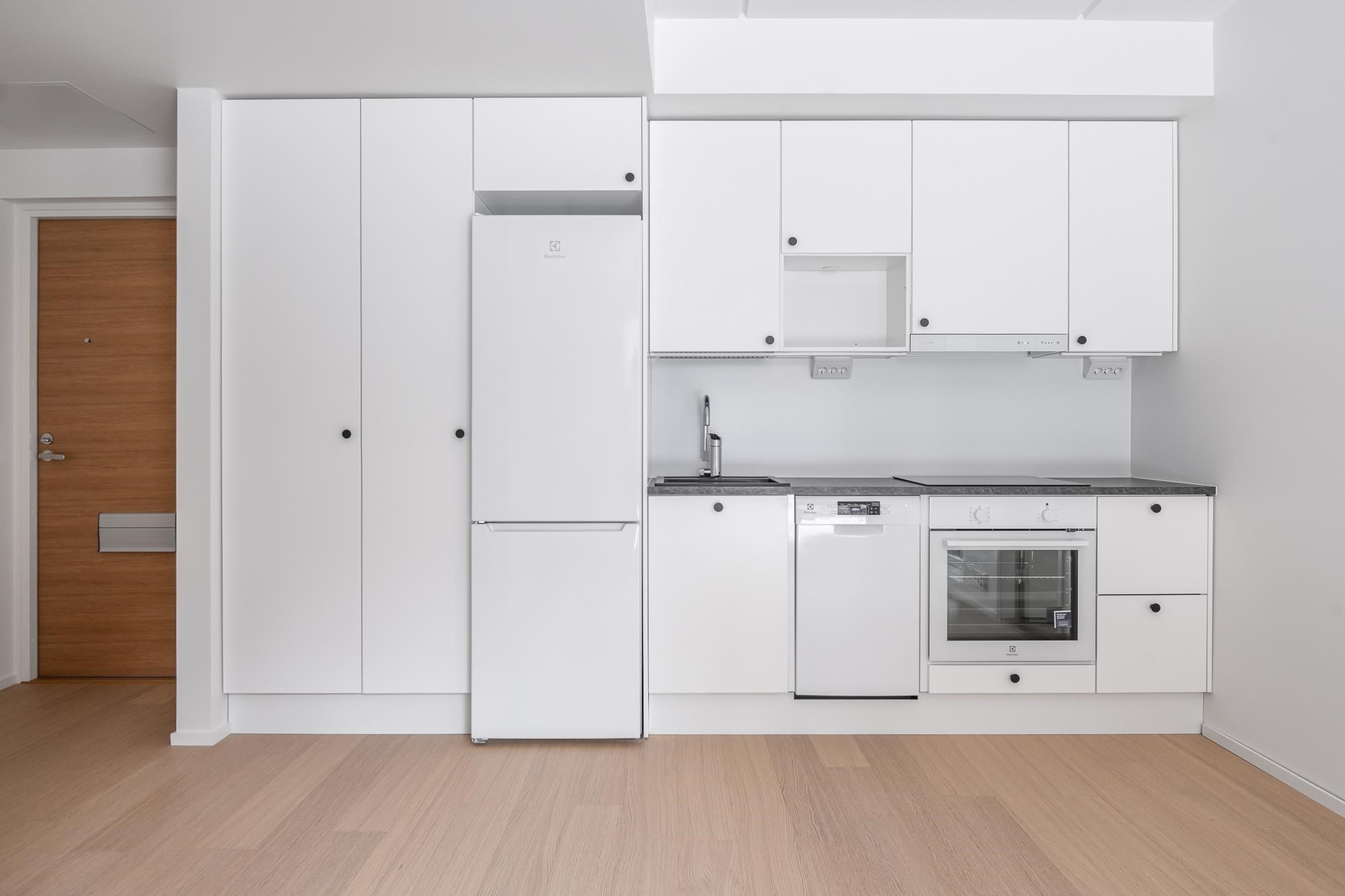 - Jääkaappipakastin, induktioliesitaso, liesikupu, astianpesukone, kaapistot, kiinteät valaisimet. Tilavaraus mikroaaltouunille.Työpöytätasot ovat laminaattipintaisia, välitilassa laminaatti. Keittiön altaat ovat komposiittia ja tasoon upotettuja. Huoneiston koosta riippuen liesitaso Domino tai 60 cm, astianpesukone 45 cm tai 60 cm.