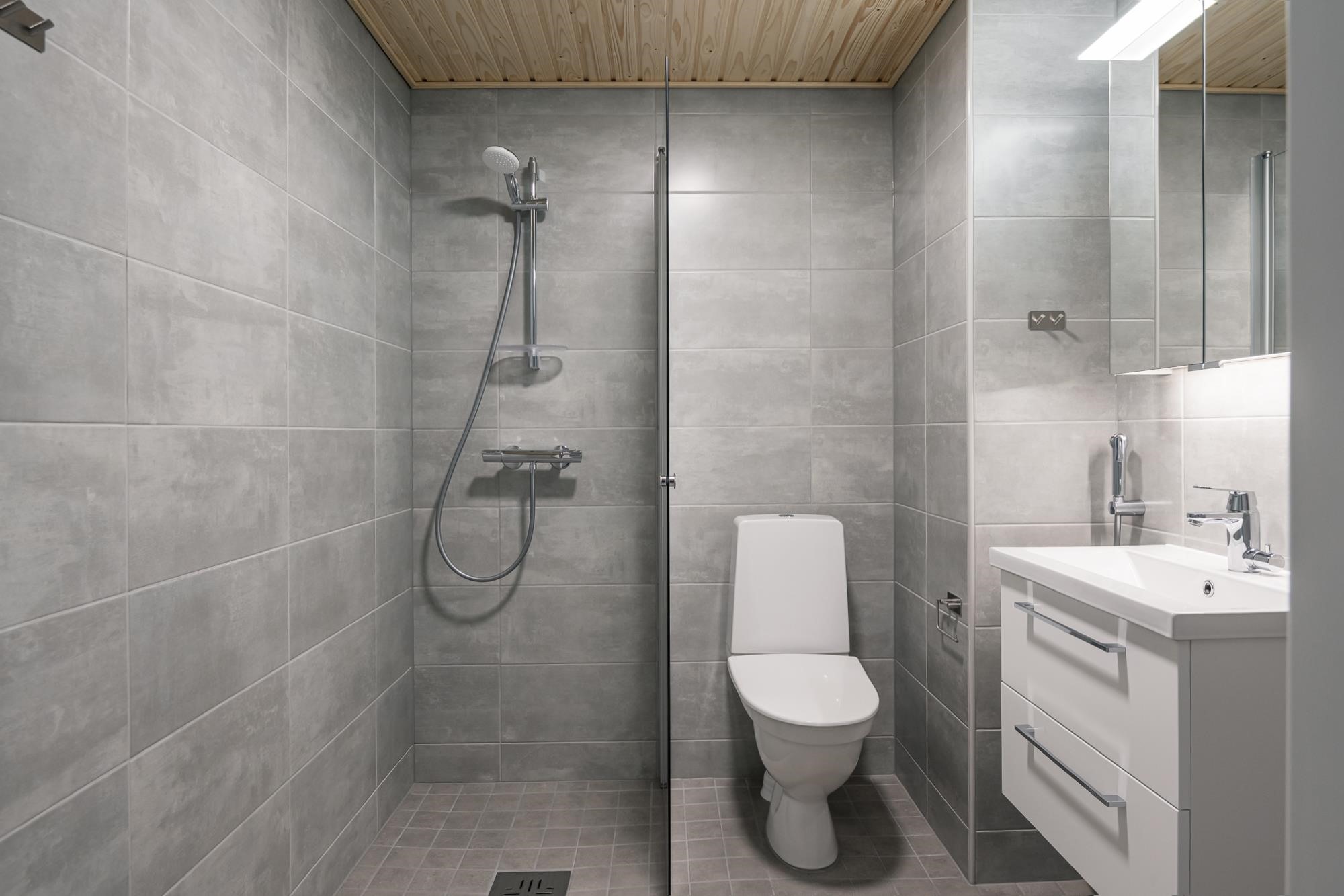 - Kylpyhuoneessa suihku (suihkunurkka tai suihkuseinä), valaisinpeilikaappi, allaslaatikosto. Pesukoneliitäntä, tilavaraus pyykinpesukoneelle ja kuivausrummulle. Mukavuuslattialämmitys (sähkö huoneiston sähköstä). Kiinteät valaisimet. Huoneistoissa missä sauna, sähkökiuas ja kokolasiovi.