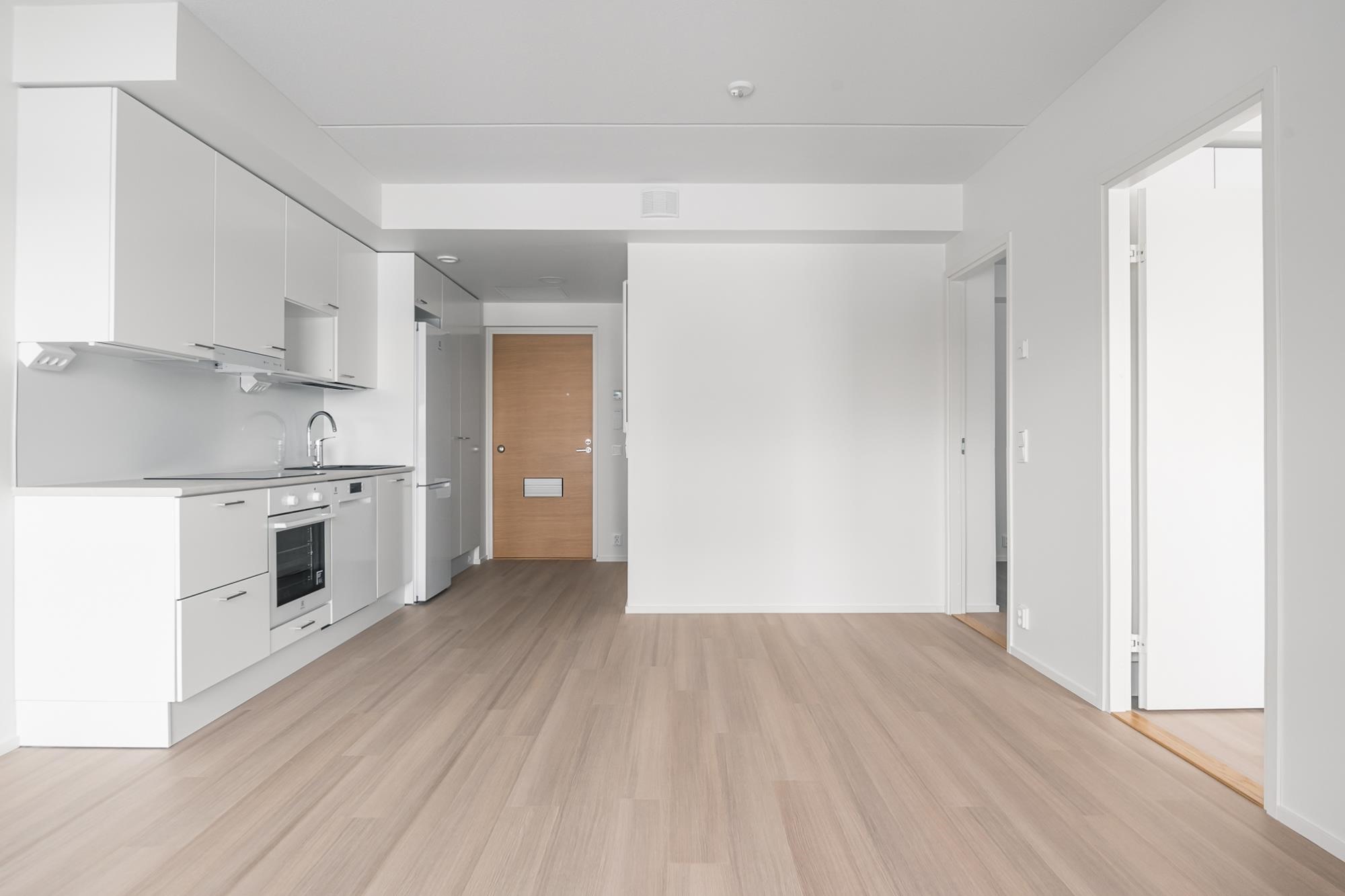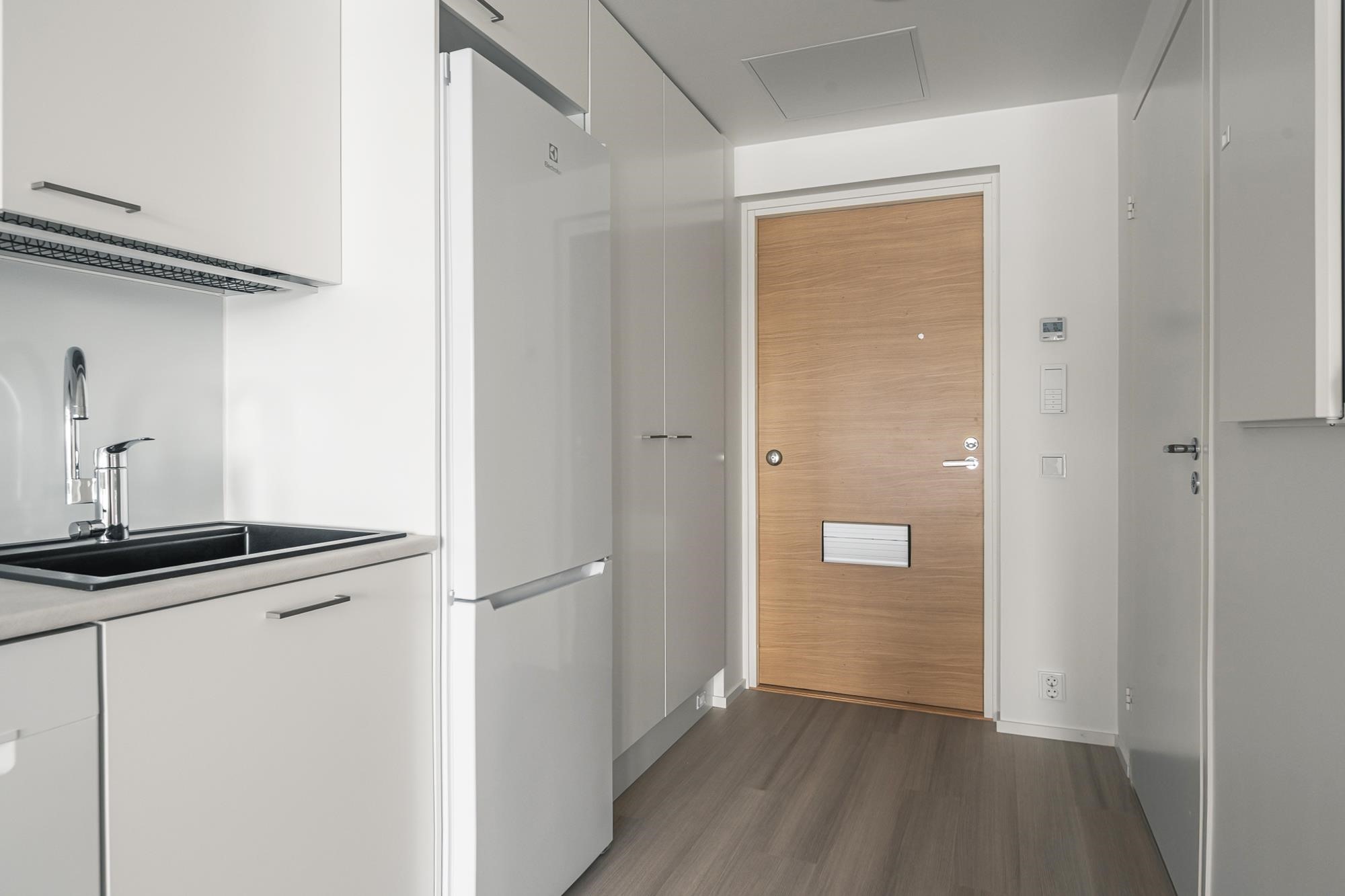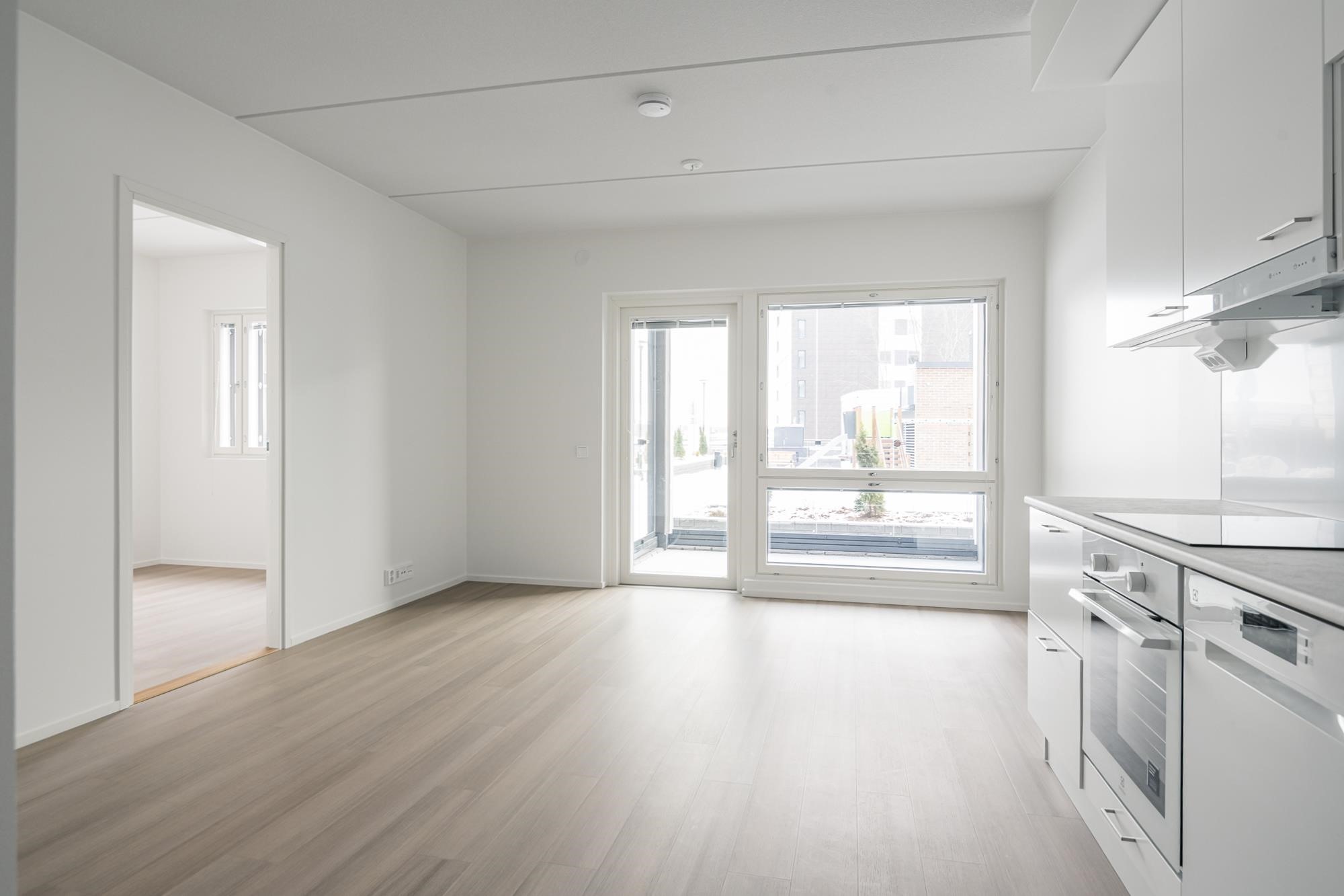 - Jääkaappipakastin, induktioliesitaso, liesikupu, astianpesukone, kaapistot, kiinteät valaisimet. Tilavaraus mikroaaltouunille.Työpöytätasot ovat laminaattipintaisia, välitilassa laminaatti. Keittiön altaat ovat komposiittia ja tasoon upotettuja. Huoneiston koosta riippuen liesitaso Domino tai 60 cm, astianpesukone 45 cm tai 60 cm.