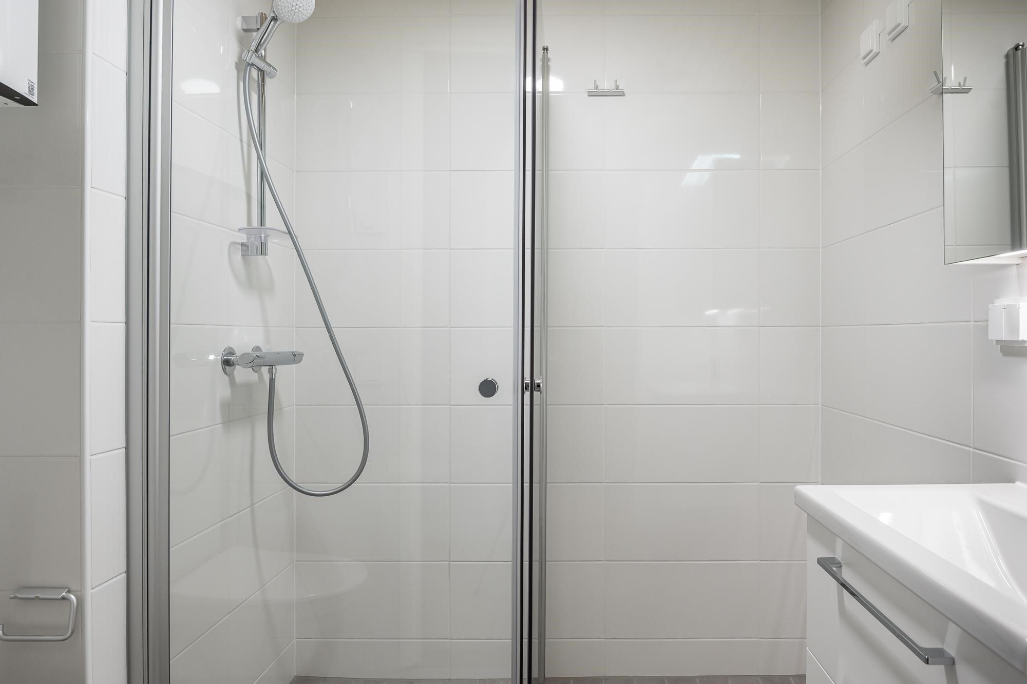 - Kylpyhuoneessa suihku (suihkunurkka tai suihkuseinä), valaisinpeilikaappi, allaslaatikosto. Pesukoneliitäntä, tilavaraus pyykinpesukoneelle ja kuivausrummulle. Mukavuuslattialämmitys (sähkö huoneiston sähköstä). Kiinteät valaisimet. Huoneistoissa missä sauna, sähkökiuas ja kokolasiovi.