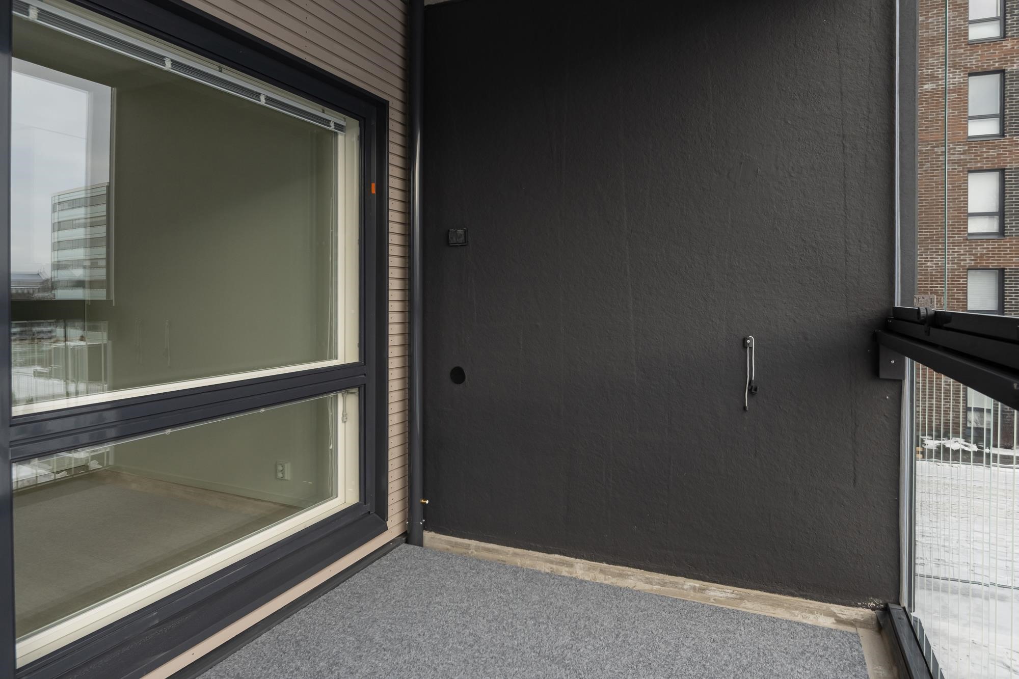 - Parveke varustetaan harmaalla terassimatolla. Parvekekaiteet ovat metalli-runkoisia lasikaiteita. Parvekkeet varustetaan lasituksella, lasin sävy kirkas. Kokonaan lasitettu parveke on tuulettuvaa ulkotilaa, se ei ole vesi- tai lumitiivis tila.