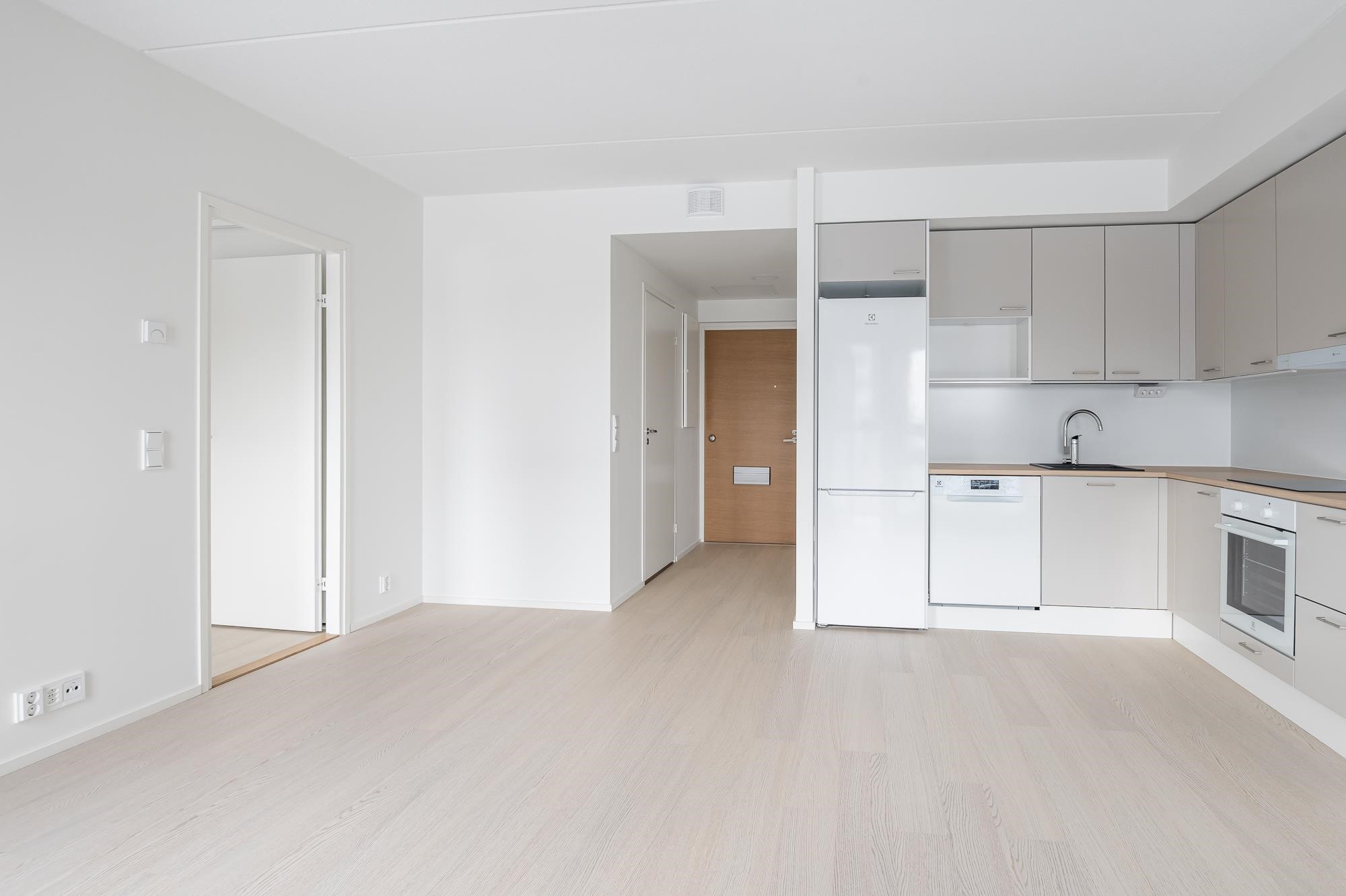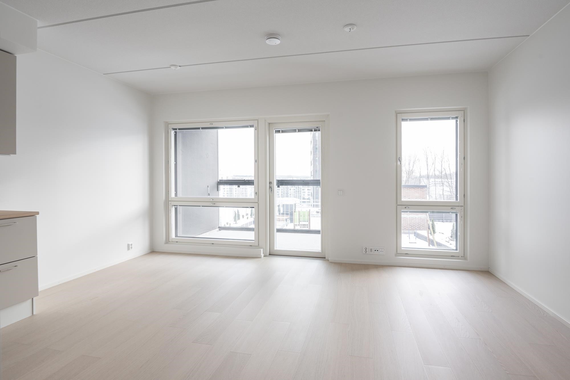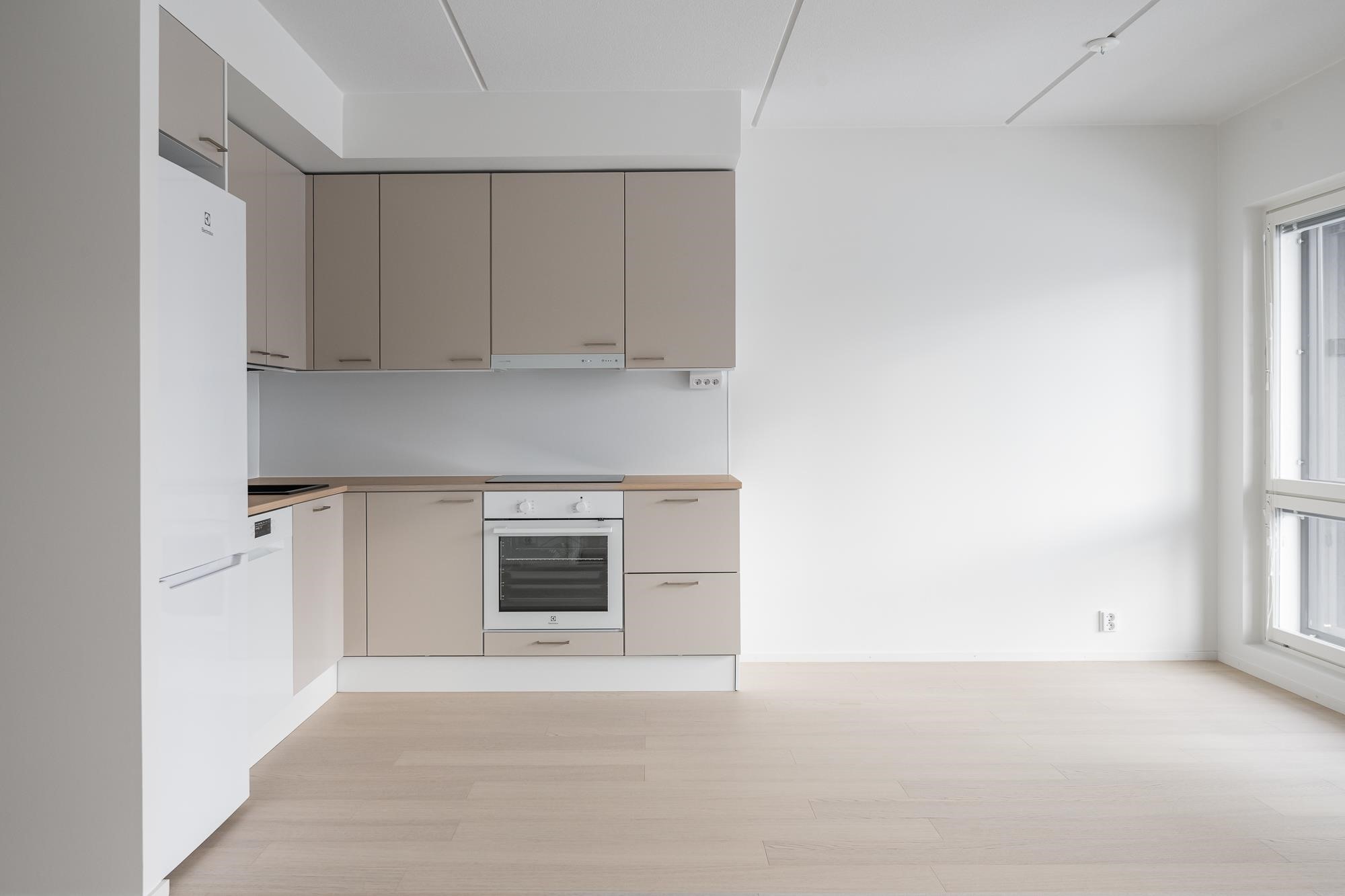 - Jääkaappipakastin, induktioliesitaso, liesikupu, astianpesukone, kaapistot, kiinteät valaisimet. Tilavaraus mikroaaltouunille.Työpöytätasot ovat laminaattipintaisia, välitilassa laminaatti. Keittiön altaat ovat komposiittia ja tasoon upotettuja. Huoneiston koosta riippuen liesitaso Domino tai 60 cm, astianpesukone 45 cm tai 60 cm.