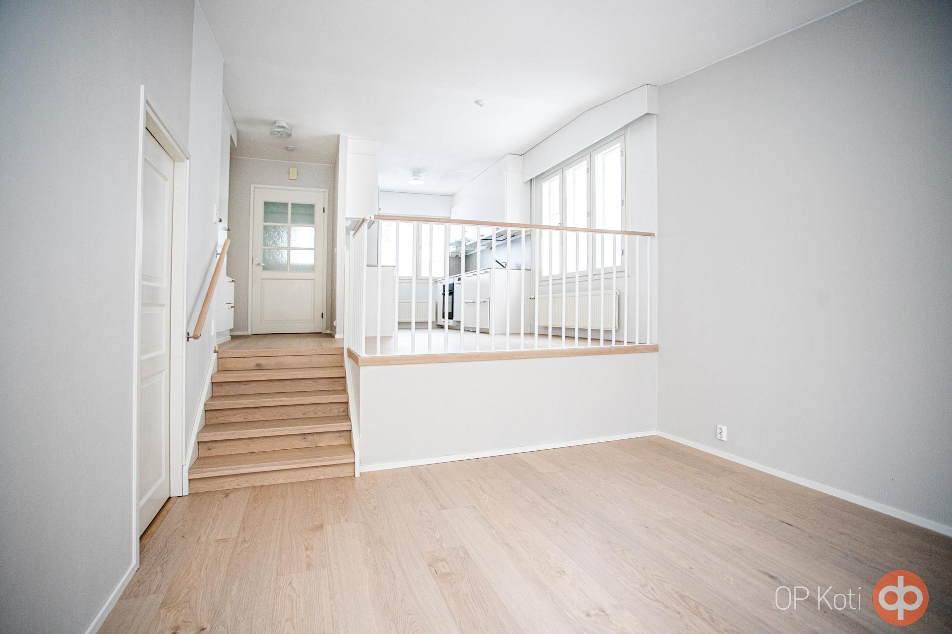Tämä koti on valoisa ja neliöitään suuremman oloinen korkean huonekorkeuden vuoksi. Sisääntulotasolla sijaitsevat keittiö ja tilava kylpyhuone sekä oma sauna. Muutama porras alas ja sieltä löytyvät hyvän kokoiset olohuone ja makuuhuone. Olohuoneesta on käynti suojaisalle pihalle, jolla kohta perennat puhkeavat kukkaan.