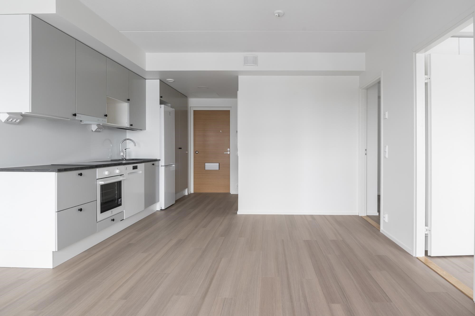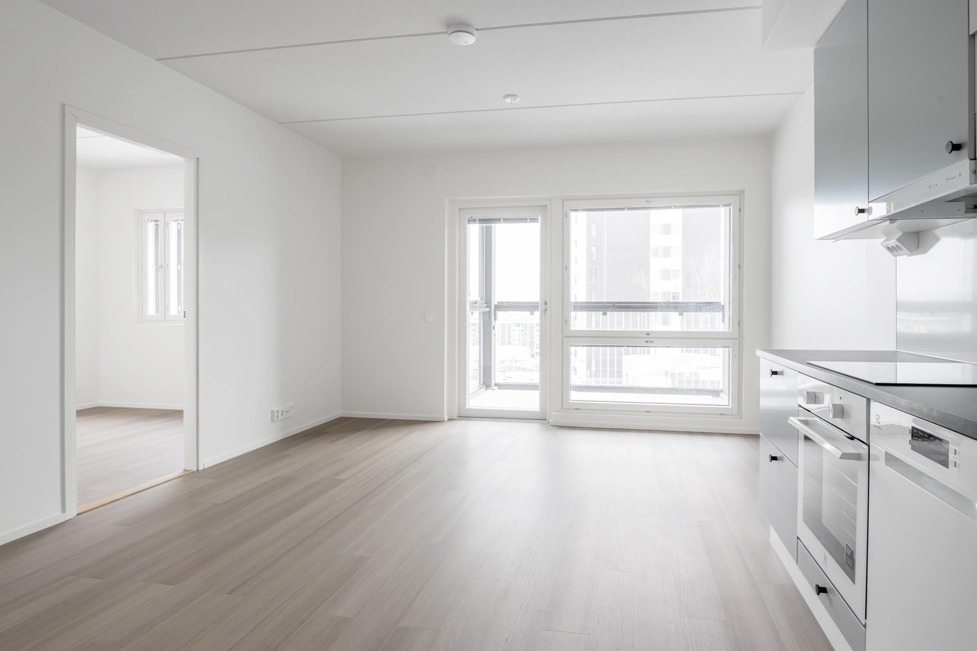- Jääkaappipakastin, induktioliesitaso, liesikupu, astianpesukone, kaapistot, kiinteät valaisimet. Tilavaraus mikroaaltouunille.Työpöytätasot ovat laminaattipintaisia, välitilassa laminaatti. Keittiön altaat ovat komposiittia ja tasoon upotettuja. Huoneiston koosta riippuen liesitaso Domino tai 60 cm, astianpesukone 45 cm tai 60 cm.