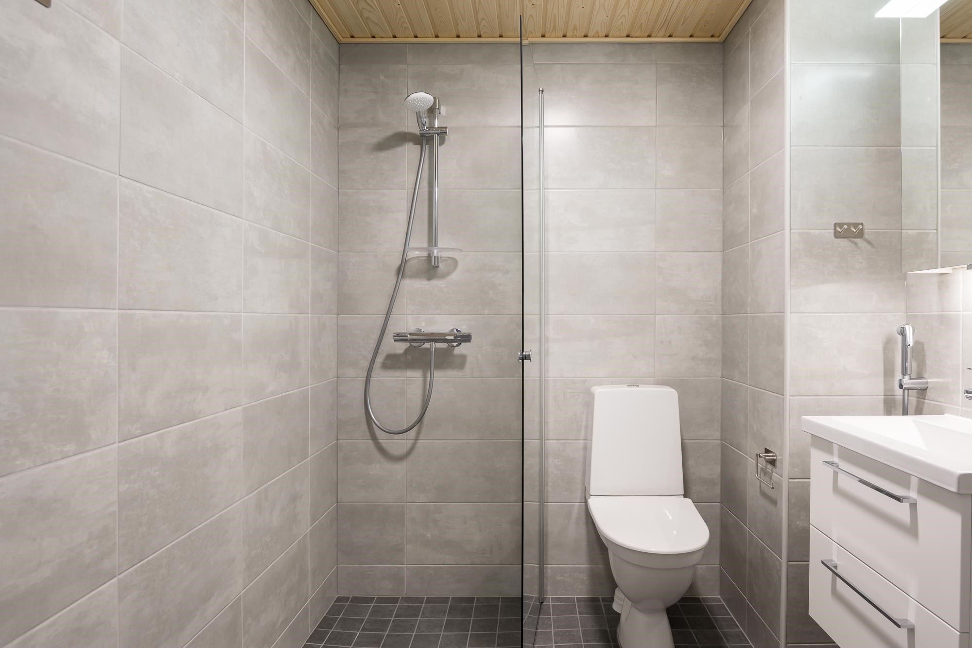 - Kylpyhuoneessa suihku (suihkunurkka tai suihkuseinä), valaisinpeilikaappi, allaslaatikosto. Pesukoneliitäntä, tilavaraus pyykinpesukoneelle ja kuivausrummulle. Mukavuuslattialämmitys (sähkö huoneiston sähköstä). Kiinteät valaisimet. Huoneistoissa missä sauna, sähkökiuas ja kokolasiovi.