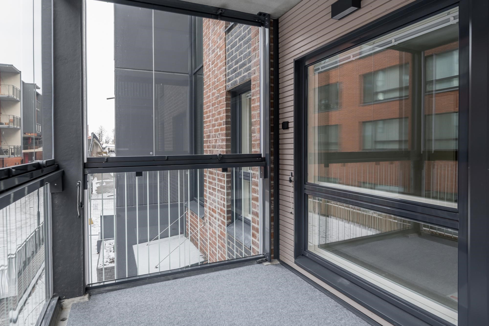 - Parveke varustetaan harmaalla terassimatolla. Parvekekaiteet ovat metalli-runkoisia lasikaiteita. Parvekkeet varustetaan lasituksella, lasin sävy kirkas. Kokonaan lasitettu parveke on tuulettuvaa ulkotilaa, se ei ole vesi- tai lumitiivis tila.