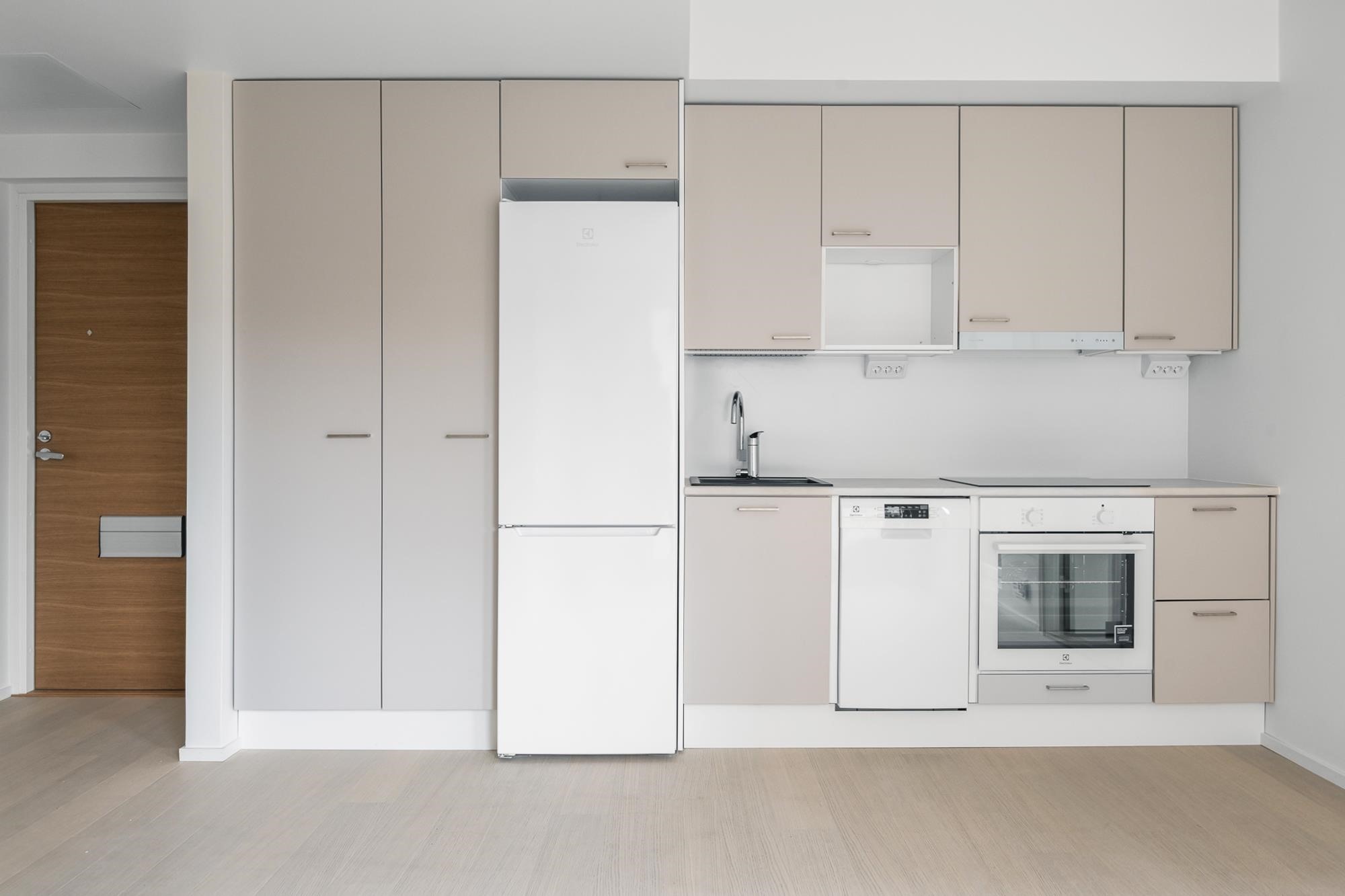 - Jääkaappipakastin, induktioliesitaso, liesikupu, astianpesukone, kaapistot, kiinteät valaisimet. Tilavaraus mikroaaltouunille.Työpöytätasot ovat laminaattipintaisia, välitilassa laminaatti. Keittiön altaat ovat komposiittia ja tasoon upotettuja. Huoneiston koosta riippuen liesitaso Domino tai 60 cm, astianpesukone 45 cm tai 60 cm.