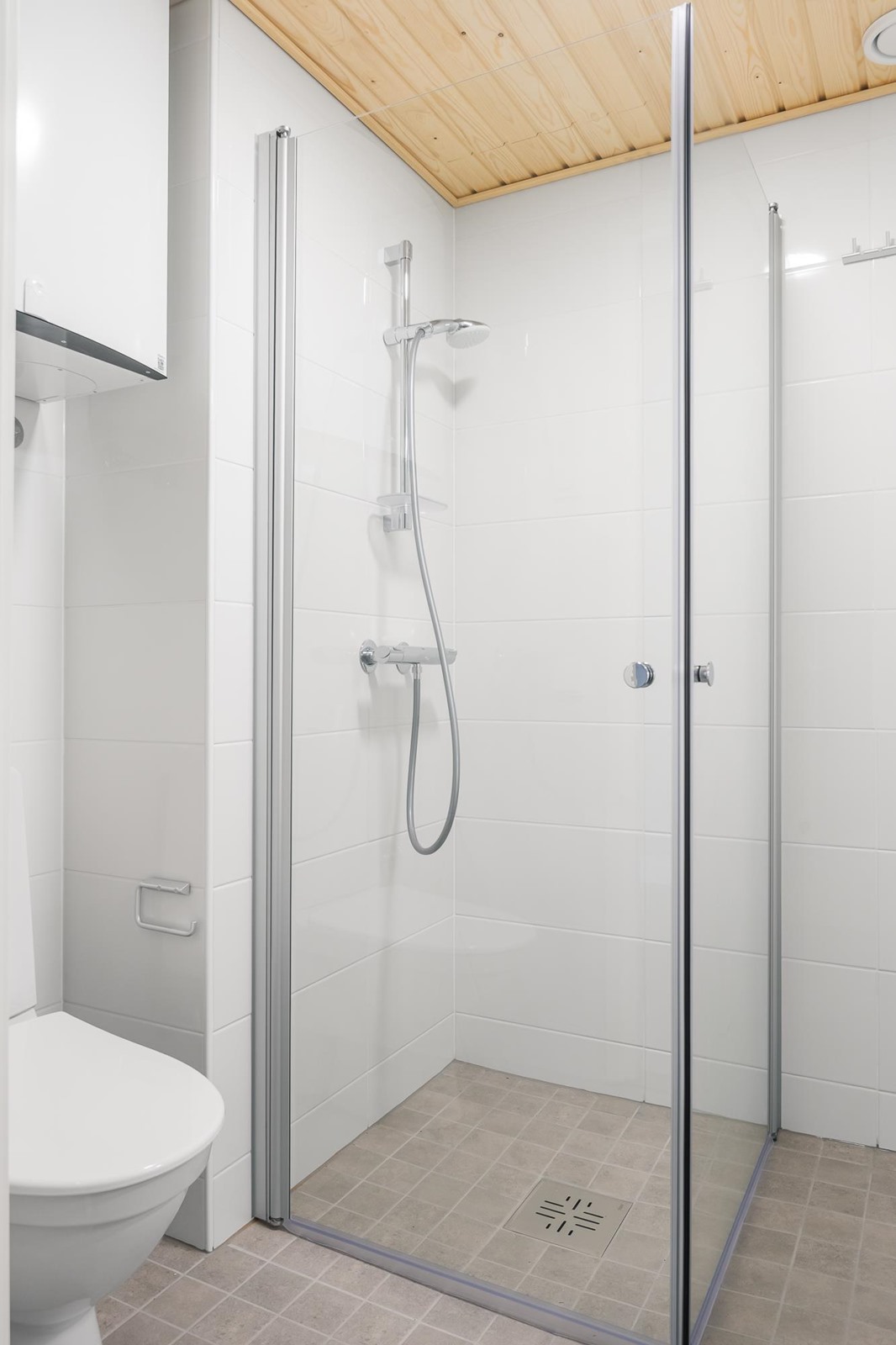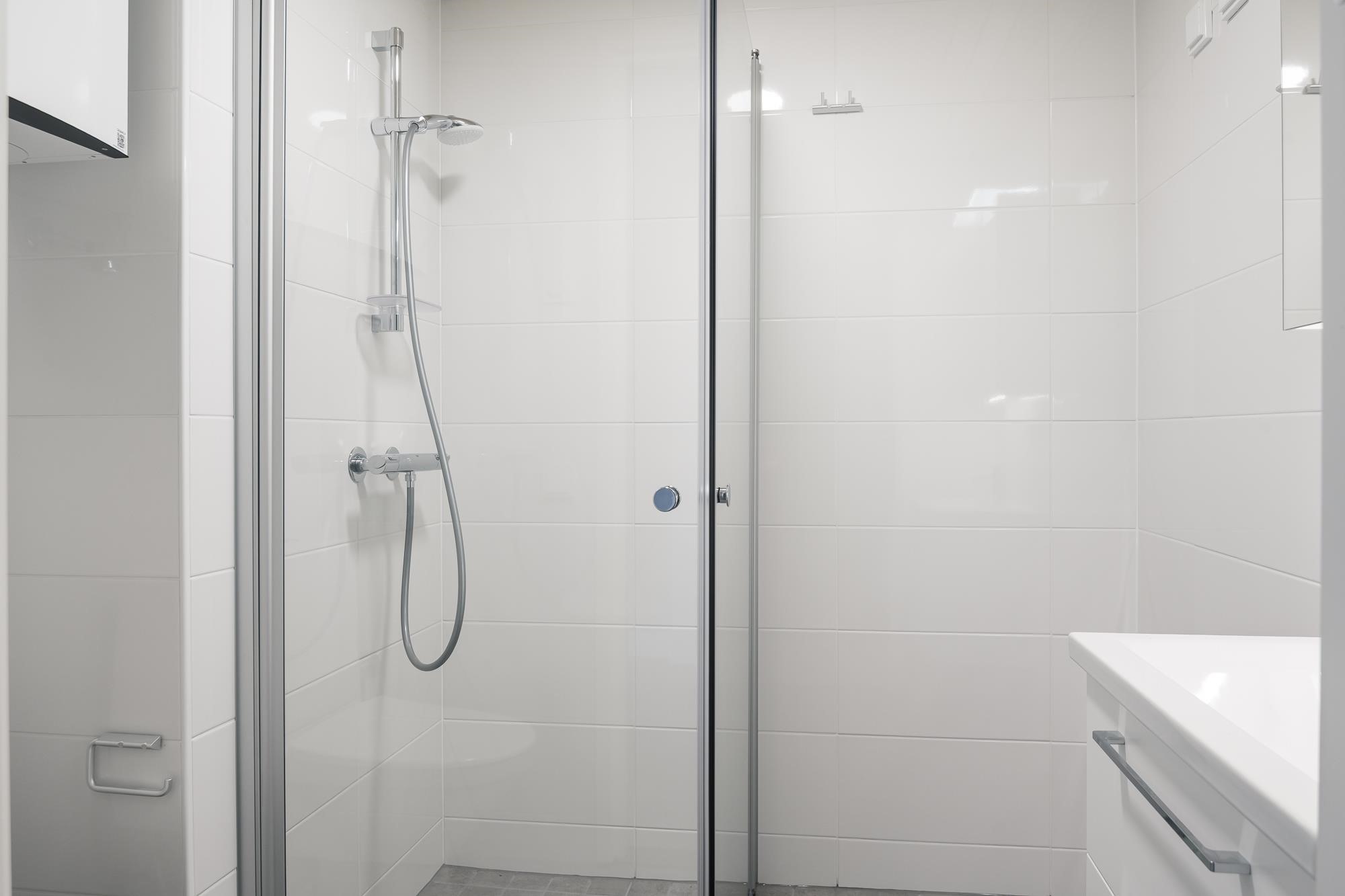 - Kylpyhuoneessa suihku (suihkunurkka tai suihkuseinä), valaisinpeilikaappi, allaslaatikosto. Pesukoneliitäntä, tilavaraus pyykinpesukoneelle ja kuivausrummulle. Mukavuuslattialämmitys (sähkö huoneiston sähköstä). Kiinteät valaisimet. Huoneistoissa missä sauna, sähkökiuas ja kokolasiovi.