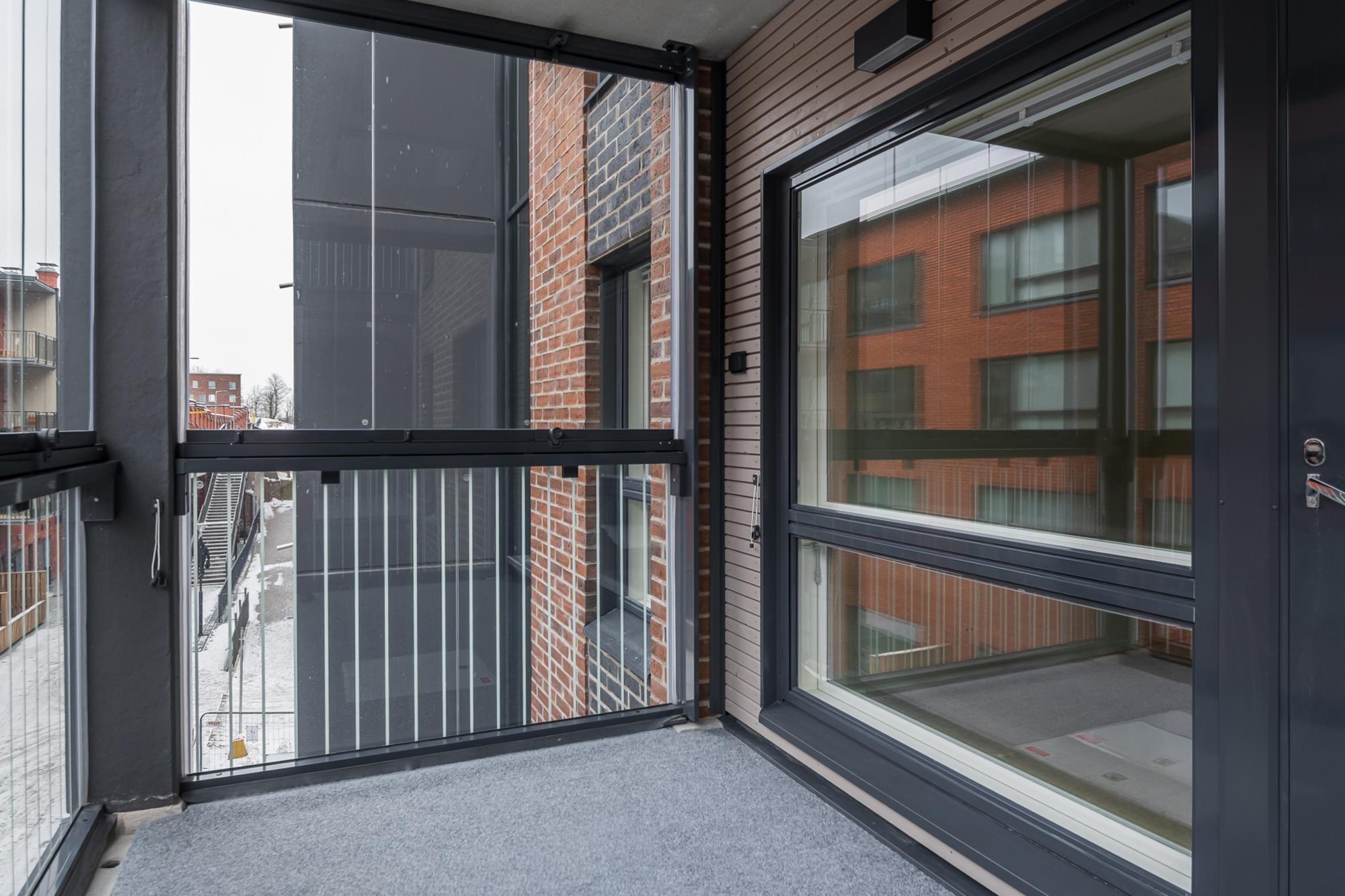 - Parveke varustetaan harmaalla terassimatolla. Parvekekaiteet ovat metalli-runkoisia lasikaiteita. Parvekkeet varustetaan lasituksella, lasin sävy kirkas. Kokonaan lasitettu parveke on tuulettuvaa ulkotilaa, se ei ole vesi- tai lumitiivis tila.