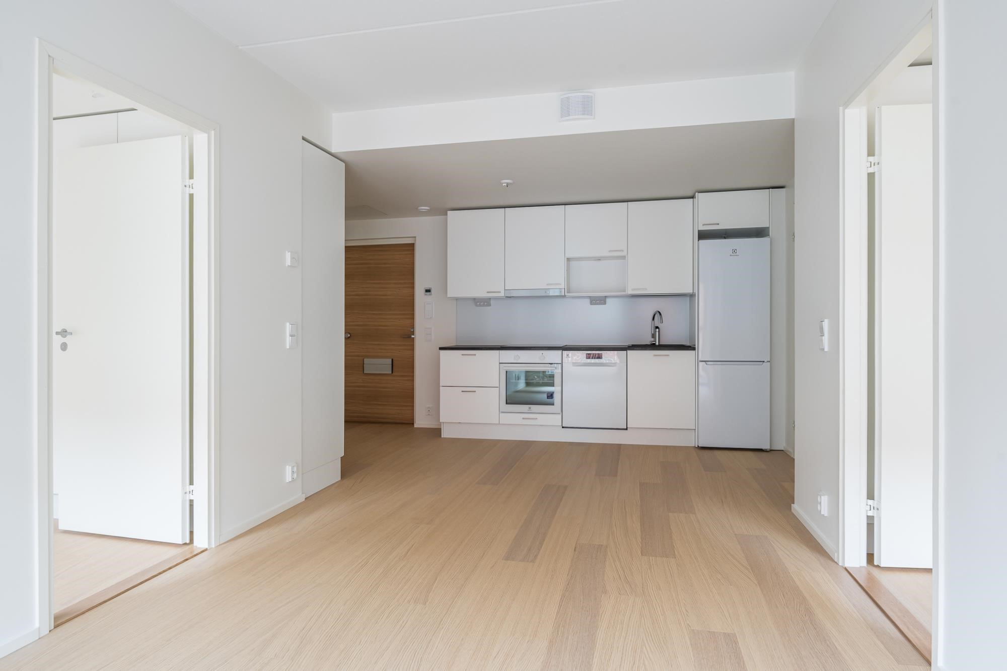 - Jääkaappipakastin, induktioliesitaso, liesikupu, astianpesukone, kaapistot, kiinteät valaisimet. Tilavaraus mikroaaltouunille.Työpöytätasot ovat laminaattipintaisia, välitilassa laminaatti. Keittiön altaat ovat komposiittia ja tasoon upotettuja. Huoneiston koosta riippuen liesitaso Domino tai 60 cm, astianpesukone 45 cm tai 60 cm.