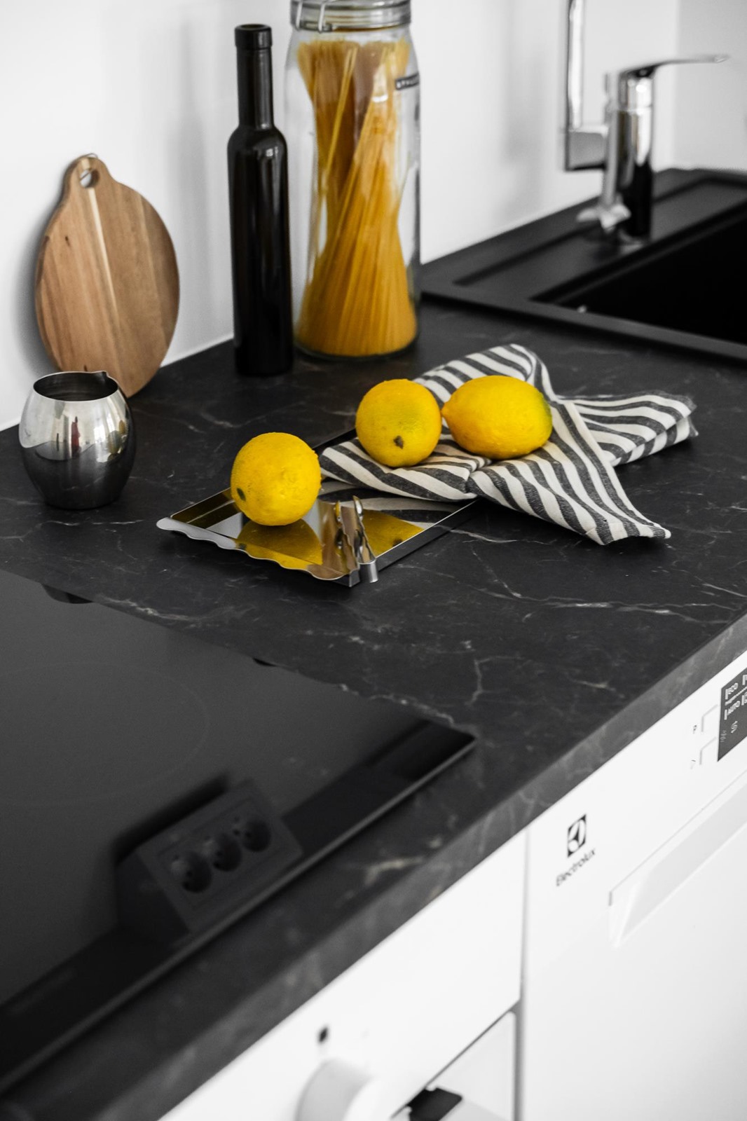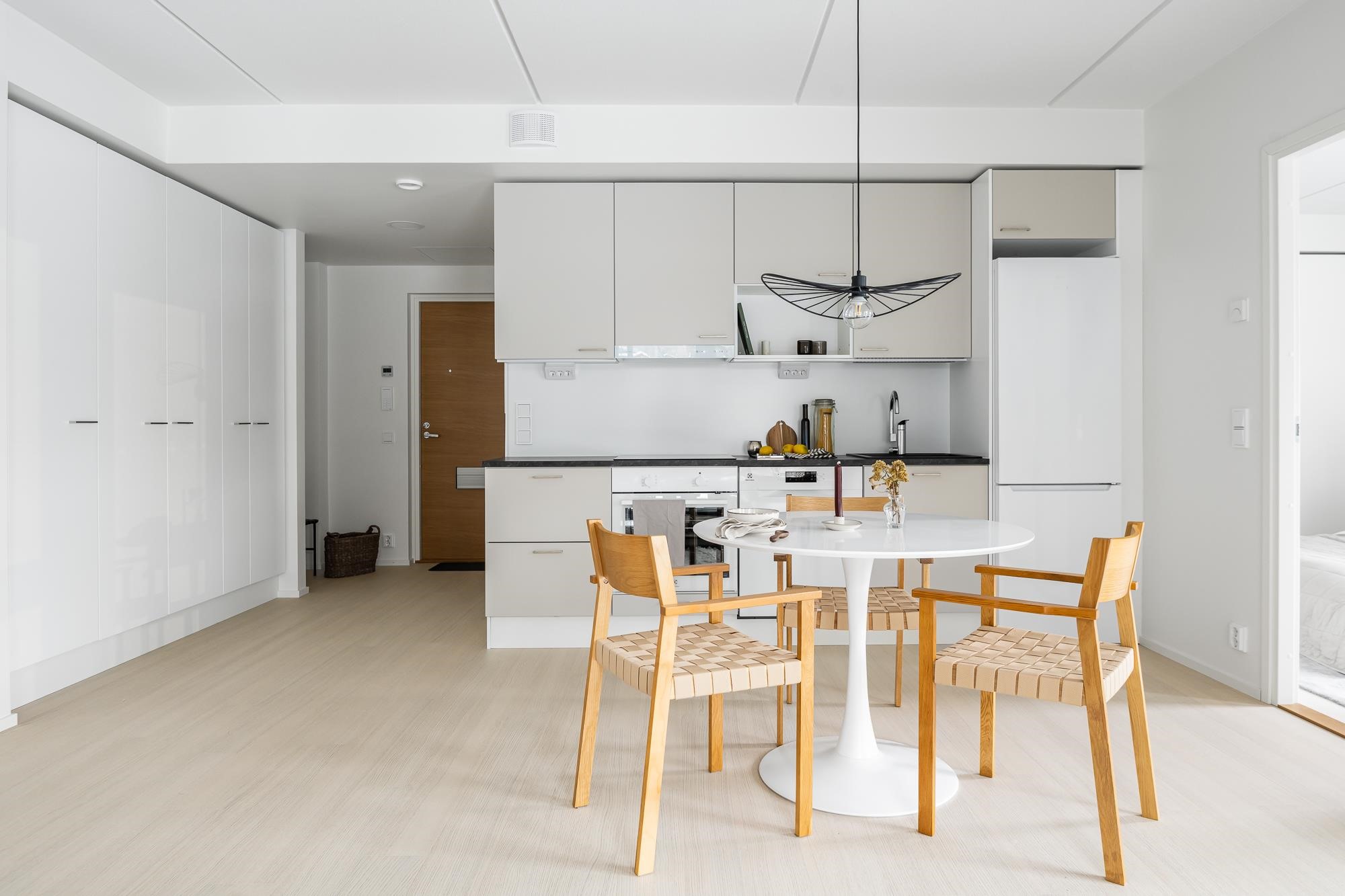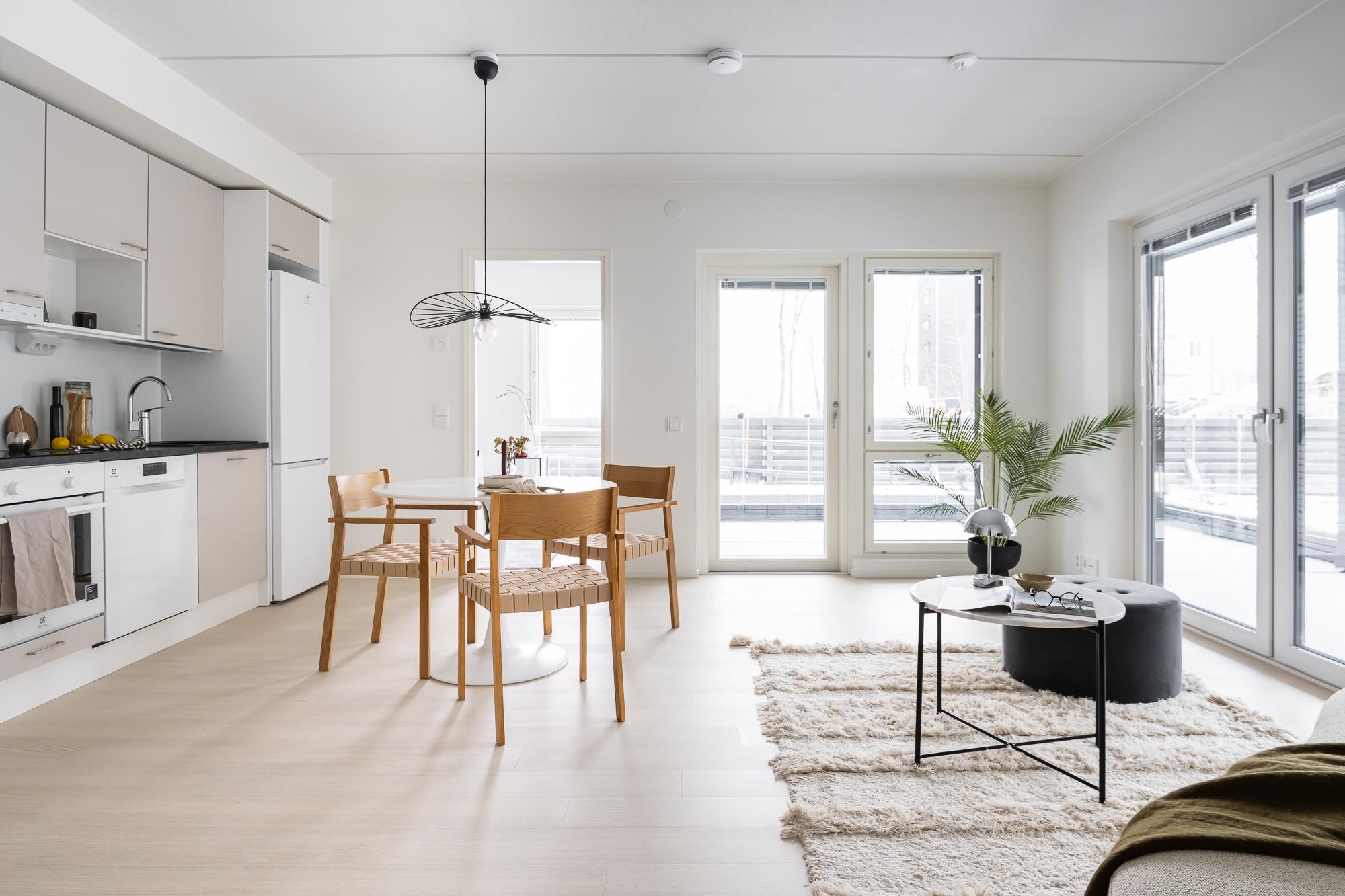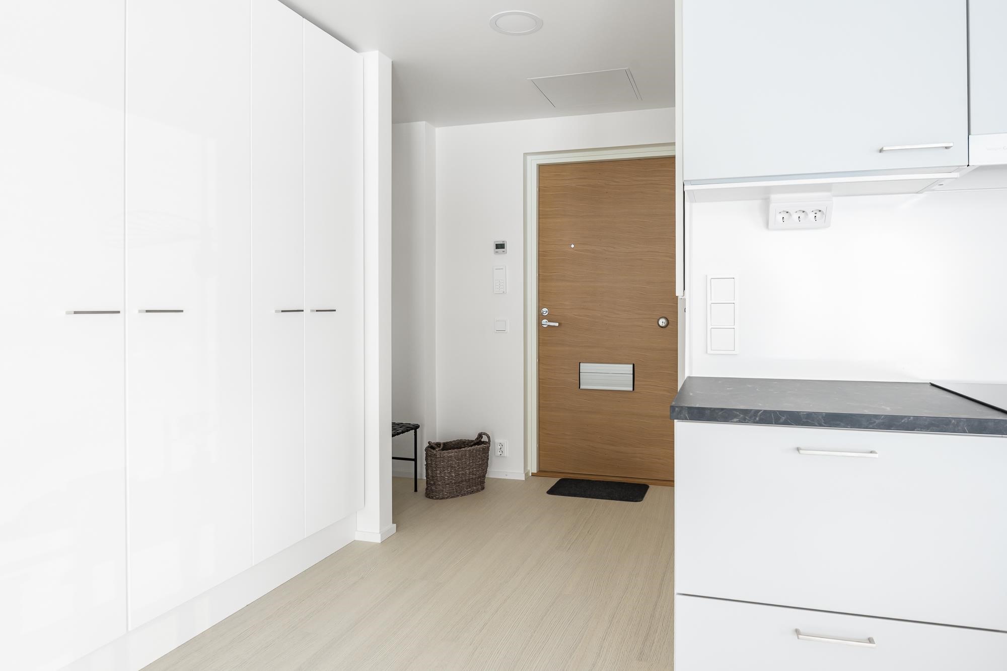 - Jääkaappipakastin, induktioliesitaso, liesikupu, astianpesukone, kaapistot, kiinteät valaisimet. Tilavaraus mikroaaltouunille.Työpöytätasot ovat laminaattipintaisia, välitilassa laminaatti. Keittiön altaat ovat komposiittia ja tasoon upotettuja. Huoneiston koosta riippuen liesitaso Domino tai 60 cm, astianpesukone 45 cm tai 60 cm.
