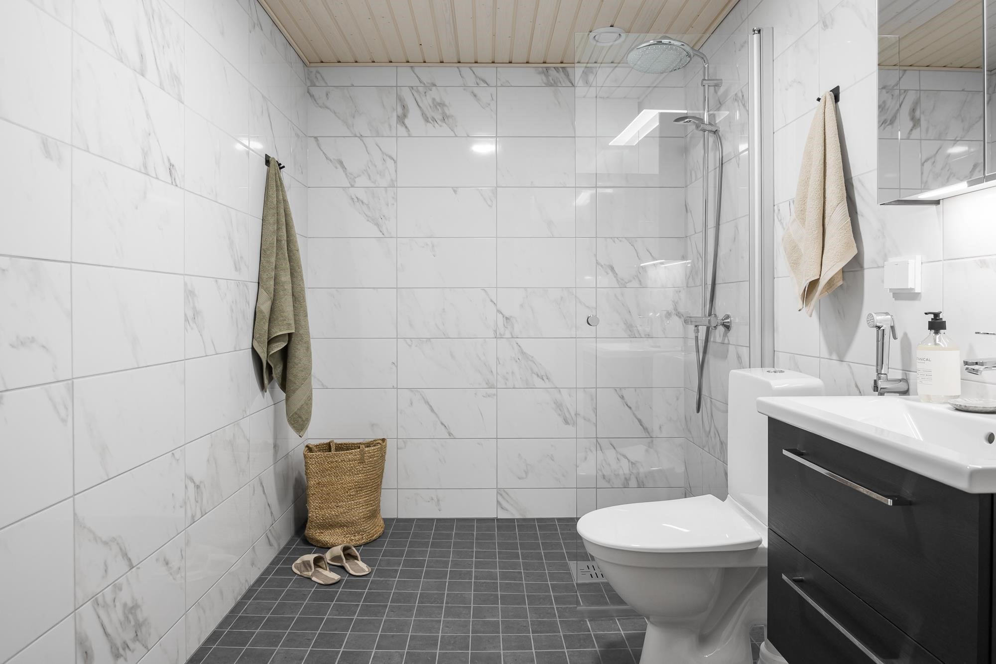 - Kylpyhuoneessa suihku (suihkunurkka tai suihkuseinä), valaisinpeilikaappi, allaslaatikosto. Pesukoneliitäntä, tilavaraus pyykinpesukoneelle ja kuivausrummulle. Mukavuuslattialämmitys (sähkö huoneiston sähköstä). Kiinteät valaisimet. Huoneistoissa missä sauna, sähkökiuas ja kokolasiovi.
