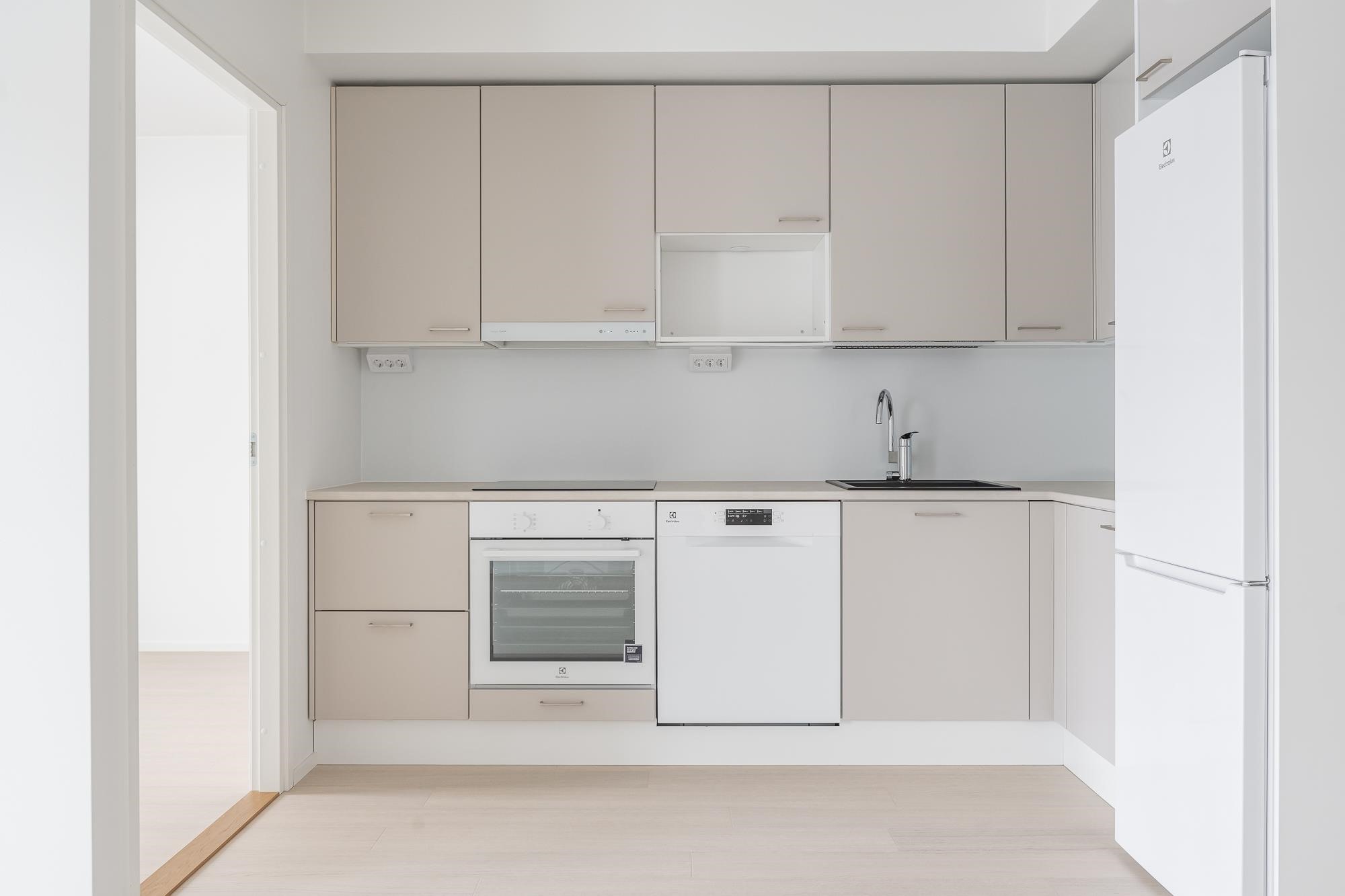 - Jääkaappipakastin, induktioliesitaso, liesikupu, astianpesukone, kaapistot, kiinteät valaisimet. Tilavaraus mikroaaltouunille.Työpöytätasot ovat laminaattipintaisia, välitilassa laminaatti. Keittiön altaat ovat komposiittia ja tasoon upotettuja. Huoneiston koosta riippuen liesitaso Domino tai 60 cm, astianpesukone 45 cm tai 60 cm.