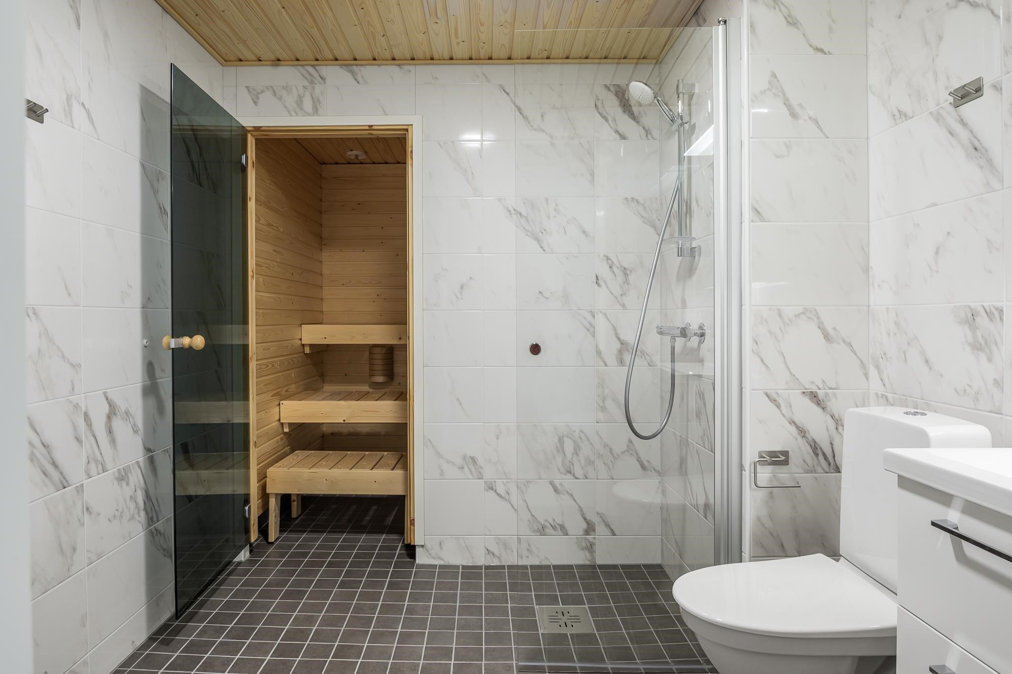 - Kylpyhuoneessa suihku (suihkunurkka tai suihkuseinä), valaisinpeilikaappi, allaslaatikosto. Pesukoneliitäntä, tilavaraus pyykinpesukoneelle ja kuivausrummulle. Mukavuuslattialämmitys (sähkö huoneiston sähköstä). Kiinteät valaisimet. Huoneistoissa missä sauna, sähkökiuas ja kokolasiovi.
