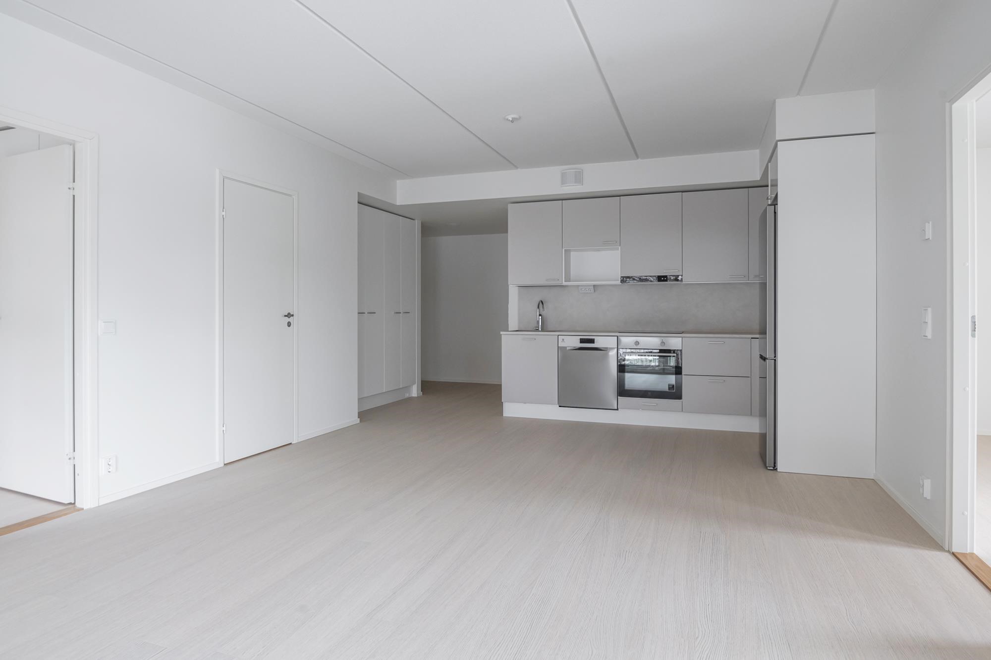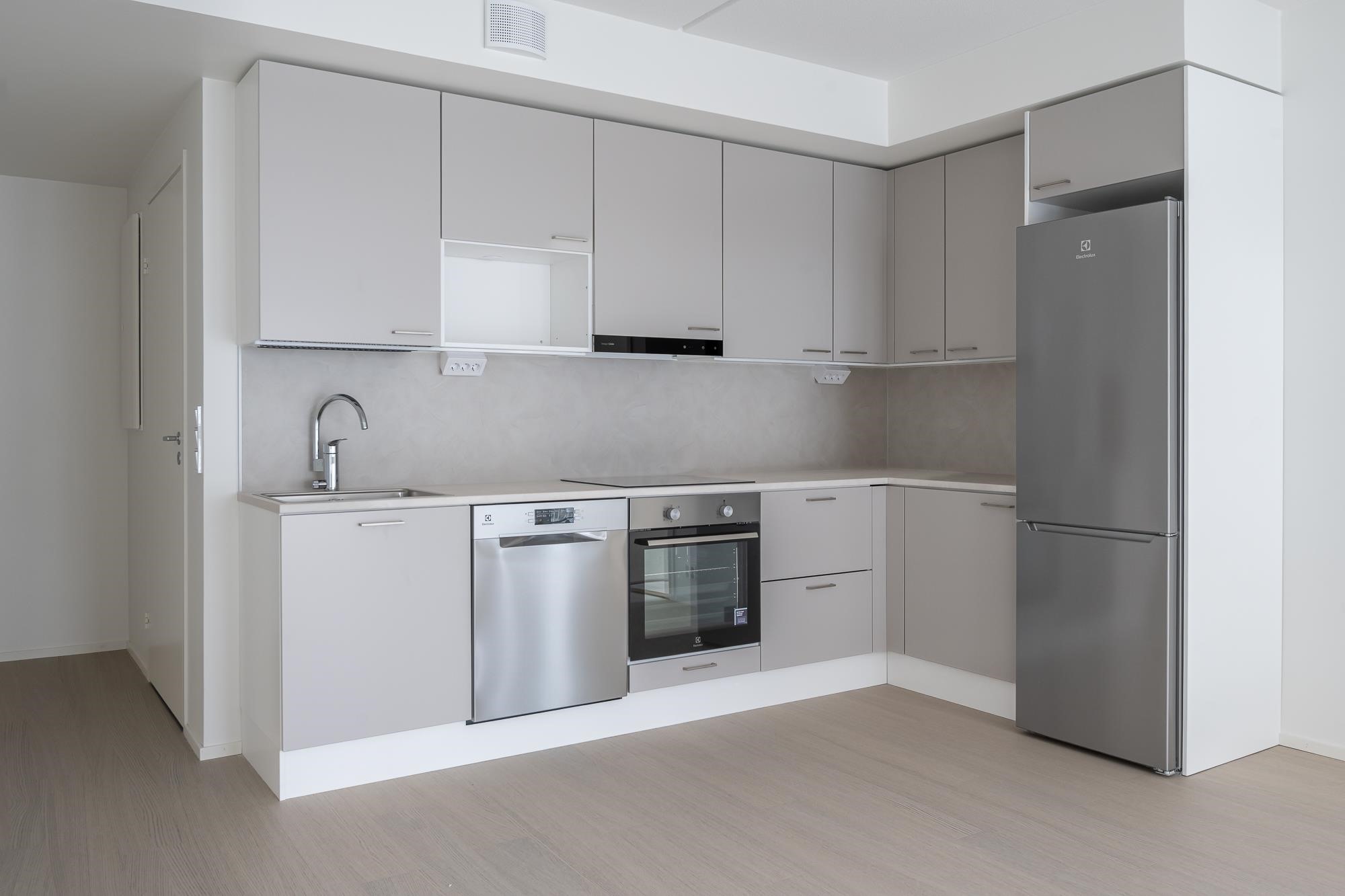 - Jääkaappipakastin, induktioliesitaso, liesikupu, astianpesukone, kaapistot, kiinteät valaisimet. Tilavaraus mikroaaltouunille.Työpöytätasot ovat laminaattipintaisia, välitilassa laminaatti. Keittiön altaat ovat komposiittia ja tasoon upotettuja. Huoneiston koosta riippuen liesitaso Domino tai 60 cm, astianpesukone 45 cm tai 60 cm.
