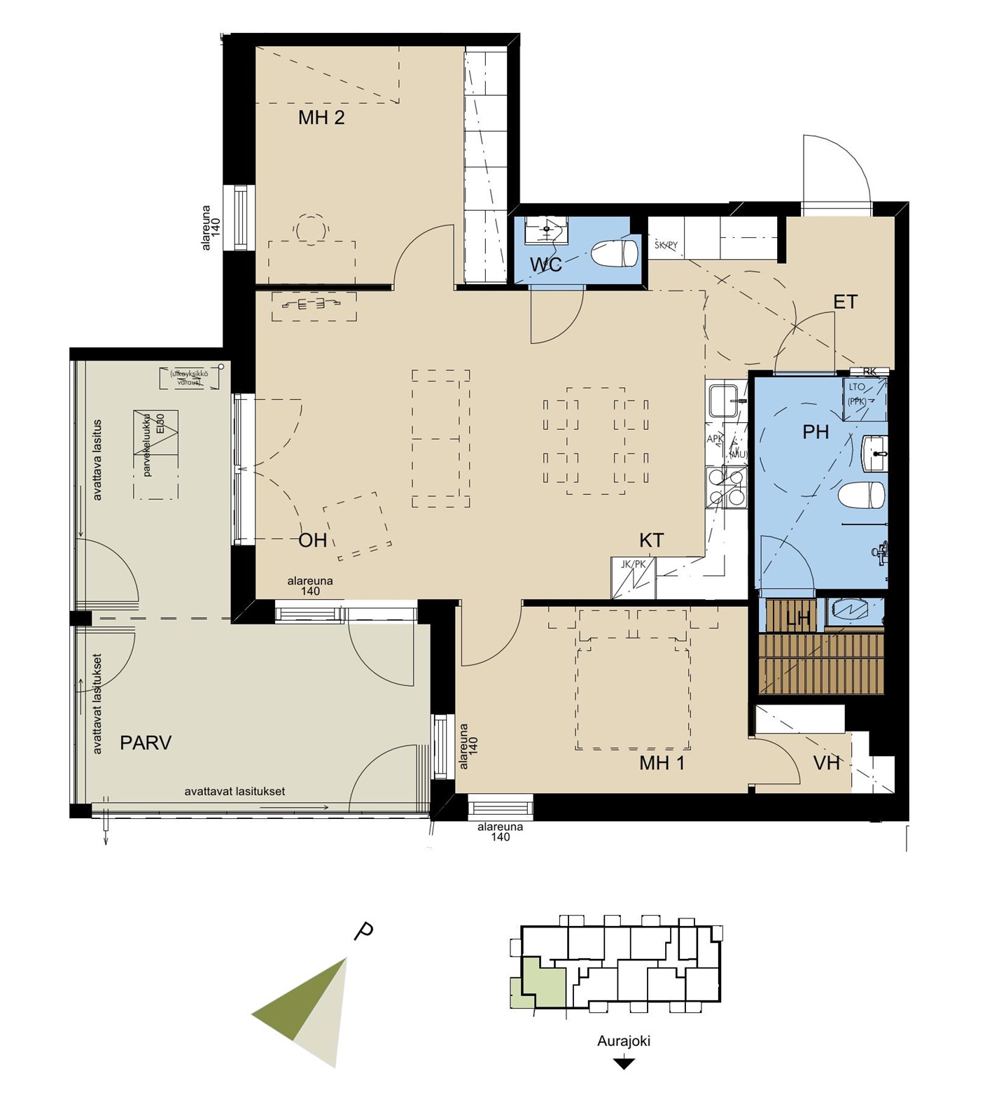 - Parveke varustetaan harmaalla terassimatolla. Parvekekaiteet ovat metalli-runkoisia lasikaiteita. Parvekkeet varustetaan lasituksella, lasin sävy kirkas. Kokonaan lasitettu parveke on tuulettuvaa ulkotilaa, se ei ole vesi- tai lumitiivis tila.